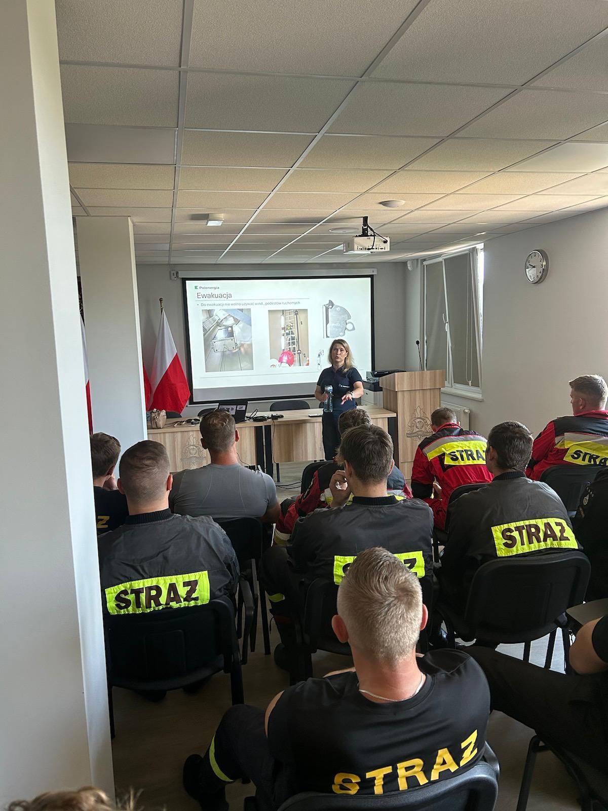 Tematem ćwiczenia praktycznego na farmie wiatrowej było dotarcie, kwalifikowana pierwsza pomoc oraz ewakuacja osoby poszkodowanej z przestrzeni gondoli turbiny wiatrowej.