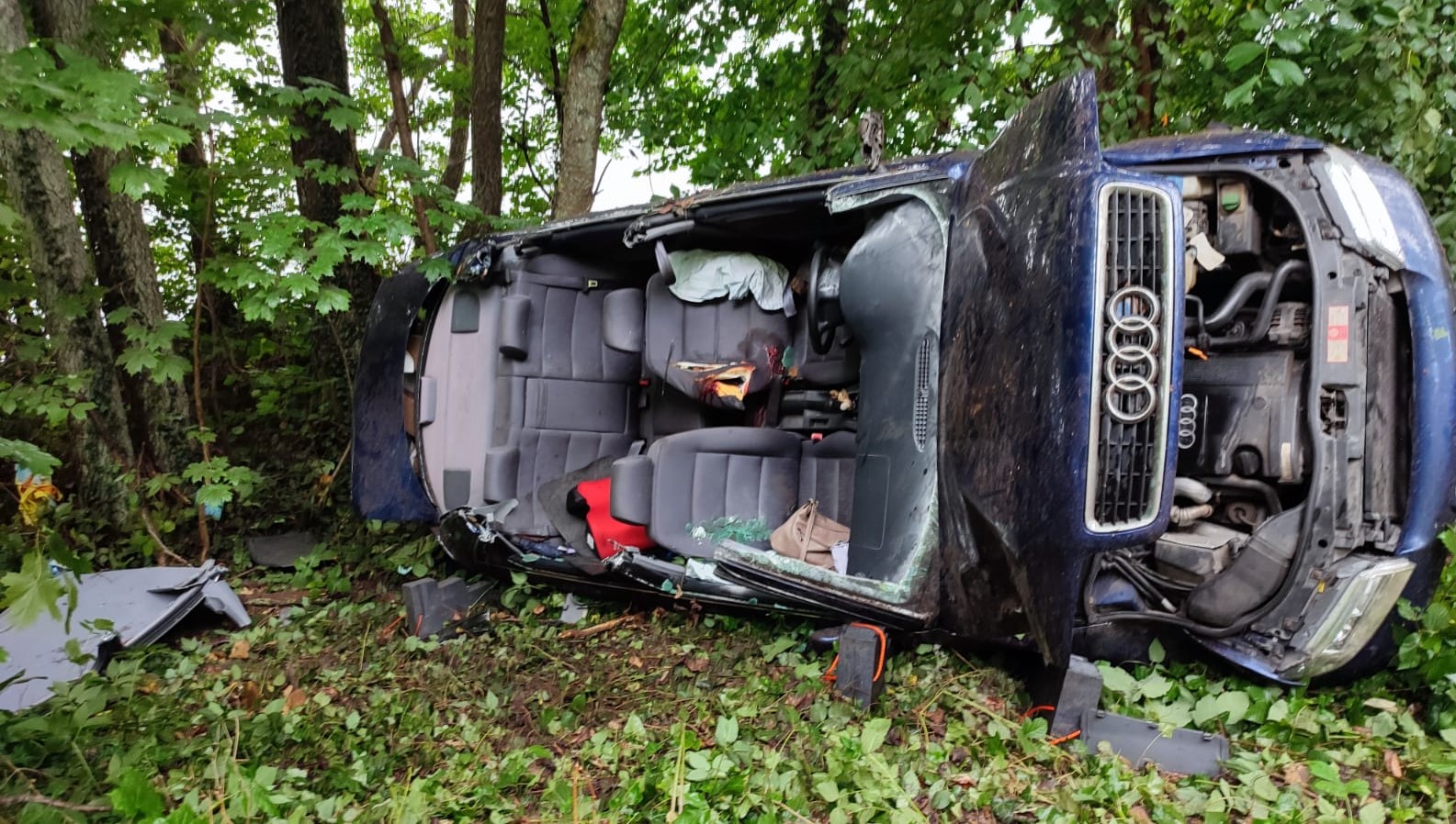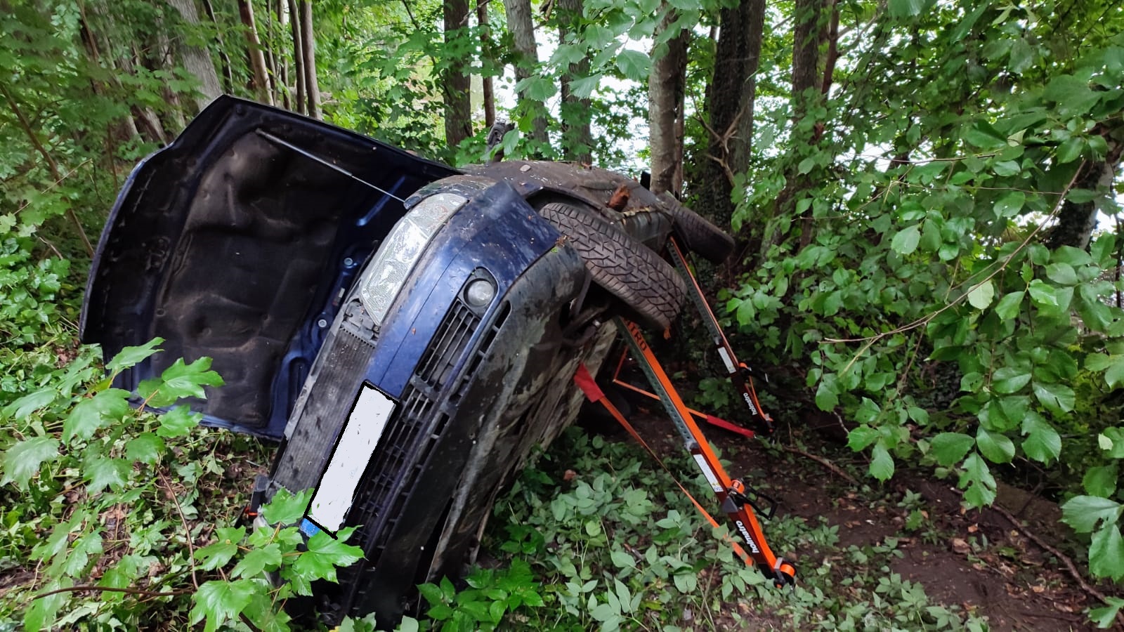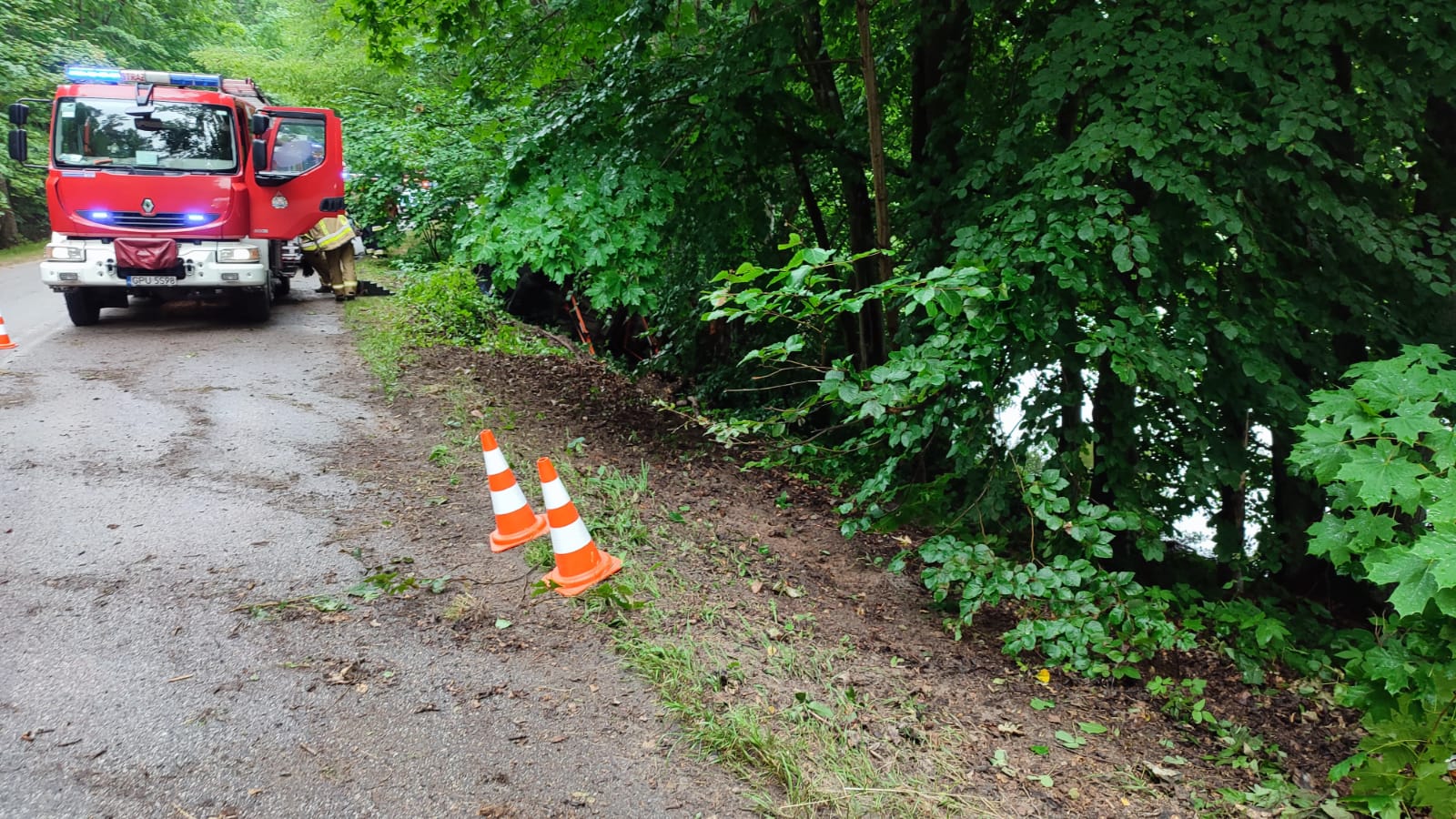 Po przybyciu na miejsce zdarzenia zastępów stwierdzono, że na drodze DW 218 na wysokości jeziora Dobrego, samochód osobowy uderzył w przydrożne drzewa i leży na prawym boku. W pojeździe znajdowała się kierująca pojazdem, przytomna. Niestety była uwięziona, a dodatkowo jej ciało zostało przebite sporych rozmiarów konarem. W trakcie działań na miejsce przybył Zespół Ratownictwa Medycznego (ZRM) oraz przyleciało Lotnicze Pogotowie Ratunkowe (LPR).