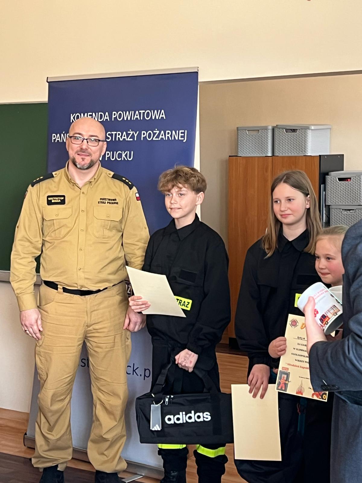 Po zakończeniu rywalizacji nagrody oraz dyplomy wręczył Zastępca Komendanta Powiatowego PSP w Pucku, kpt. Krzysztof Minga. Komendant podkreślił, że zarówno wysoka frekwencja, jak i ogromne zaangażowanie uczestników świadczą o rosnącym zainteresowaniu tematyką pożarniczą wśród dzieci i młodzieży. Zwrócił uwagę na to, jak istotne jest promowanie wiedzy o zagrożeniach pożarowych, ponieważ przyczynia się to do kształtowania odpowiedzialnych postaw i lepszego przygotowania na sytuacje kryzysowe.