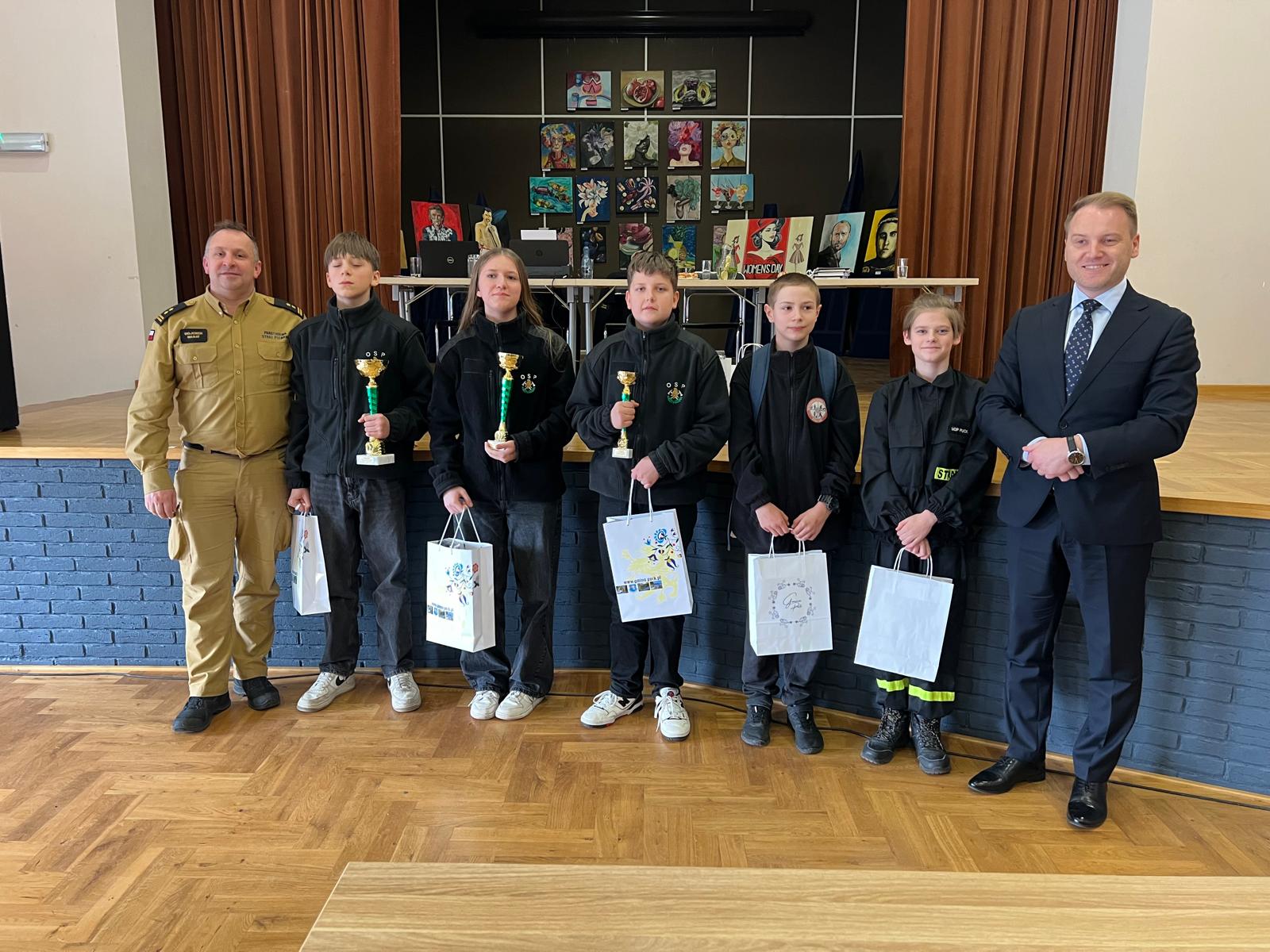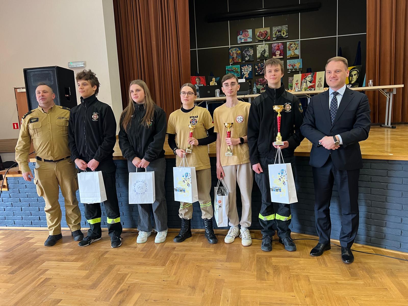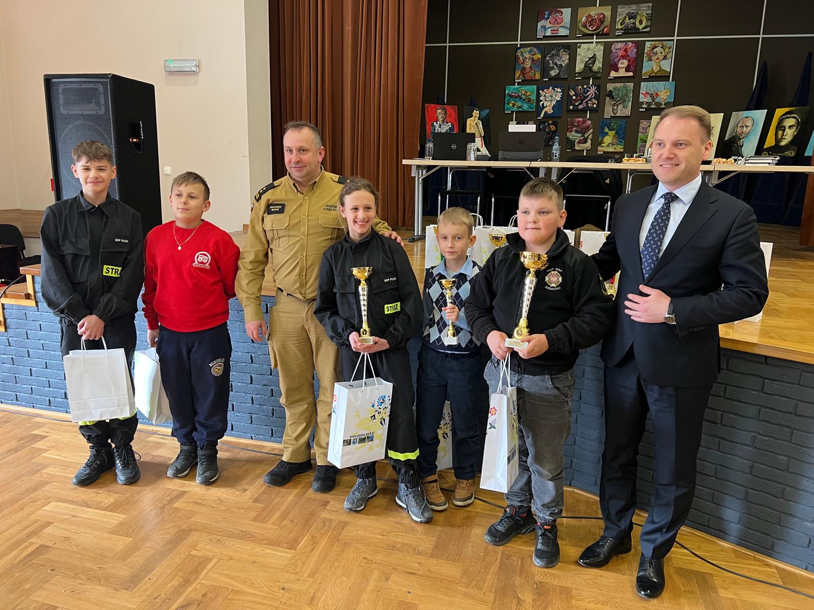 Puchary, dyplomy oraz nagrody rzeczowe wręczyli Komendant Powiatowy PSP w Pucku bryg. Wojciech Wanat oraz Wójt Gminy Puck Marcin Nikrant, którzy byli bardzo zadowoleni z wysokiej frekwencji i zaangażowania uczestników. Podkreślili, że tematyka pożarnicza cieszy się dużym zainteresowaniem wśród dzieci i młodzieży, co świadczy o rosnącej świadomości młodych ludzi. Zaznaczyli również, jak ważne jest promowanie wiedzy o bezpieczeństwie pożarowym, które przyczynia się do odpowiedzialności i lepszego przygotowania na ewentualne zagrożenia.