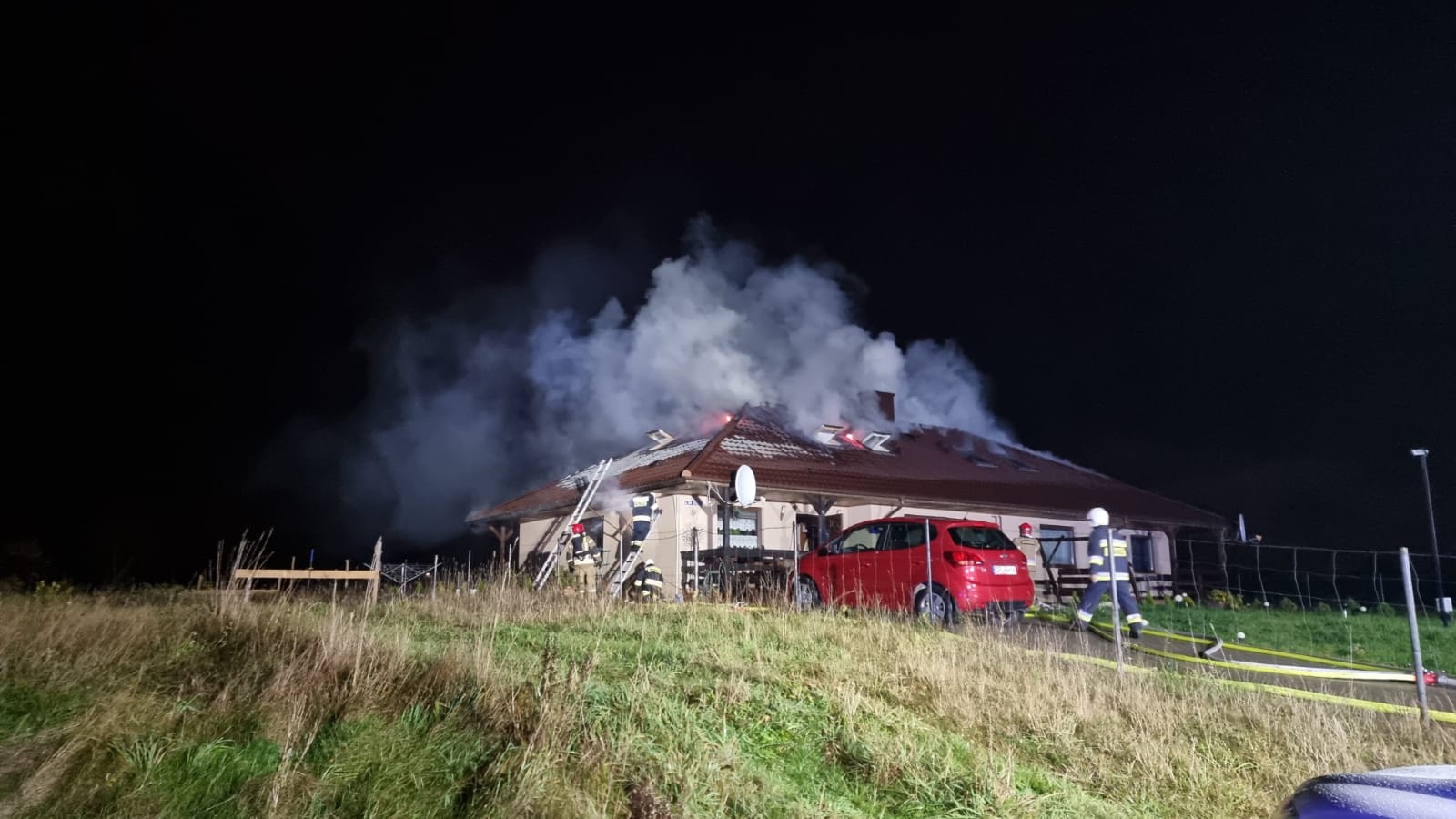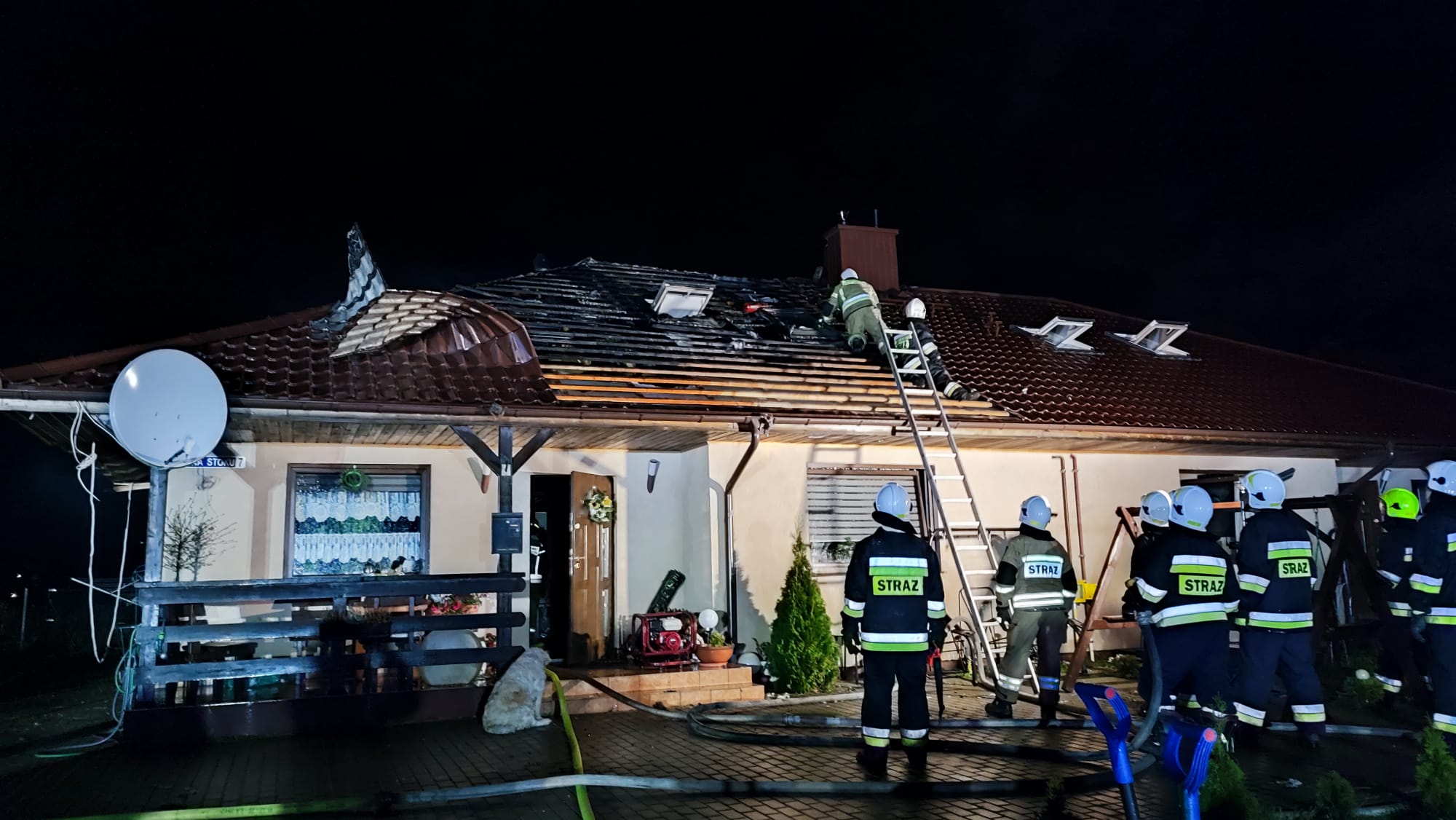 Po przyjeździe pierwszych jednostek ochrony przeciwpożarowej stwierdzono, że panuje zadymienie w salonie na parterze, a poddasze było objęte pożarem. Osoby zamieszkujące znajdowały się na zewnątrz, oprócz chorej starszej kobiety, którą strażacy musieli przenieść do sąsiedniego budynku.