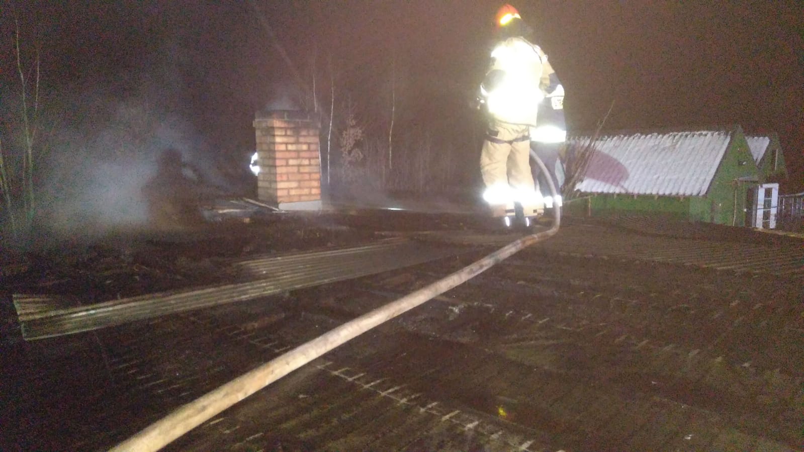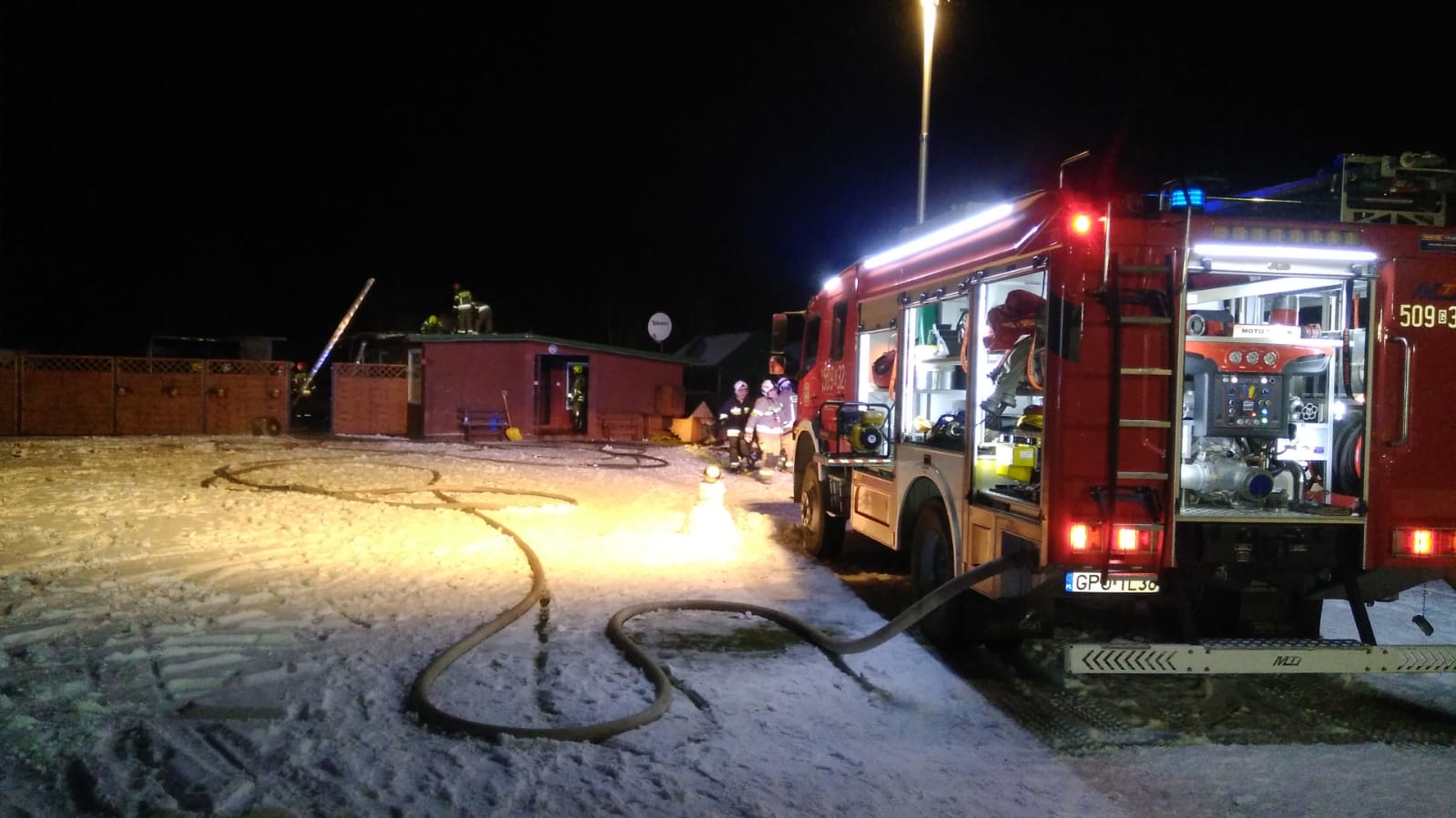 na budynek mieszkalny oraz palący się skład drewna, co doprowadziło do stłumienia pożaru. W dalszych działaniach rozebrano poszycie dachu i ściany części mieszkalnej w celu dogaszenia zarzewi ognia, a także zdemontowania ścian składu drewna. Budynek mieszkalny po zakończonych działaniach zabezpieczono plandeką.