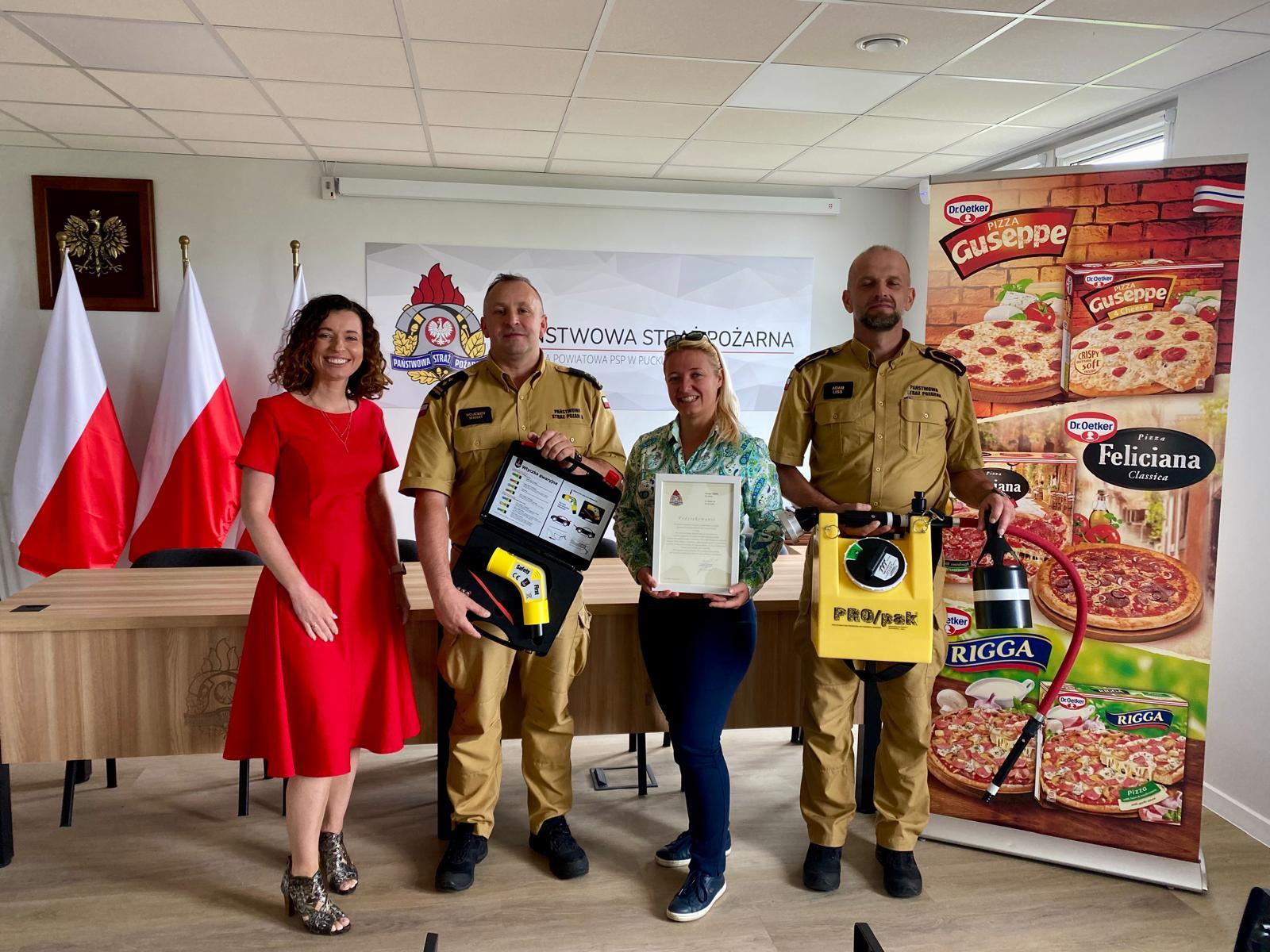 19 czerwca dzięki uprzejmości Dyrekcji Zakładu Dr Oetker Polska Sp. z o.o. oddział w Łebczu, Komenda Powiatowa Państwowej Straży Pożarnej w Pucku otrzymała wysokiej jakości sprzęt ratowniczo - gaśniczy. jest nim urządzenie PRO-PAK służące do podawania wysokiej jakości piany gaśniczej oraz urządzenie do odłączania zasilania, w coraz częściej pojawiających się na drogach, pojazdów o napędzie elektrycznym - Emergency Plug