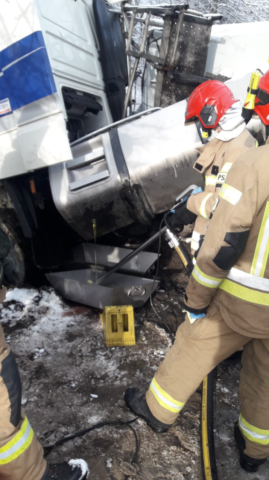 Działania straży polegały na zabezpieczeniu miejsca zdarzenia, zabezpieczeniu cieknącego zbiornika z paliwem. W związku z brakiem zmniejszania intensywności wypływu oleju napędowego poproszono o zadysponowanie zastępów posiadających sprzęt do przepompowania paliwa. Rozlane paliwo zabezpieczono sorbentem. Na miejsce zdarzenia dojechał zastęp z JRG Puck oraz specjalistyczna grupa ratownictwa chemiczno - ekologicznego z JRG 1 Gdynia. Działania grupy polegały na przepompowaniu paliwa do zapasowego zbiornika. Po zabraniu pojazdu oraz ładunku z drogi zebrano resztę olejów, oraz umyto jezdnie wodą.
