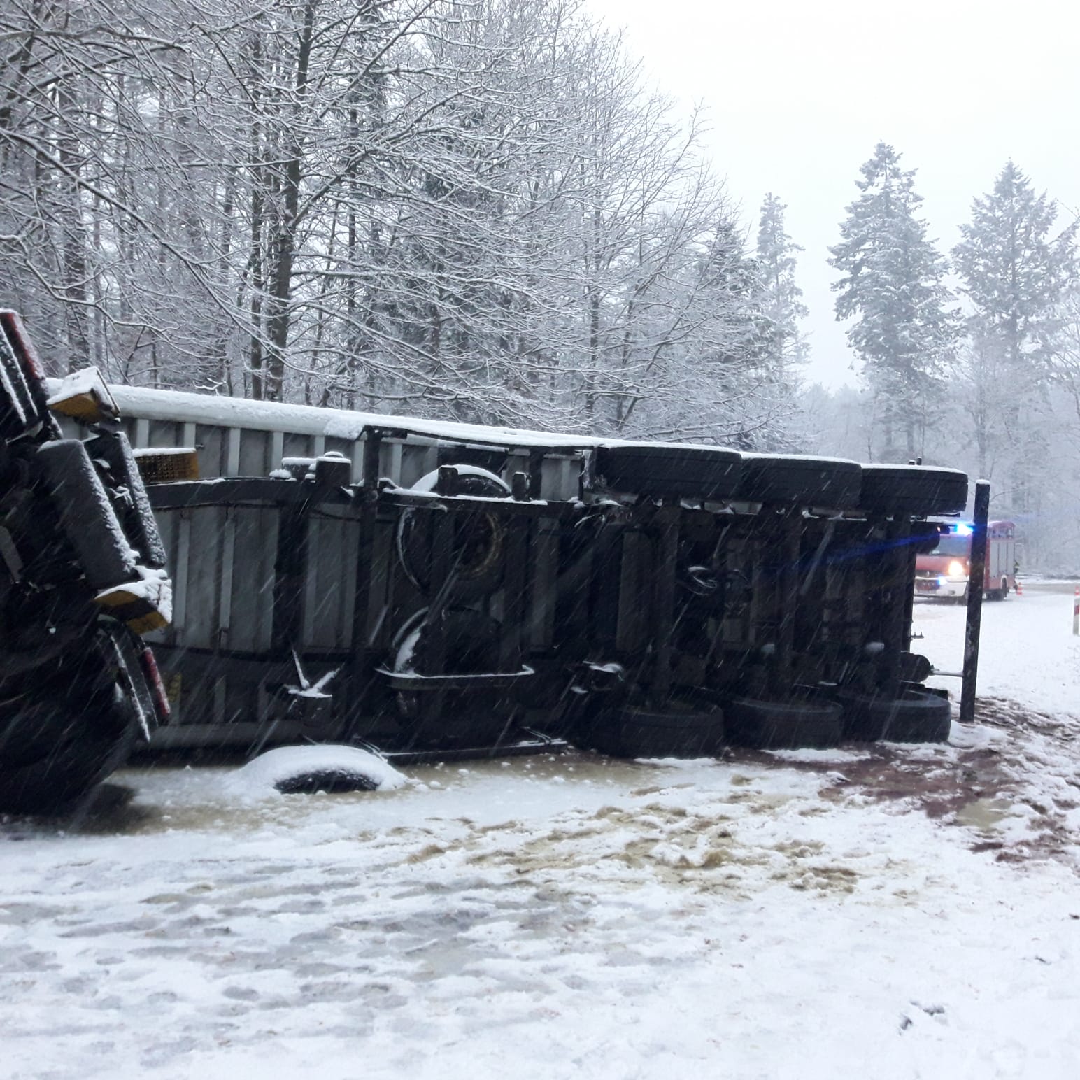 Po przybyciu na miejsce zdarzenia zastępu z OSP Karlikowo stwierdzono, że ciągnik siodłowy wraz z naczepą był przewrócony na boku. Naczepa leżała w poprzek drogi, a ciągnik siodłowy w rowie z uniesioną tylną częścią podwozia. W wyniku zdarzenia uszkodzeniu uległ zbiornik na olej napędowy, z którego wyciekało paliwo. Większość zawartości naczepy (świeża ryba) rozsypała się na drogę oraz do rowu. Droga wojewódzka była całkowicie zablokowana - Policja zorganizowała objazd.