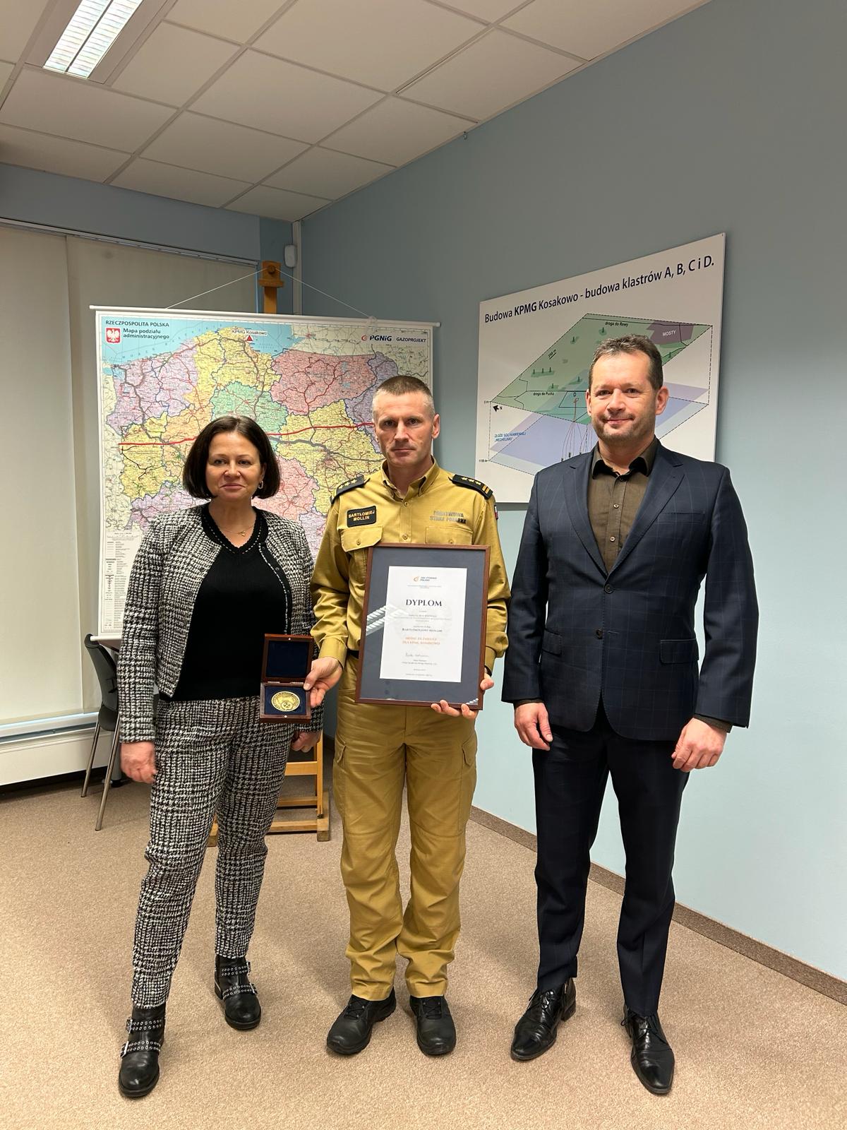 21 lutego 2024 r. roku komendant powiatowy PSP w Pucku st. bryg. Bartłomiej Mollin uczestniczył w spotkaniu zorganizowanym przez Panią Beatę Wittmann-Prezes Gas Storage Poland sp. z o.o. oraz Pana Pawła Kawalca-Kierownika Ruchu Zakładu Górniczego Otworowego, w którym otrzymał dyplom w uznaniu zasług dla rozwoju KPMG Kosakowo oraz medal za zasługi dla KPMG Kosakowo.