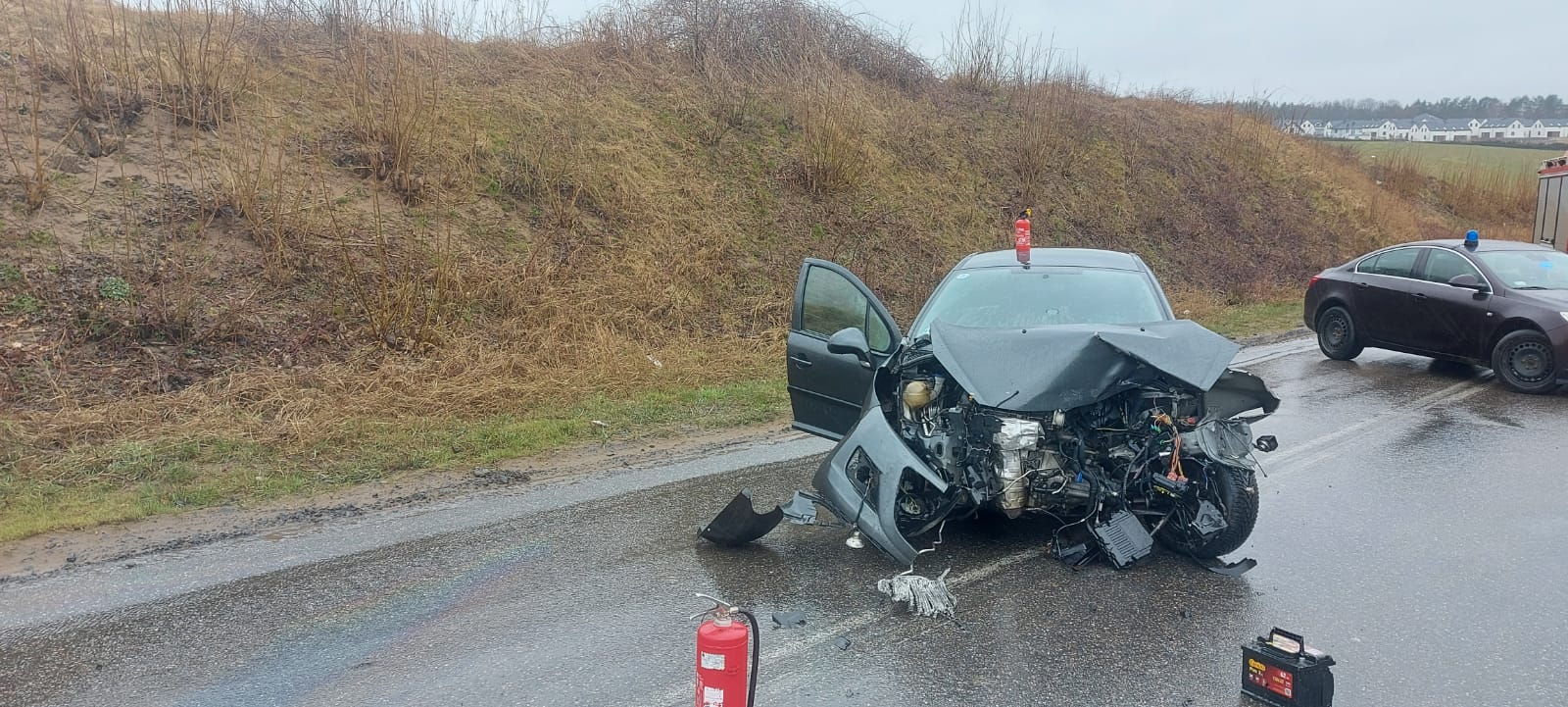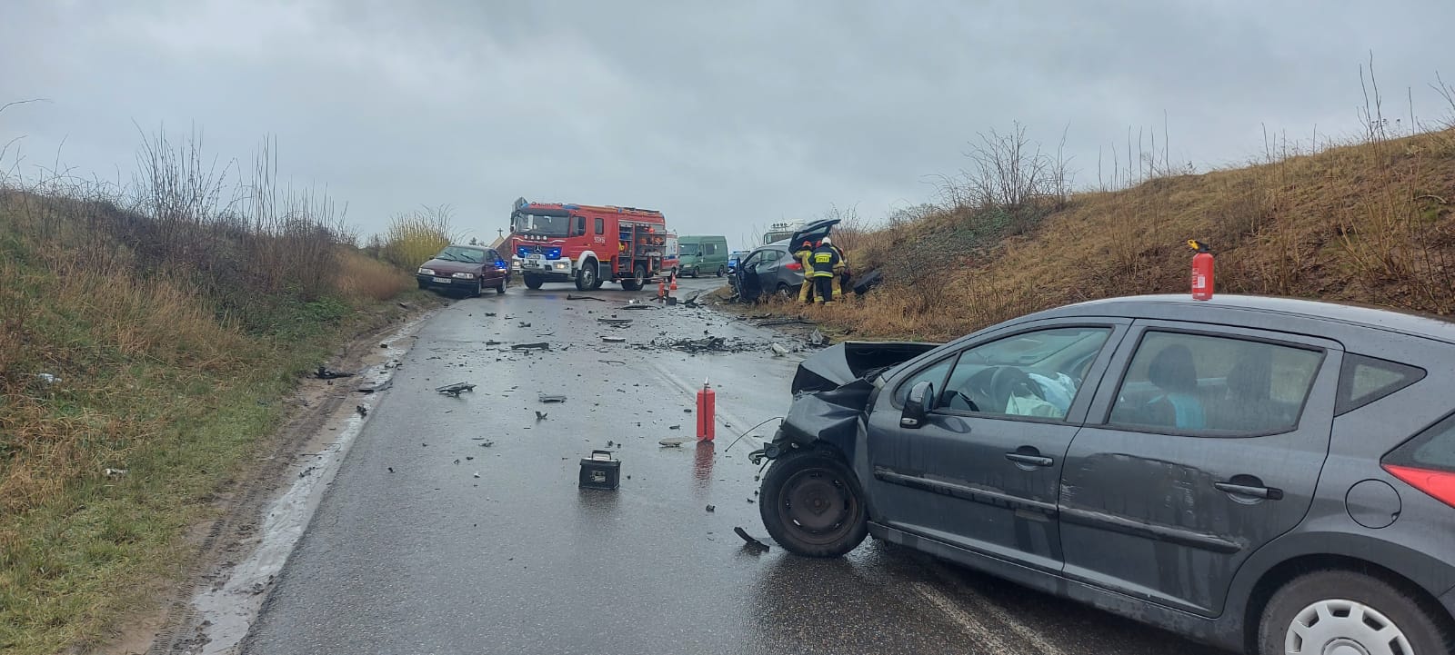 Po przybyciu na miejsce zdarzenia zastępów z OSP Kosakowo i JRG Puck stwierdzono, że na łuku drogi doszło do zderzenia dwóch samochodów osobowych. Uczestnicy trzy osoby znajdowały się na zewnątrz pojazdów- były przytomne. Droga była całkowicie zablokowana.