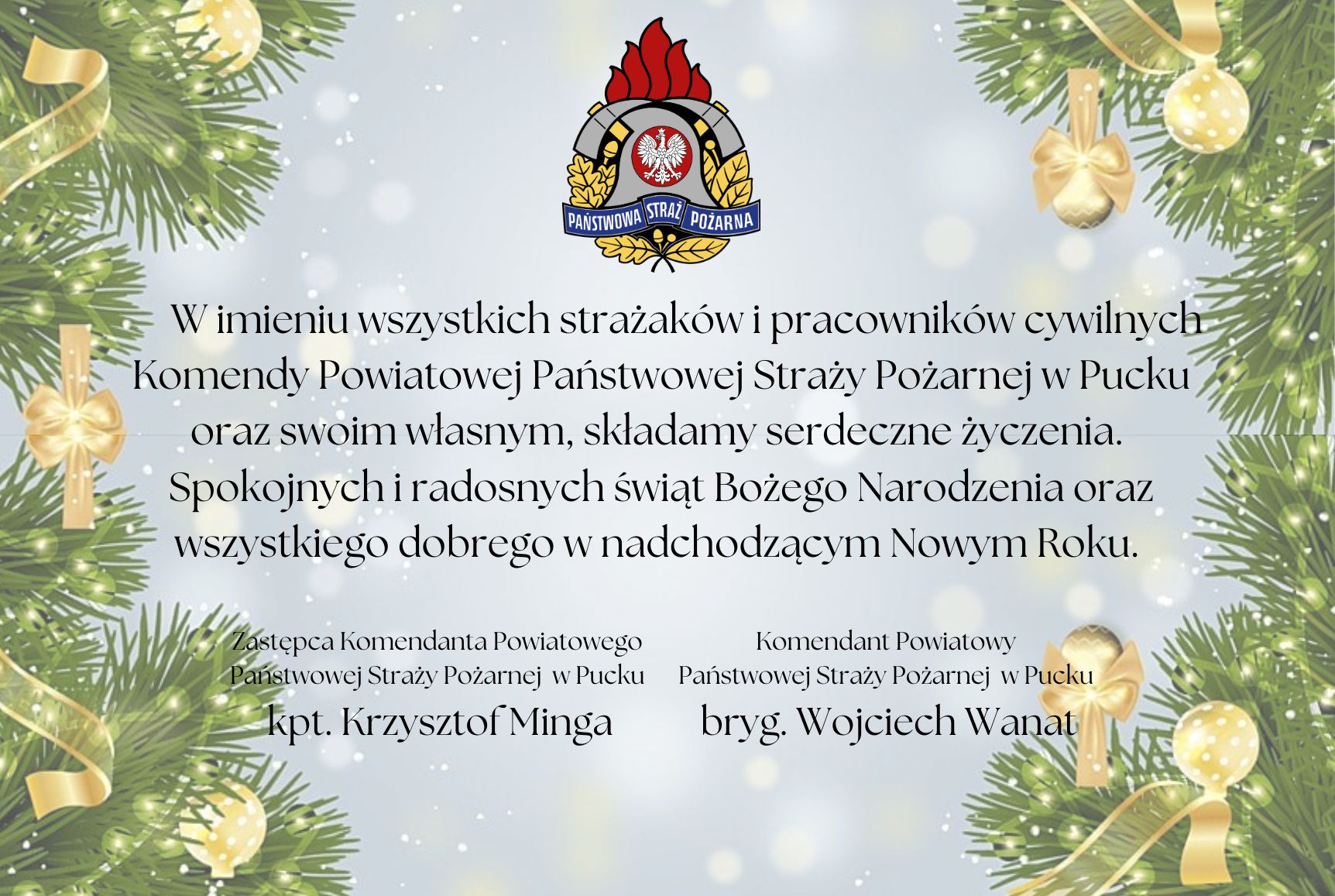 Życzenia Świąteczno-Noworoczne Kierownictwa Komendy Powiatowej PSP w Pucku 2024 24.12.2024 Zdjęcia (1) Pokaż zdjęcie 1 z galerii.