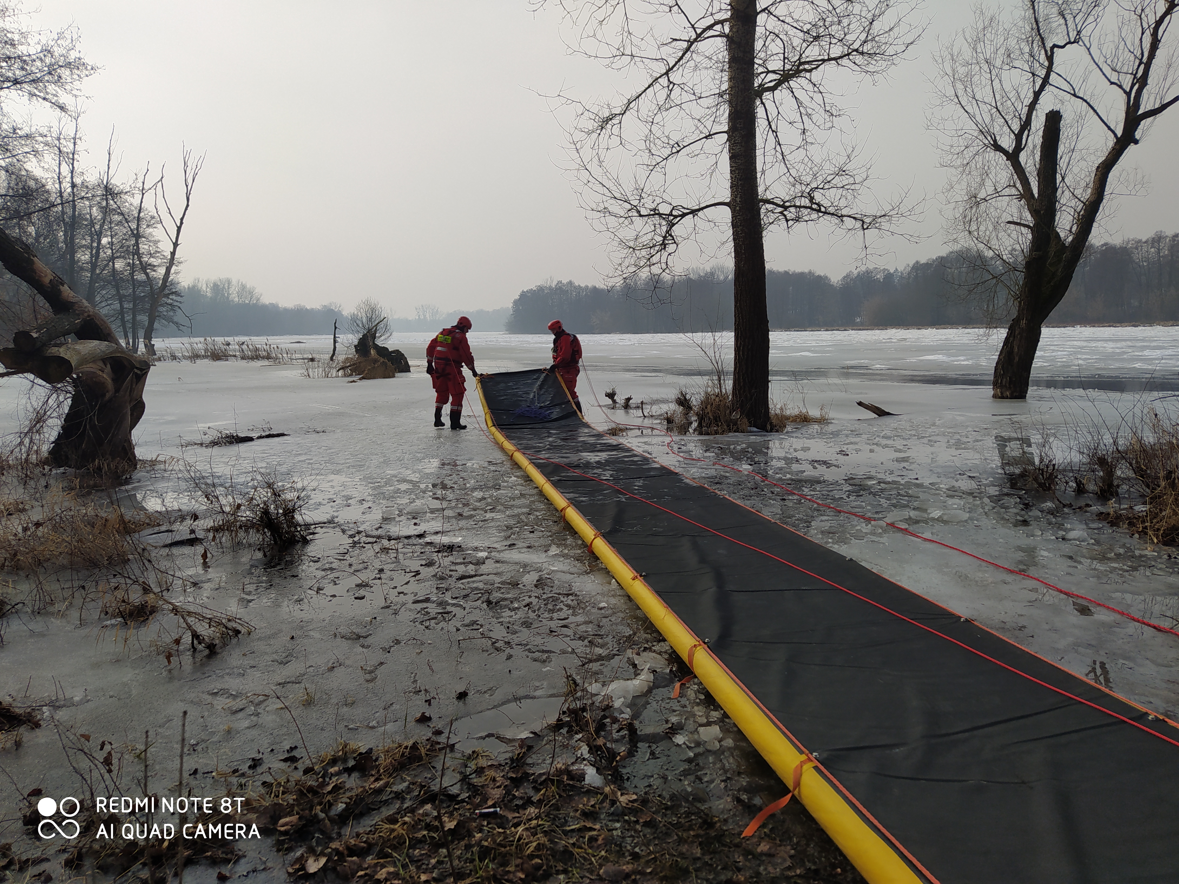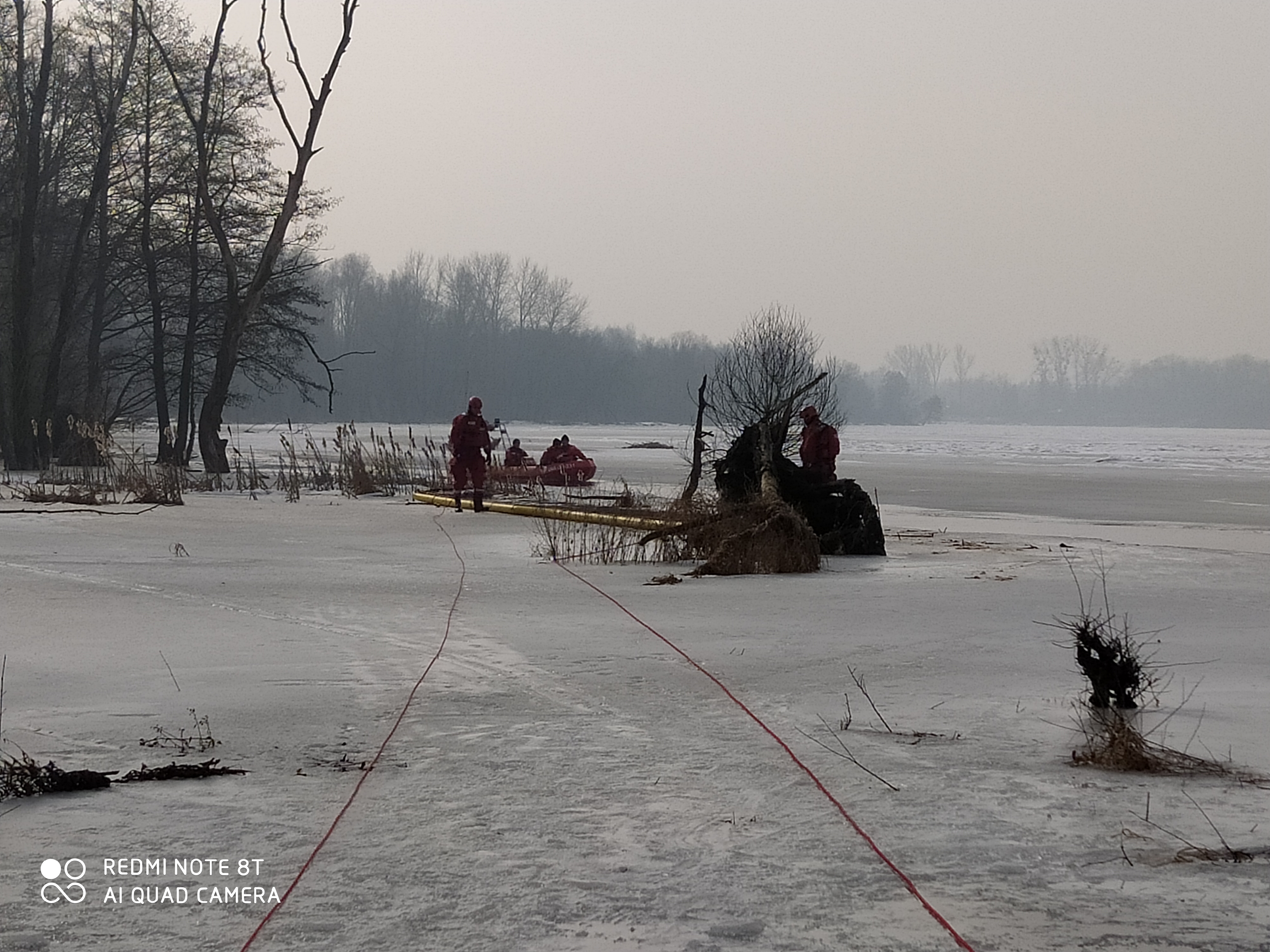 Trudne warunki jakie panują na miejscu działań w postaci szybkiego nurtu oraz spływającej kry znacznie utrudniają pracę.