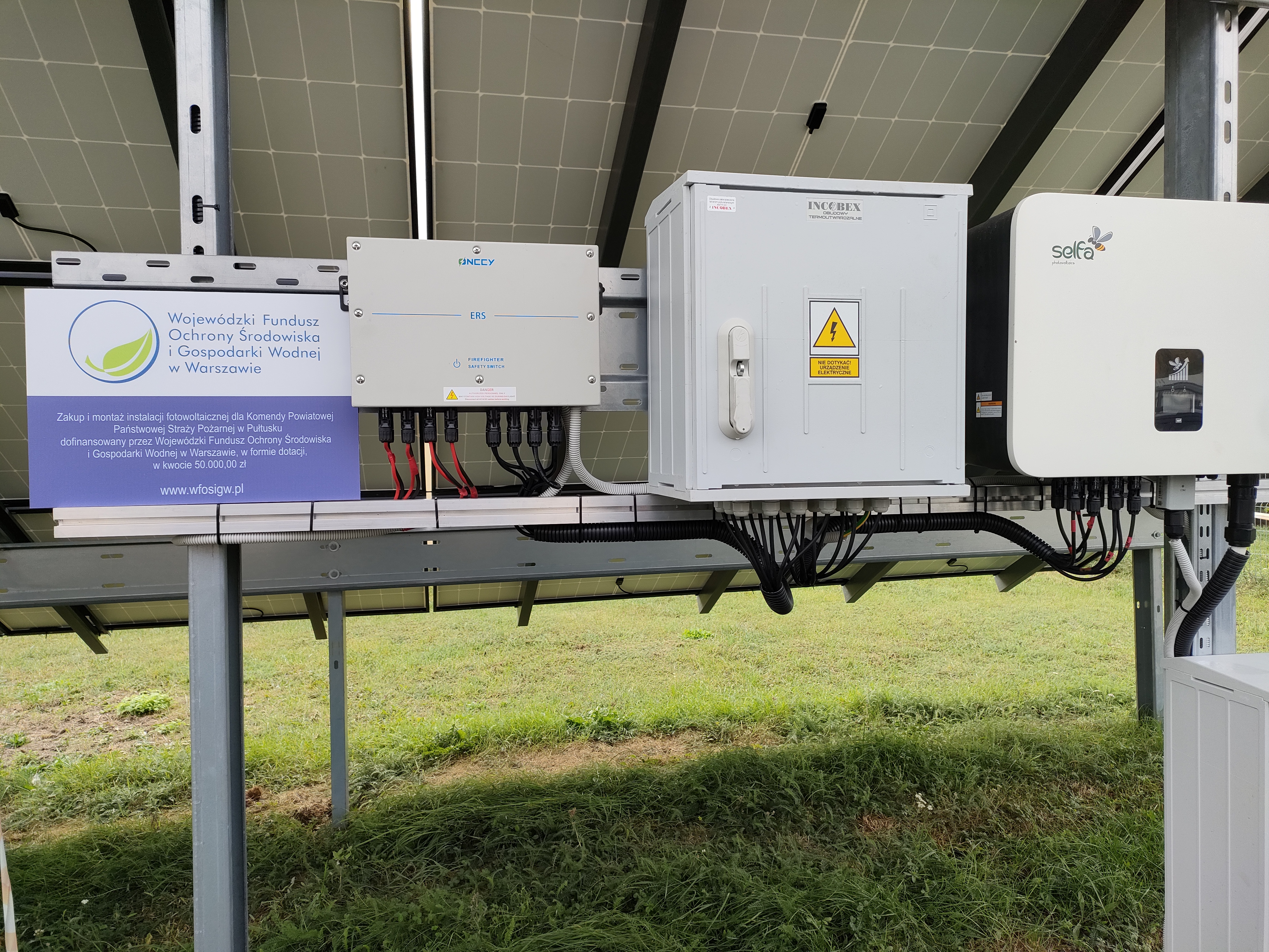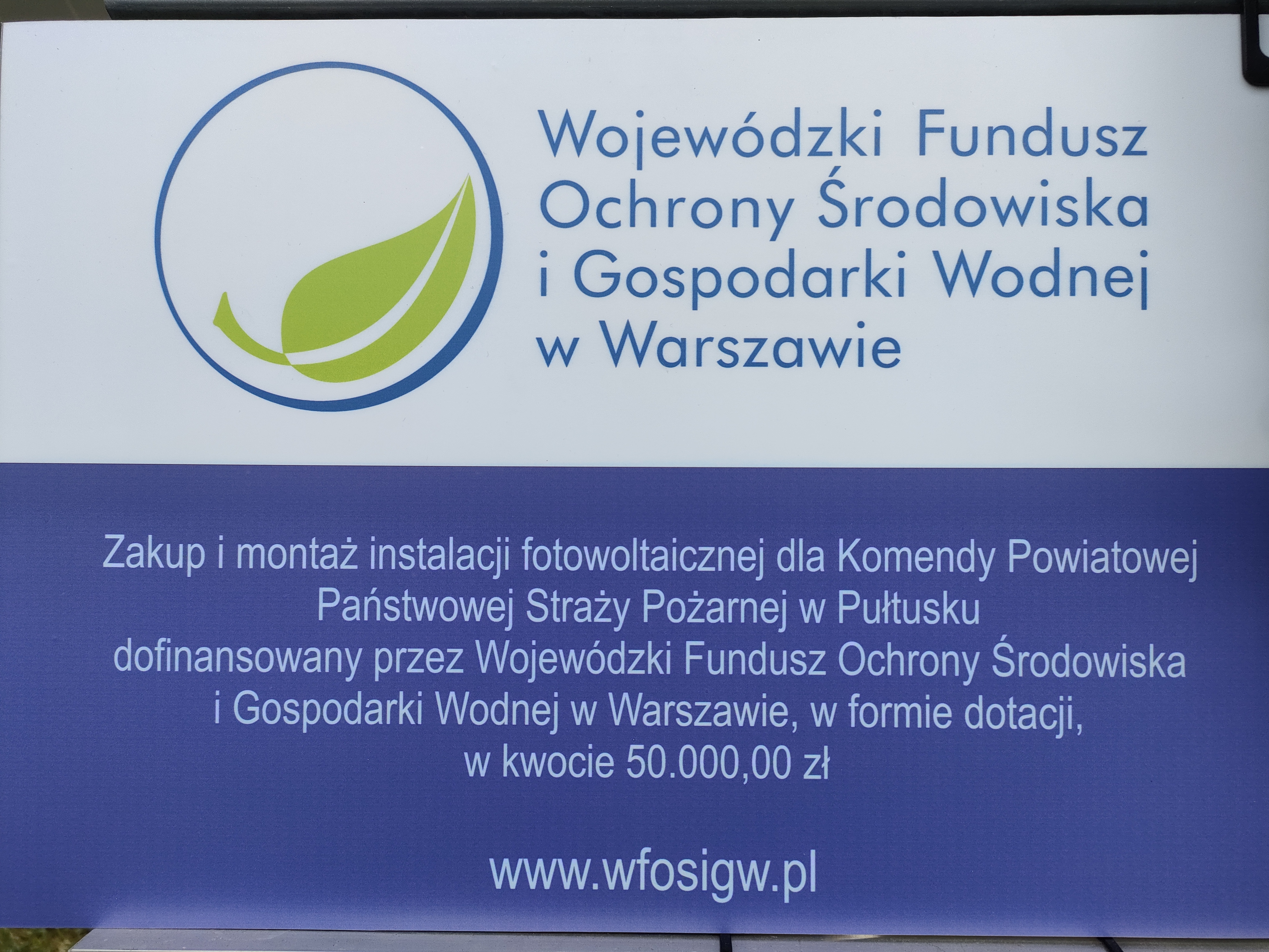 Zakup i montaż paneli fotowoltaicznych w Komendzie Powiatowej PSP w Pułtusku został dofinansowany przez Wojewódzki Fundusz Ochrony Środowiska i Gospodarki Wodnej w Warszawie w formie dotacji w kwocie 50 000 zł.