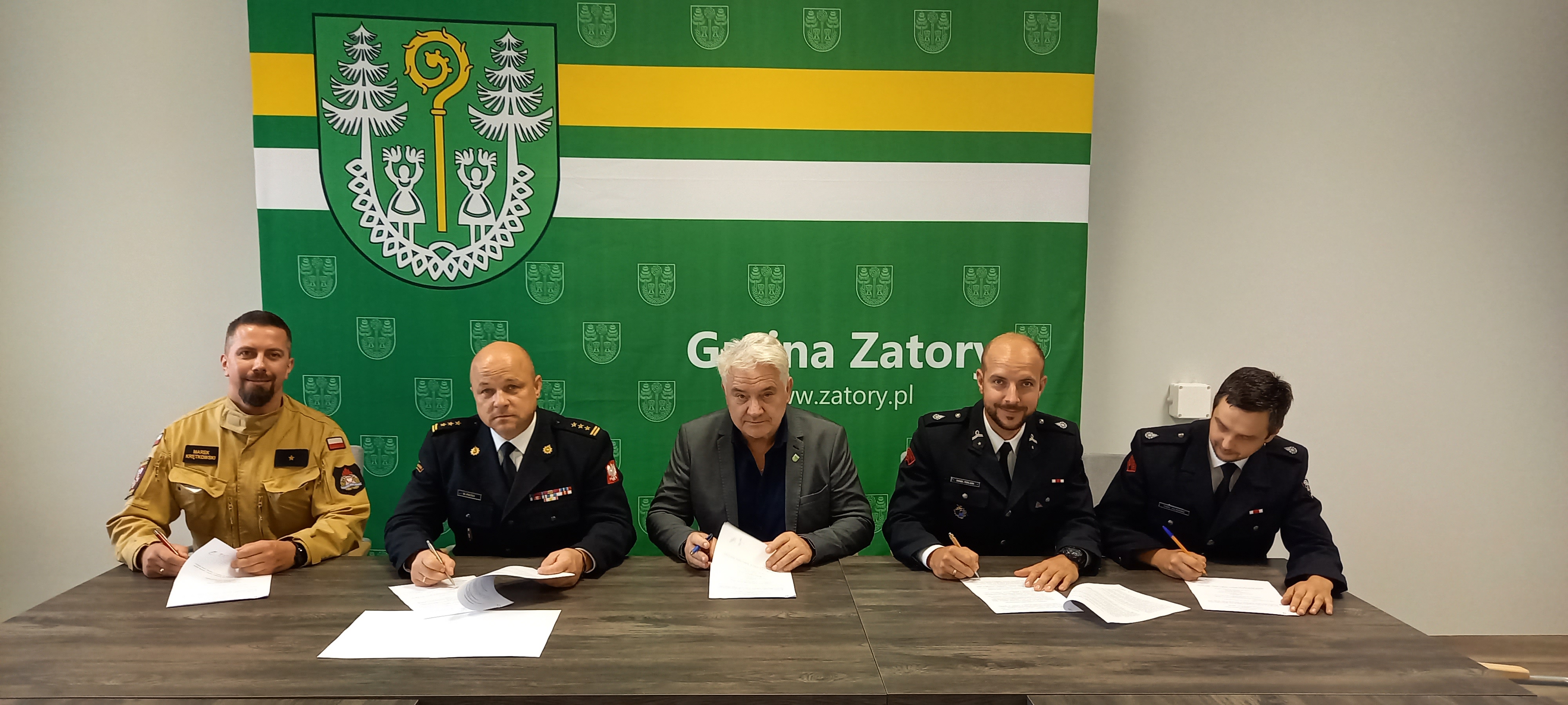 Dokument podpisali: Komendant Powiatowy PSP w Pułtusku st. bryg. Maciej Piątek, Wójt Gminy Zatory Włodzimierz Kaczmarczyk oraz Prezes OSP Drwały dh Daniel Podlasin.