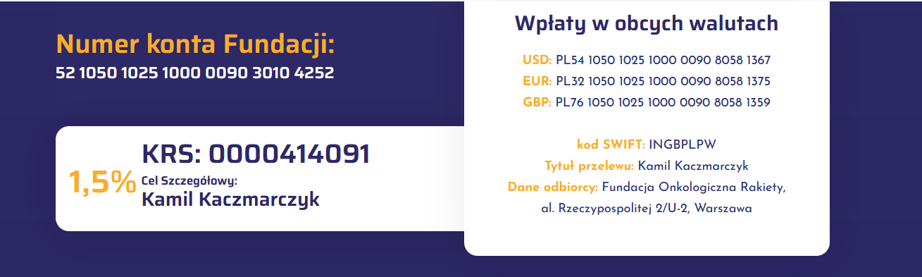 Wesprzeć Kamila możemy poprzez wpłatę na zbiórkę lub przekazanie mu 1,5% swojego podatku.