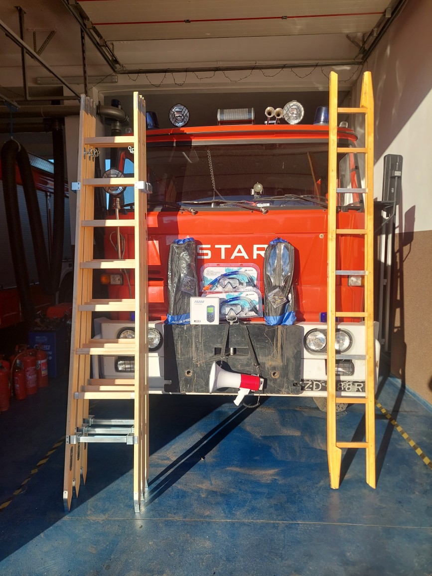 - Wydatki bieżące: aparaty powietrzne, hełmy strażackie, ubrania specjalne, rękawice specjalne, obuwie strażackie, armatura wodno-pianowa, wentylator oddymiający, drabiny, latarki, urządzenia pomiarowe.