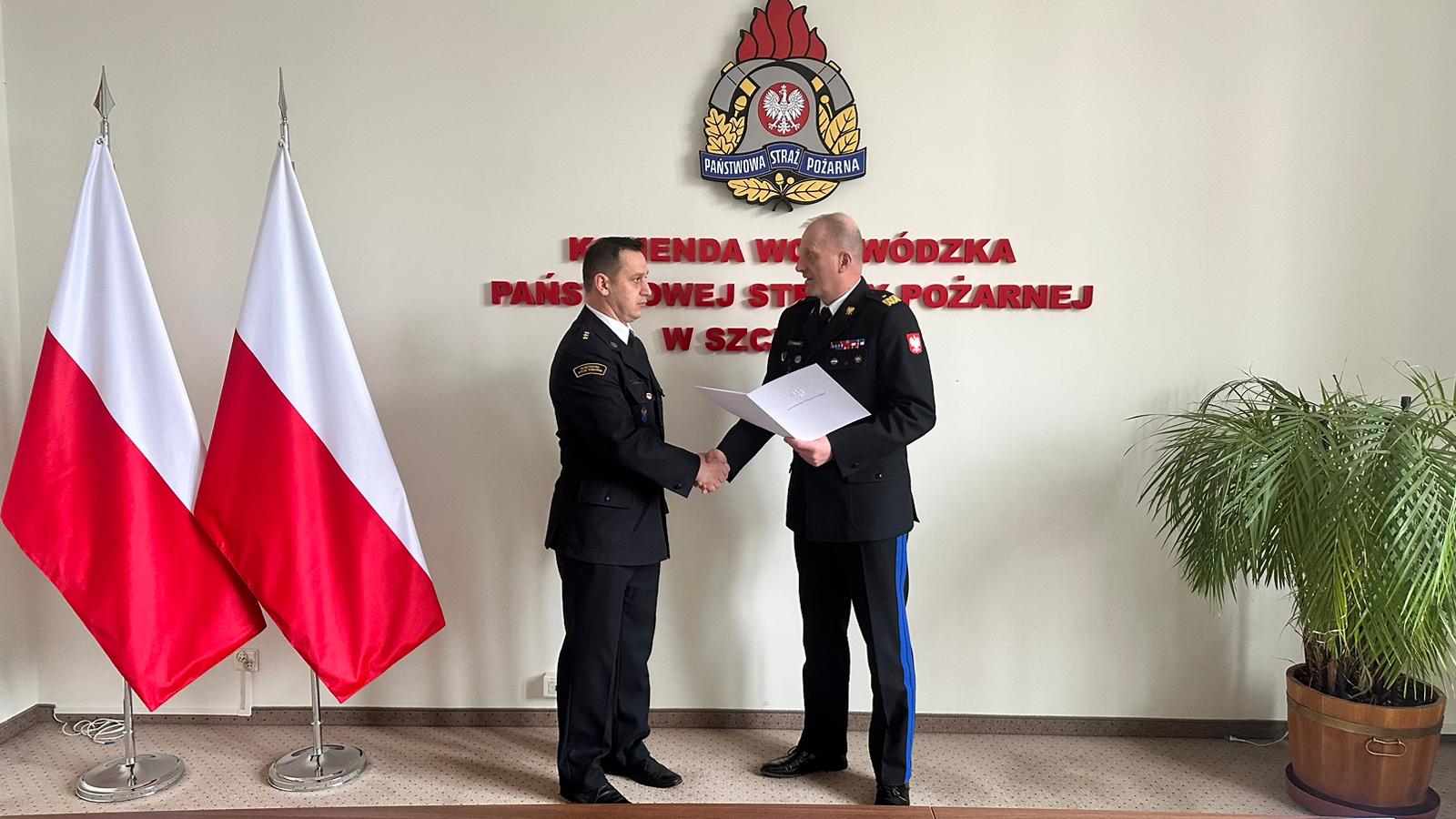 Wręczenie aktu powołania miało miejsce w dniu 21 marca br. w Komendzie Wojewódzkiej PSP w Szczecinie. W spotkaniu udział brał Zachodniopomorski Komendant Wojewódzki PSP, nadbryg. Jarosław Tomczyk, Komendant Powiatowy PSP w Pyrzycach mł. bryg. Robert Dębczak oraz Zastępca Komendanta Powiatowego PSP w Pyrzycach kpt. Marcin Zięcina.