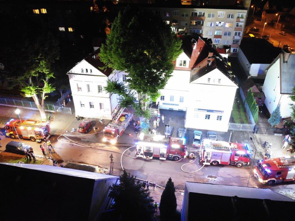 25 sierpnia o godzinie 17: 28 dyżurny Stanowiska Kierowania Komendanta Powiatowego Państwowej Straży Pożarnej w Pyrzycach przyjął zgłoszenie o pożarze budynku wielorodzinnego na ul. Szkolnej w Pyrzycach. Na miejsce zdarzenia zostały zadysponowane zastępy z Jednostki-Ratowniczo- Gaśniczej w Pyrzycach oraz sukcesywnie kolejne zastępy Ochotniczej Straży Pożarnej z terenu powiatu a także cysterna i drabina SCD-37 z Jednostki Ratowniczo- Gaśniczej ze Stargardu. Po dojeździe na miejsce pierwszych zastępów stwierdzono, że z poddasza wydobywa się dym a z okien płomienie. Działania polegały na ograniczeniu rozprzestrzenianiu się ognia na pozostałą część budynku oraz jego ugaszeniu. Działania prowadzono we wnętrzu budynku jak również przy użyciu drabiny mechanicznej oraz podnośnika hydraulicznego. Na potrzeby działań ratowniczych zamknięta została ulica Szkolna . Na miejsce działań przybył Komendant Powiatowy PSP mł. bryg. Robert Dębczak oraz Oficer Operacyjny mł. kpt. Marcin Zięcina. Zabezpieczenie medyczne na czas działań stanowił ZRM Pyrzyce.