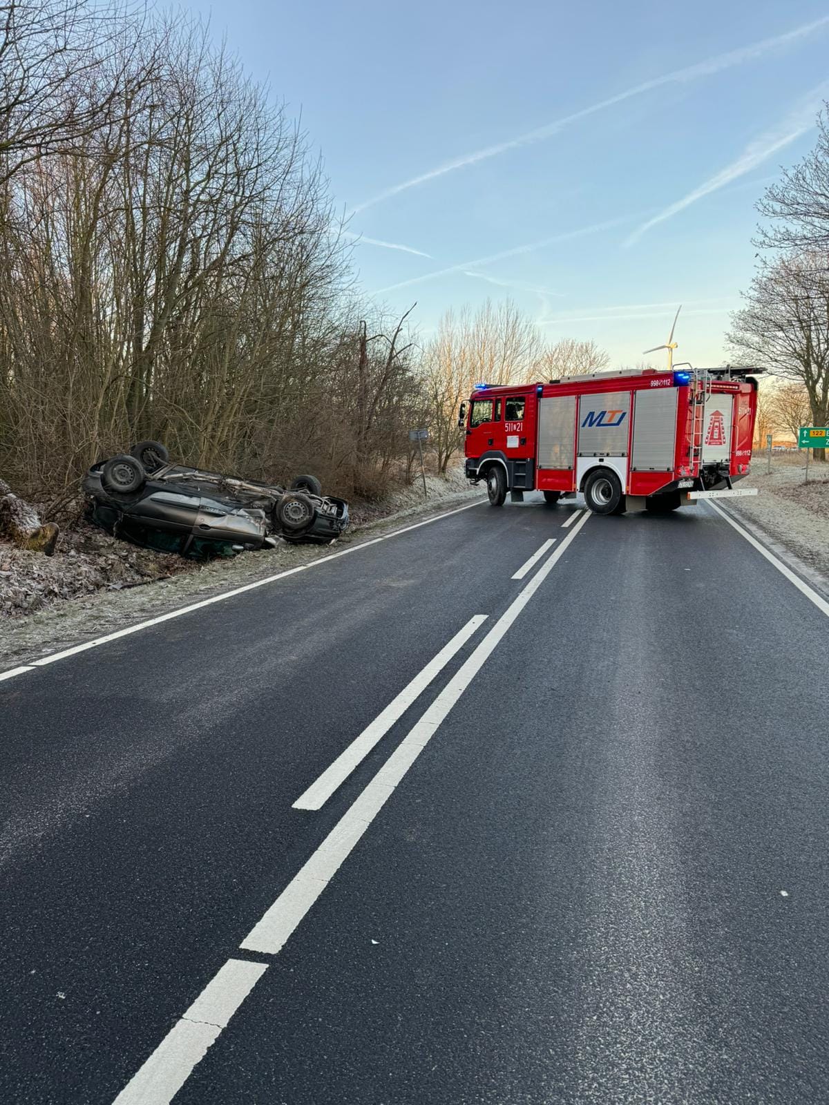 O godzinie 7:49 na DW 122 przy skręcie na Kozielice doszło dzisiaj do zdarzenia drogowego. Samochód osobowy dachował, podróżujące nim osoby opuściły pojazd przed przybyciem służb. Jedna osoba ( dziecko ) zostało zabrane do szpitala na obserwację.
