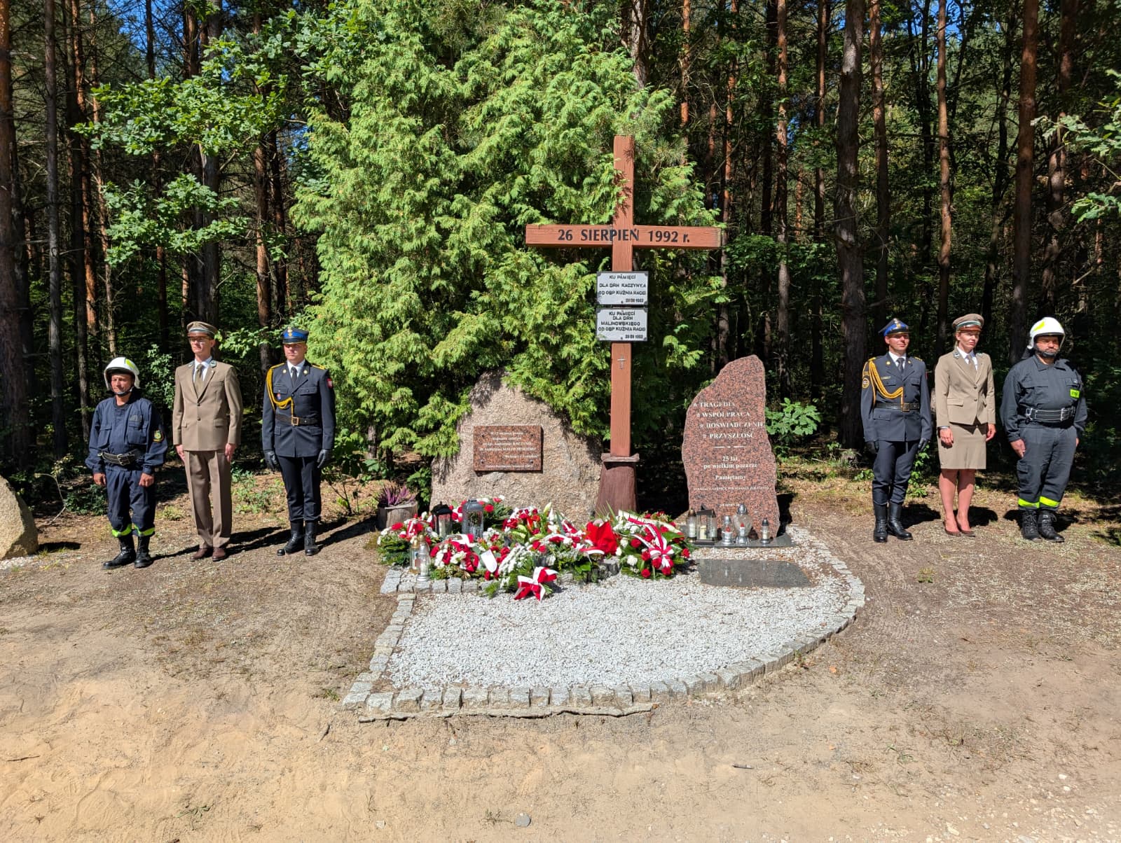 Następnie po wspomnieniu poległych w pożarze w lasu i modlitwie w ich intencji, złożono wiązanki kwiatów i zapalono znicze pod pamiątkowym krzyżem oraz na symbolicznych mogiłach.
