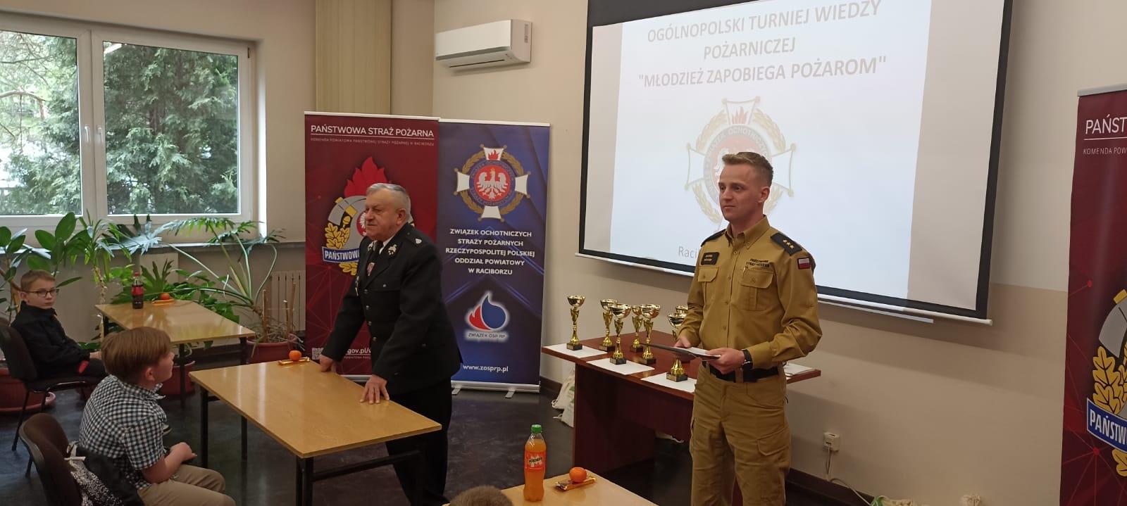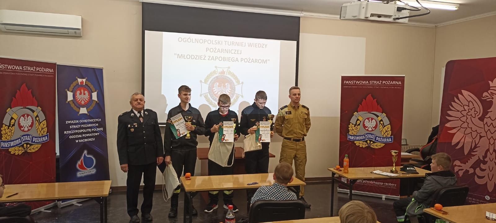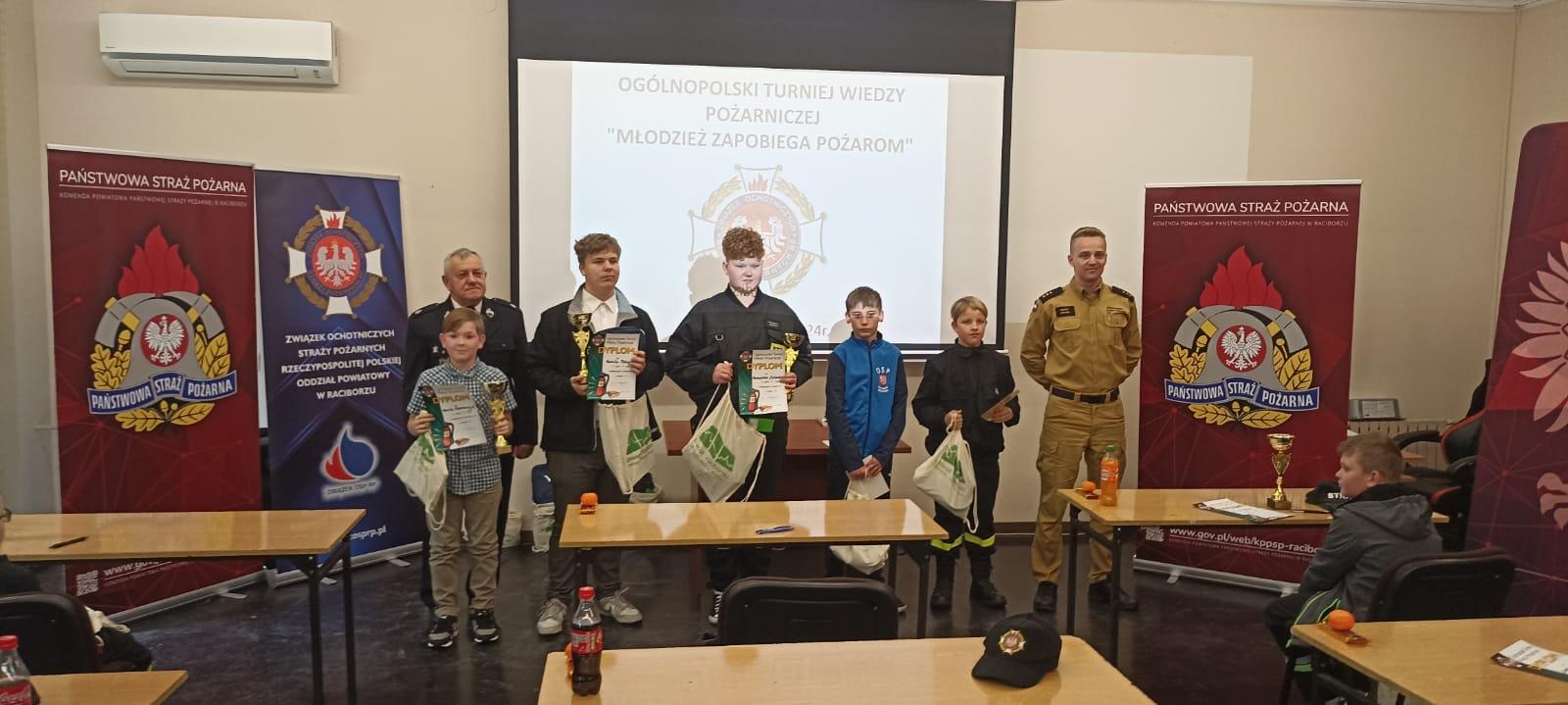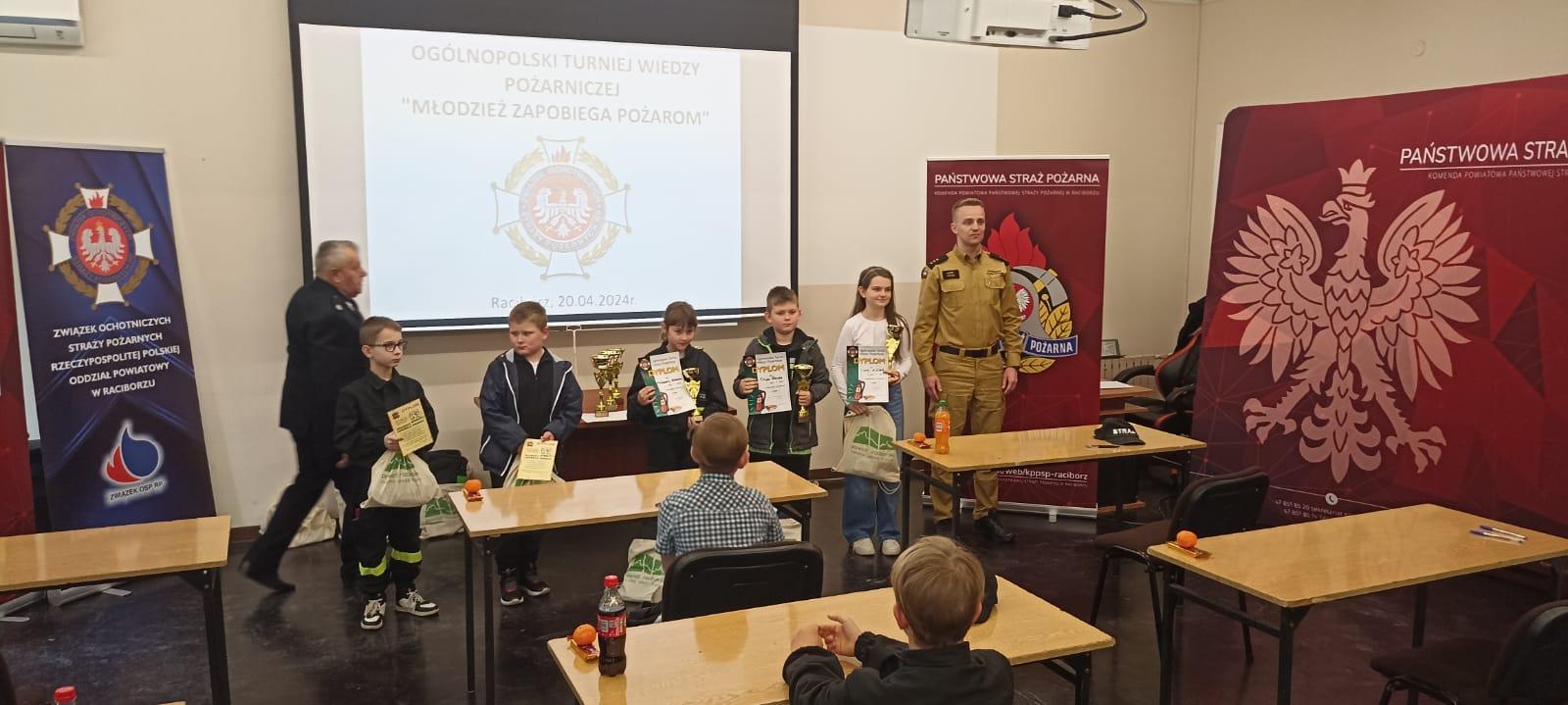 Dnia 20.04.2024r. w Komendzie Powiatowej Państwowej Straży Pożarnej w Raciborzu odbyły sie eliminacje powiatowe Ogólnopolskiego Turnieju Wiedzy Pożarniczej "Młodzież Zapobiega Pożarom". W turnieju udział wzięło 13 osób, które wcześniej okazały się najlepsze w eliminacjach gminnych. Zwycięzcy poszczególnych kategorii wiekowych uzyskali prawo reprezentowania powiatu raciborskiego w eliminacjach wojewódzkich, które odbędą się 27 kwietnia 2024r. w Czerwiące-Leszczynach. Poniżej klasyfikacje poszczególnych kategorii wiekowych: