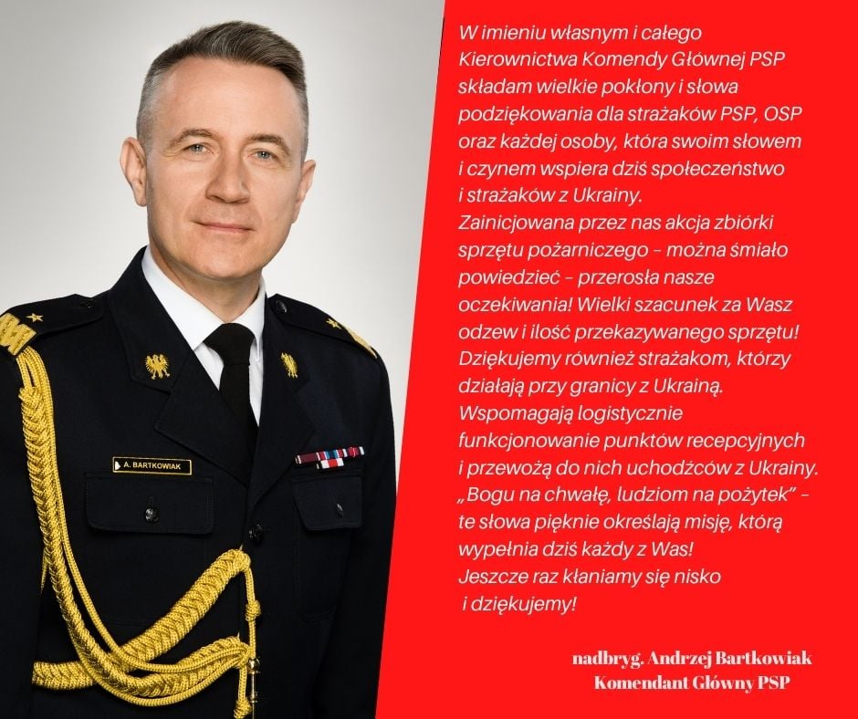Komendant Powiatowy Państwowej Straży Pożarnej w Raciborzu przyłącza się do podziękowań Komendanta Głównego PSP nadbryg. Andrzeja Bartkowiaka. Słowa serdecznego podziękowania składam wszystkim druhnom i druhom z jednostek OSP powiatu raciborskiego, funkcjonariuszom PSP oraz każdej osobie, która przyczyniła się do wsparcia naszych braci strażaków z Ukrainy. Udało się zebrać duże ilości sprzętu ratowniczo – gaśniczego i wyposażenia osobistego strażaków. Ponadto przekazano 2 średnie samochody ratowniczo – gaśnicze z jednostek OSP Pawłów i OSP Turze. Wymieniony sprzęt jest już w drodze do ukraińskich strażaków. Przeprowadzona zbiórka pokazała naszą wspólną solidarność, mobilizację raciborskich strażaków i zaangażowanie w pomoc bliźniemu.