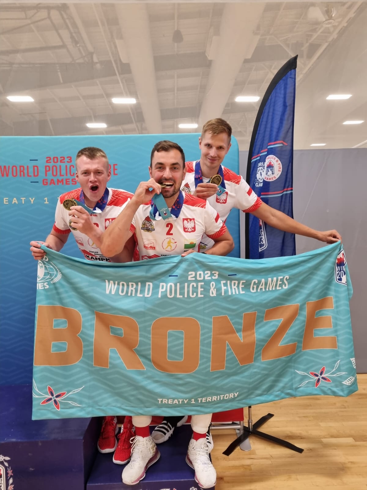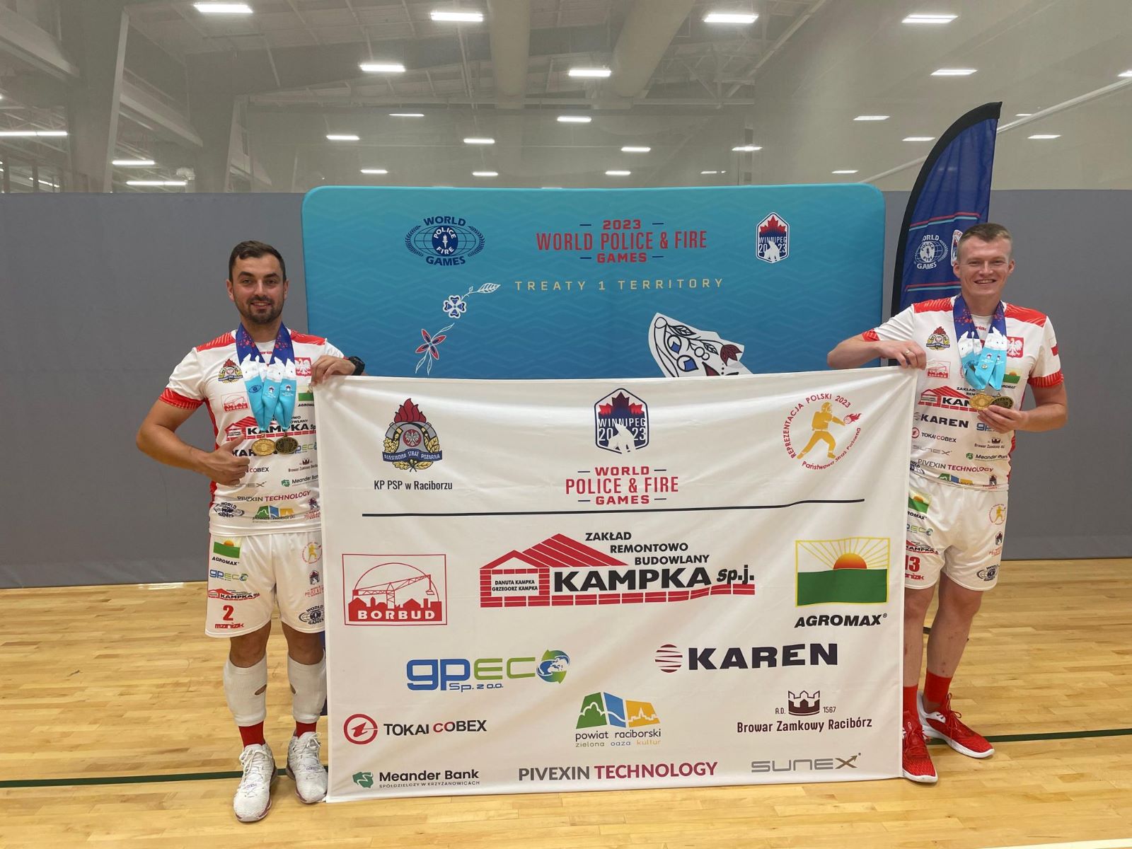 Reprezentacja Polski Strażaków w Siatkówce do Kanady wyruszyła z jasno postawionym celem- obroną olimpijskiego złotego medalu wywalczonego w poprzedniej edycji igrzysk w Rotterdamie w standardowej odmianie siatkówki 6x6. Cel ten udało się osiągnąć wygrywając 3:2 po zaciętym i niezwykle emocjonującym finale ze strażakami z Republiki Czeskiej. Dodatkową konkurencją, w której wzięli udział nasi funkcjonariusze to siatkówka dwuosobowa na hali. Tam w drużynie oprócz Mateusza i Mirosława znalazł się Łukasz Żłobecki z KM PSP Piekary Śląskie. W tej konkurencji naszym reprezentantom udało się wywalczyć brązowy medal. Tegoroczne Igrzyska to już trzecia impreza tej rangi, w której udział wzięli funkcjonariusze raciborskiej Komendy. W sumie w swoim dorobku oboje mają po 5 medali. Jak sami podkreślają wyjazd ten to ogromne przeżycie sportowe, ale również możliwość wymiany doświadczeń i nawiązania znajomości z funkcjonariuszami z całego świata.