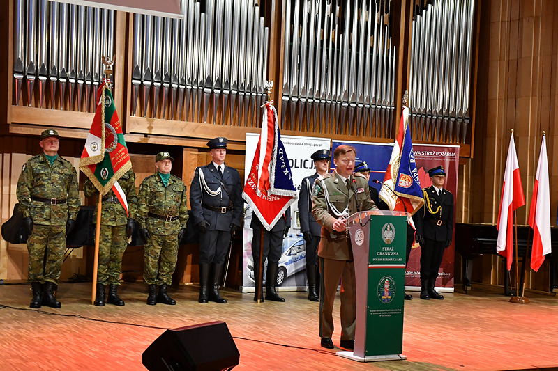 Po przywitaniu przybyłych gości odegrano i odśpiewano Hymn Państwowy, w trakcie którego tradycyjnie już zaprzyjaźniona z Oddziałem grupa wychowanków Specjalnego Ośrodka Szkolno-Wychowawczego dla Niesłyszących i Słabosłyszących w Raciborzu wykonała go w języku migowym. Następnie głos zabrał gospodarz uroczystości, Komendant Śląskiego Oddziału SG gen. bryg. SG Andrzej Jakubaszek.