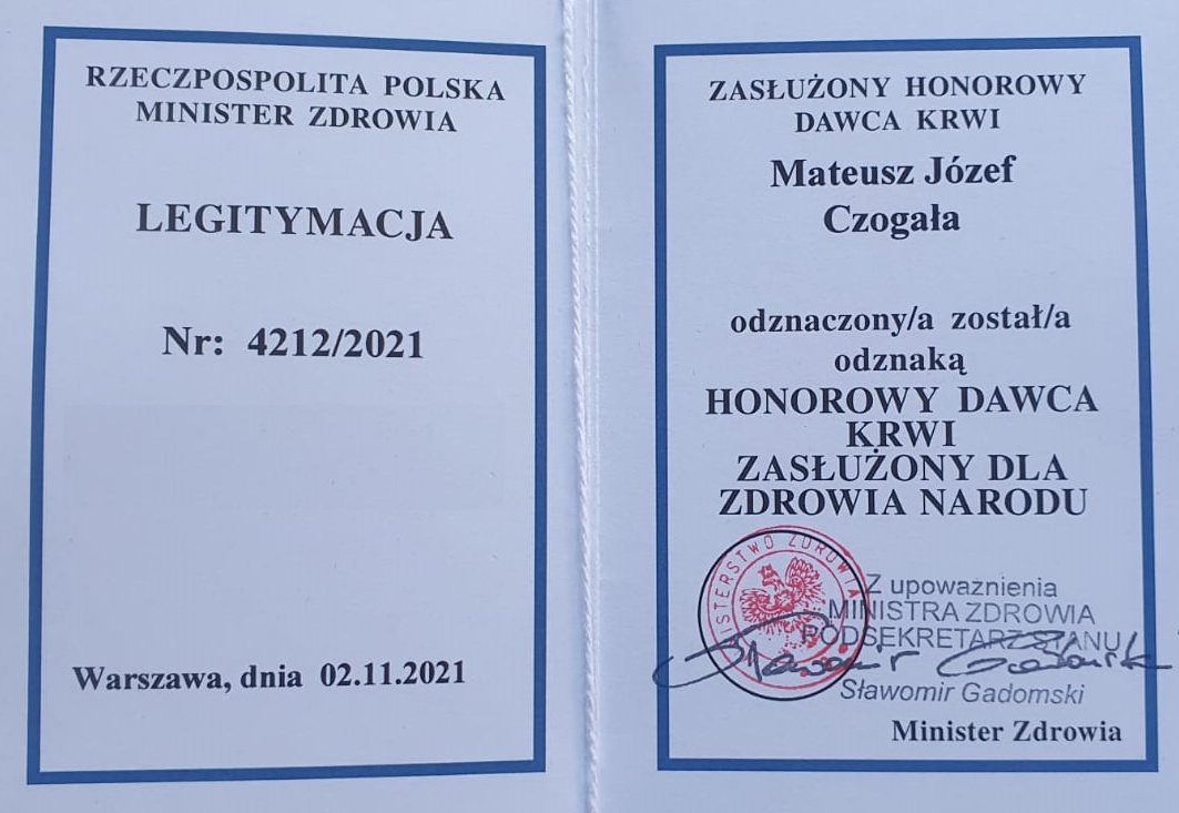 Funkcjonariusz Komendy Powiatowej Państwowej Straży Pożarnej w Raciborzu sekcyjny Mateusz Czogała został wyróżniony odznaką "Honorowy Dawca Krwi - Zasłużony dla Zdrowia Narodu". W dniu 03 stycznia 2022 roku wręczenia odznaki dokonała Pani Dyrektor Regionalnego Centrum Krwiodawstwa i Krwiolecznictwa w Raciborzu, w imieniu Ministra Zdrowia Sławomira Gadomskiego. Funkcjonariusz oddał już ponad 20 litrów krwi.