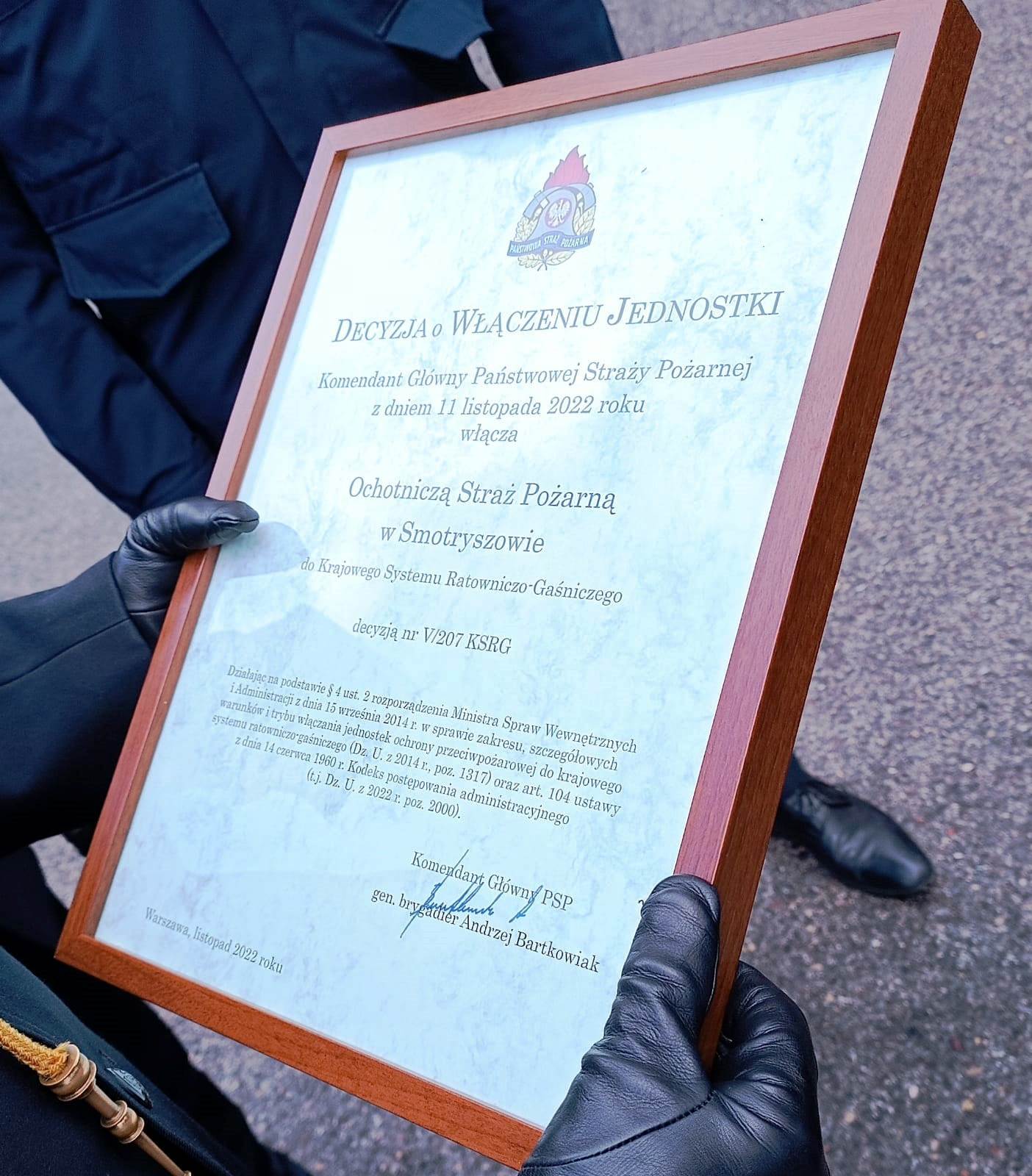Podczas uroczystości Druh Karol Maszczyk, Prezes jednostki OSP Smotryszów, odebrał oficjalny akt włączenia jednostki do KSRG z rąk Zastępcy Łódzkiego Komendanta Wojewódzkiego PSP w Łodzi, st. bryg. Pawła Malinowskiego.
