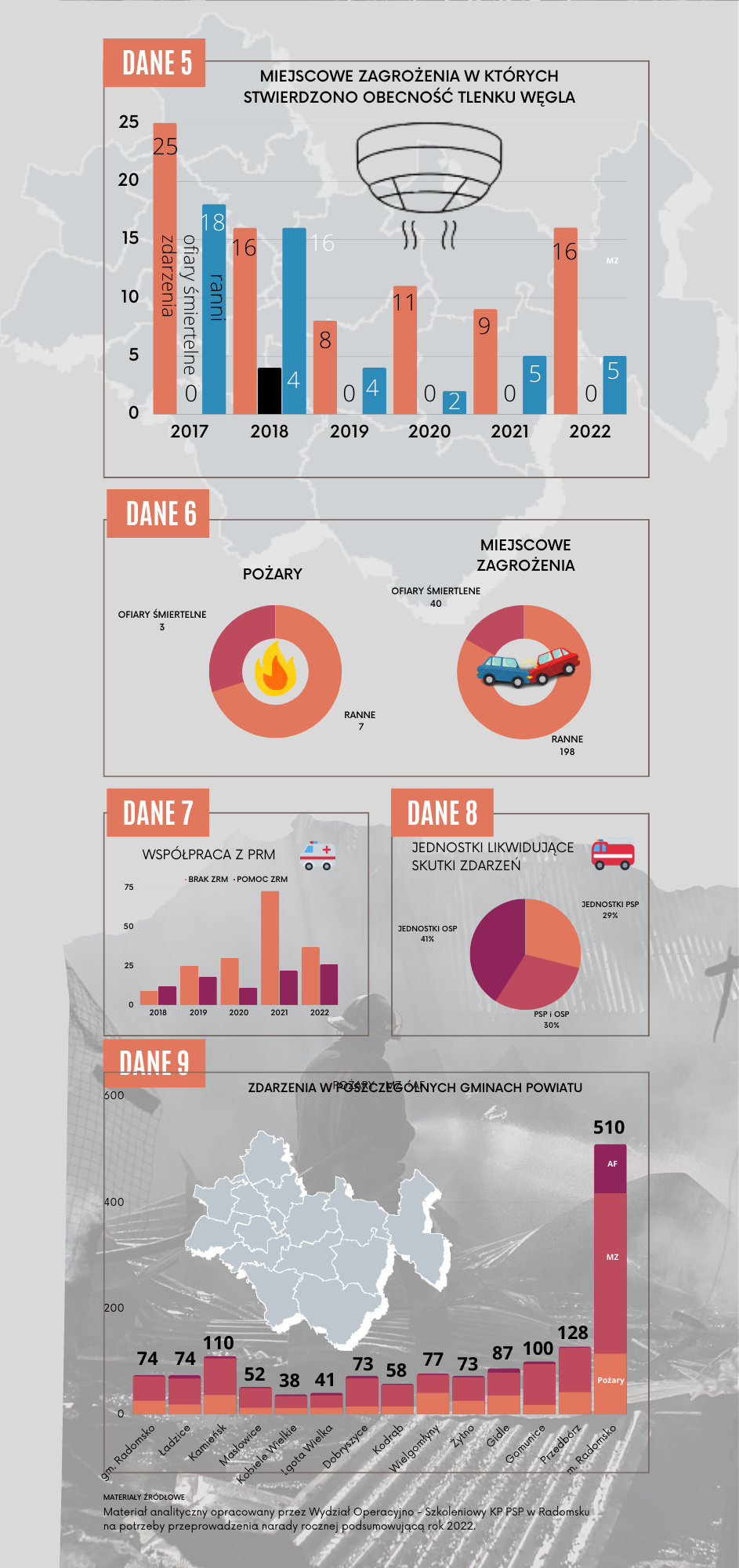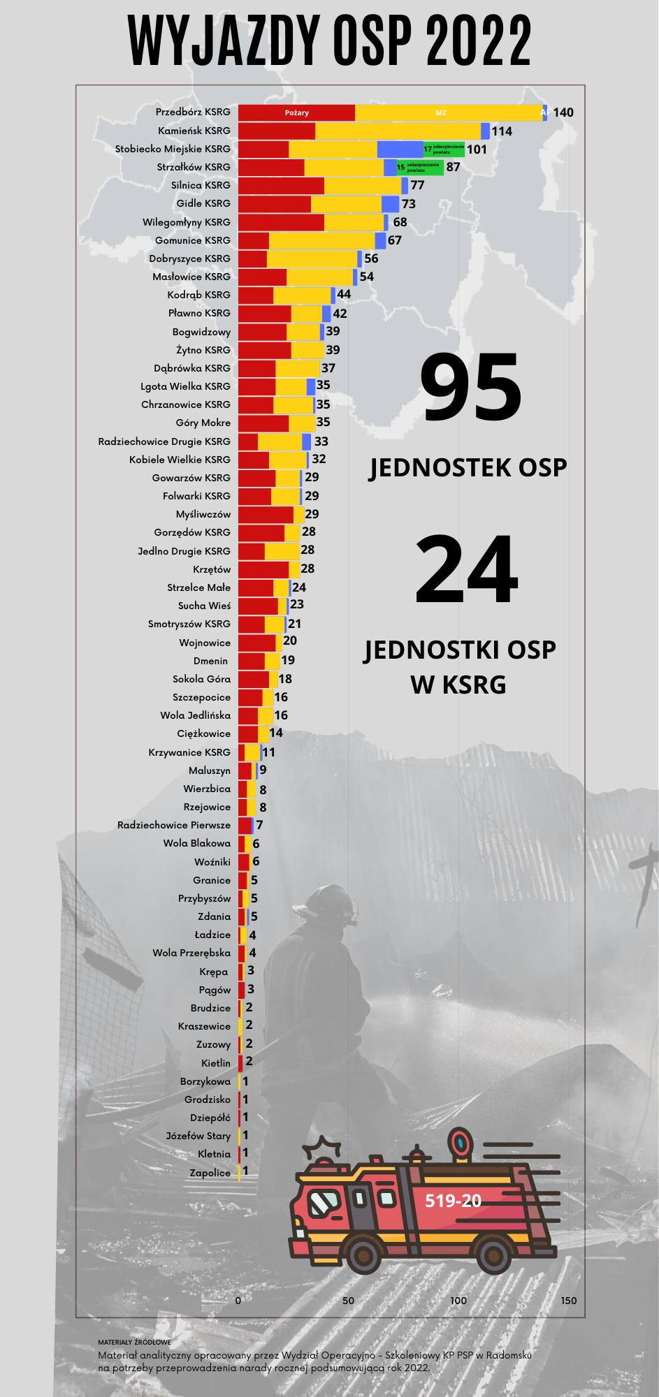 Największa ilość zdarzeń w roku 2022 miała miejsce na terenie miasta Radomska gdzie odnotowano 510 interwencji. Najbezpieczniejszą gminą okazała się gm. Kobiele Wielkie gdzie interwencji odnotowano 38.