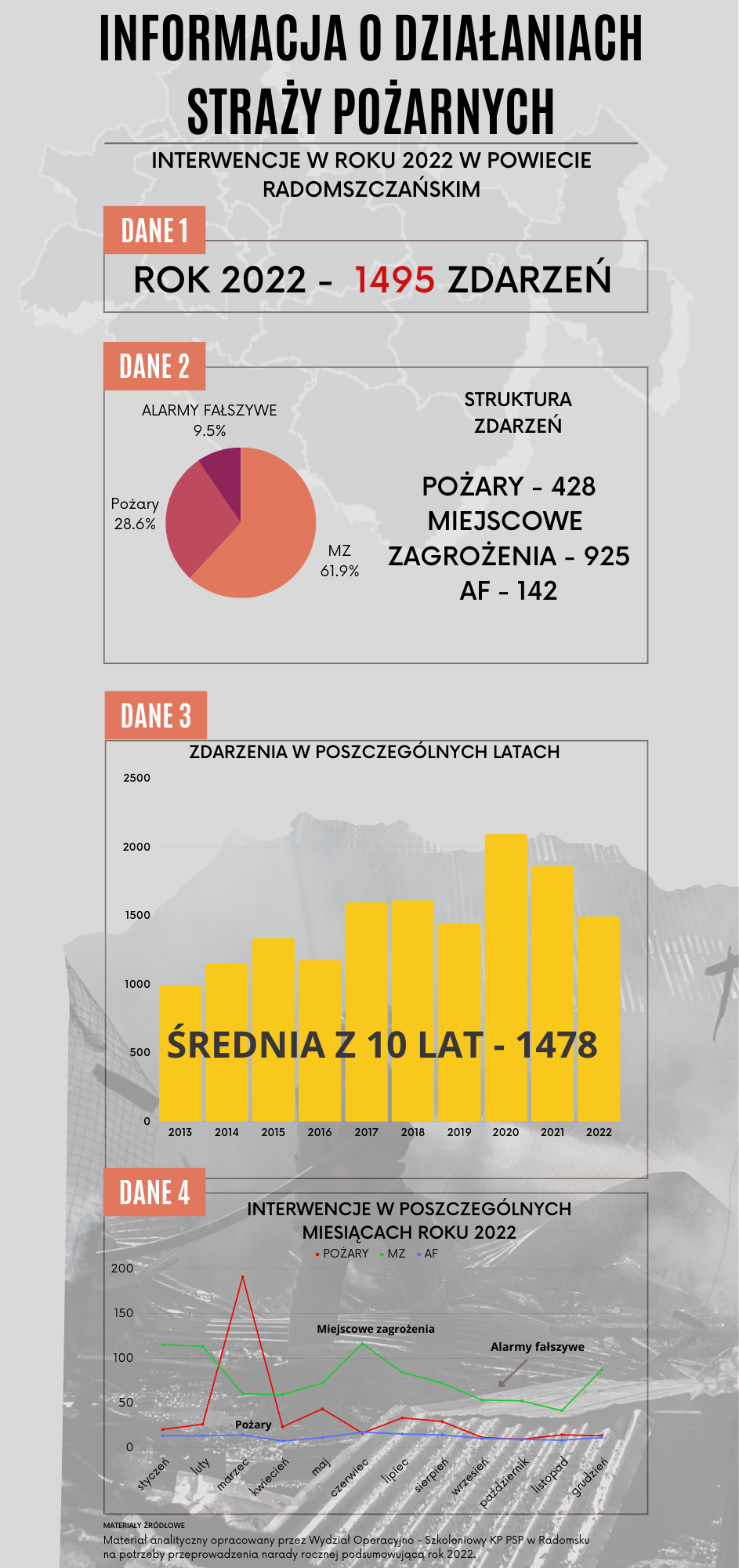 W 2022 roku Komenda Powiatowa Państwowej Straży Pożarnej w Radomsku odnotowała 1495 interwencji, z czego 428 stanowiły pożary, 925 inne miejscowe zagrożenia, a 142 interwencji było alarmami fałszywymi.