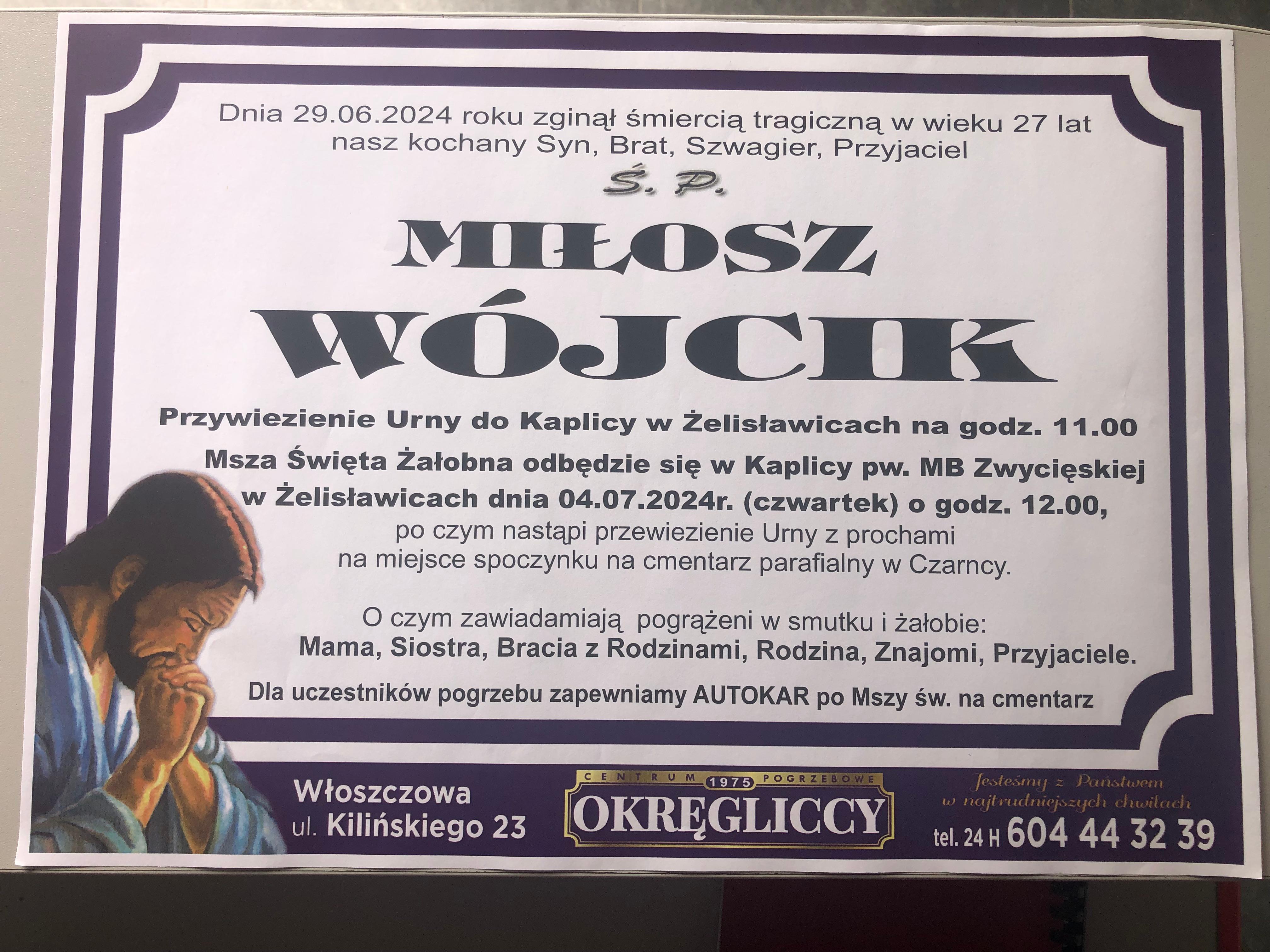Z głębokim żalem zawiadamiamy o tragicznej śmierci sekcyjnego Miłosza Wójcika, funkcjonariusza Komendy Powiatowej Państwowej Straży Pożarnej w Radomsku, który zginął śmiercią tragiczną dnia 29 czerwca 2024 roku.