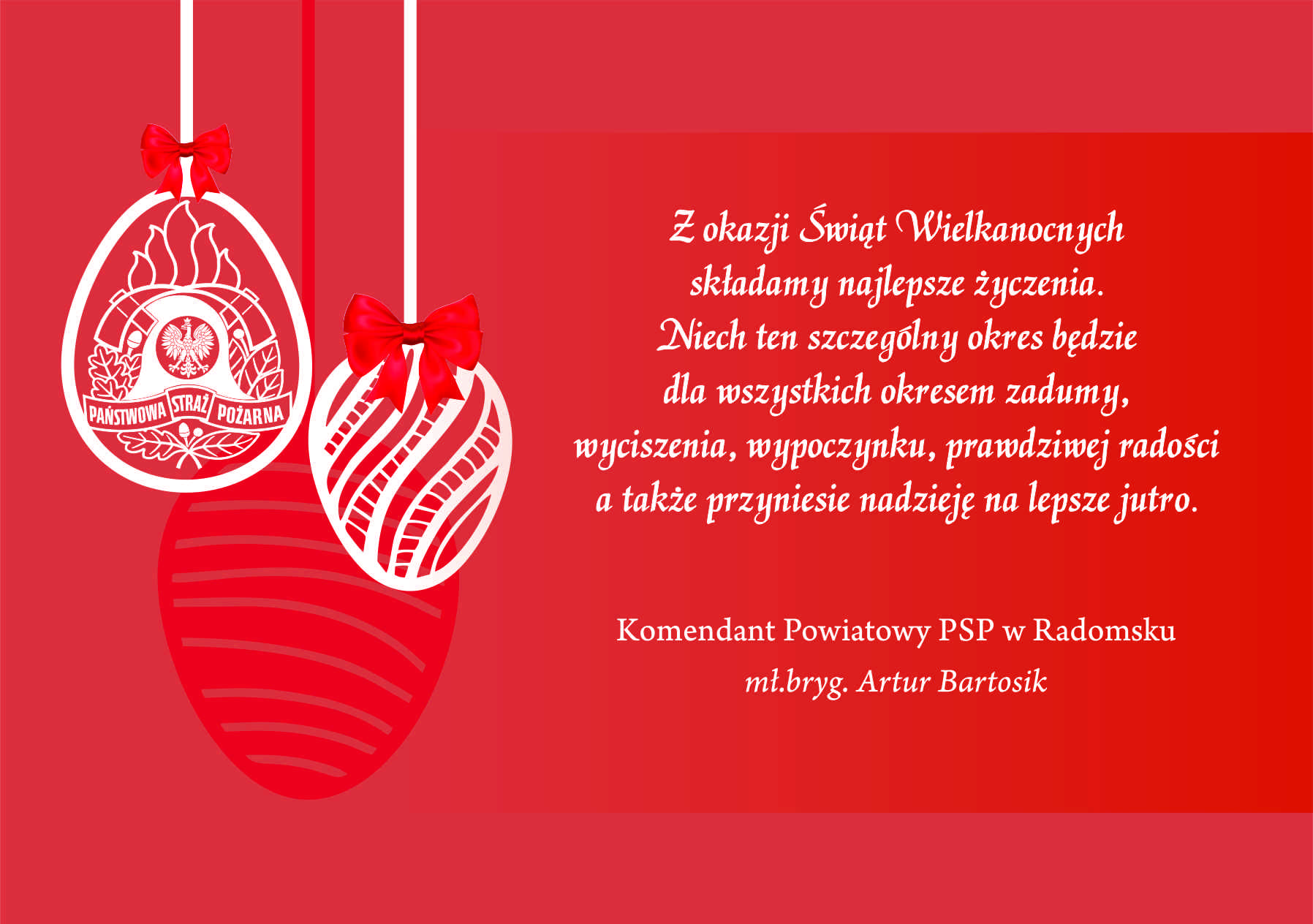 Logo państwowej straży pożarnej i napis wesołych świąt wielkanocnych, komenda powiatowa państwowej straży pożarnej w radomsku. W tle kilka czerwonych jajek przyozdobionych w białe koronki