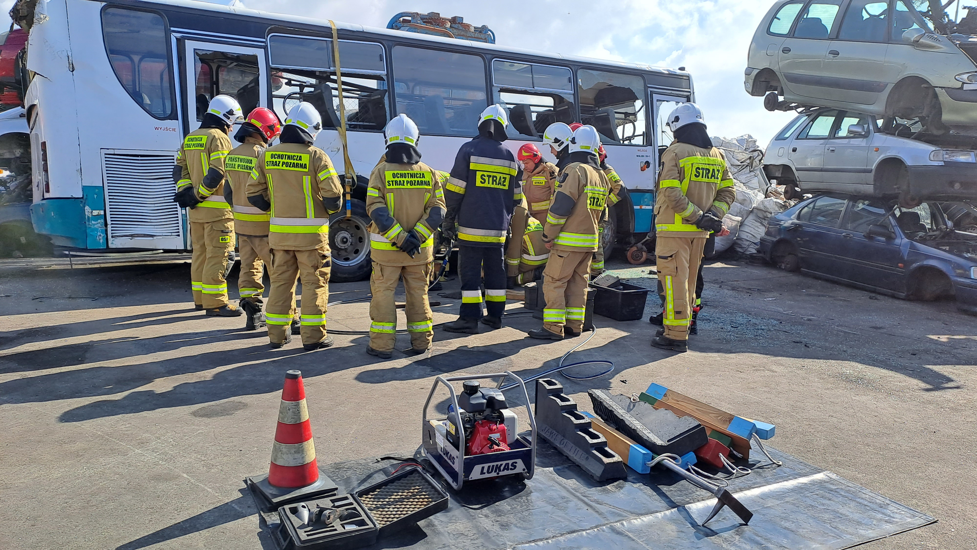 - doskonalenie technik ratowniczych m.in. stabilizacja pojazdu, wykonanie dostępu do osoby poszkodowanej w wypadkach komunikacyjnych na bazie autobusu udostępnionego przez właściciela firmy na potrzeby ćwiczeń.