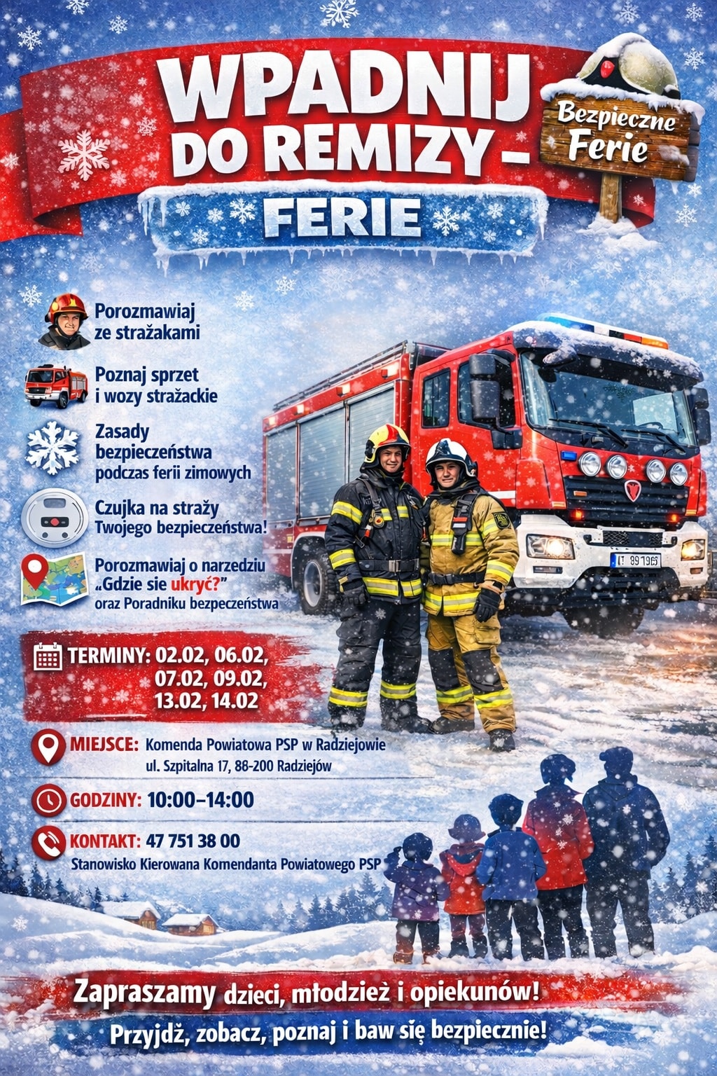 W ramach ferii zimowych Komenda Powiatowa PSP w Radziejowie realizuje akcję „Wpadnij do strażnicy”, polegającą na prowadzeniu pogadanek oraz krótkich wizyt edukacyjnych, skierowanych głównie do dzieci i młodzieży, a także ich opiekunów.