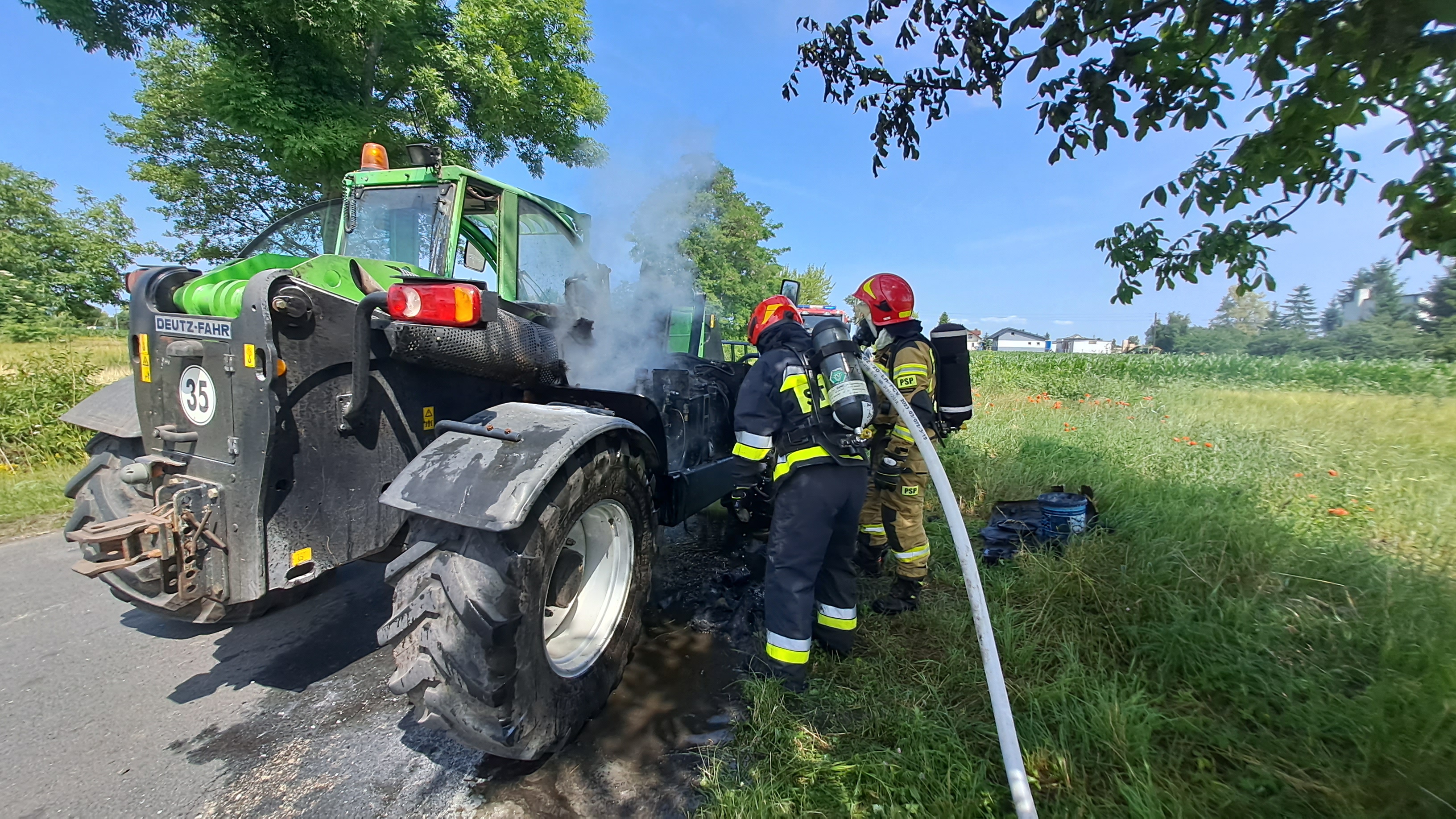Po przybyciu na miejsce zdarzenia zastano pożar rozwinięty przestrzeni komory silnika ładowarki teleskopowej, pojazd blokował prawy pas drogi powiatowej. Brak osób poszkodowanych.