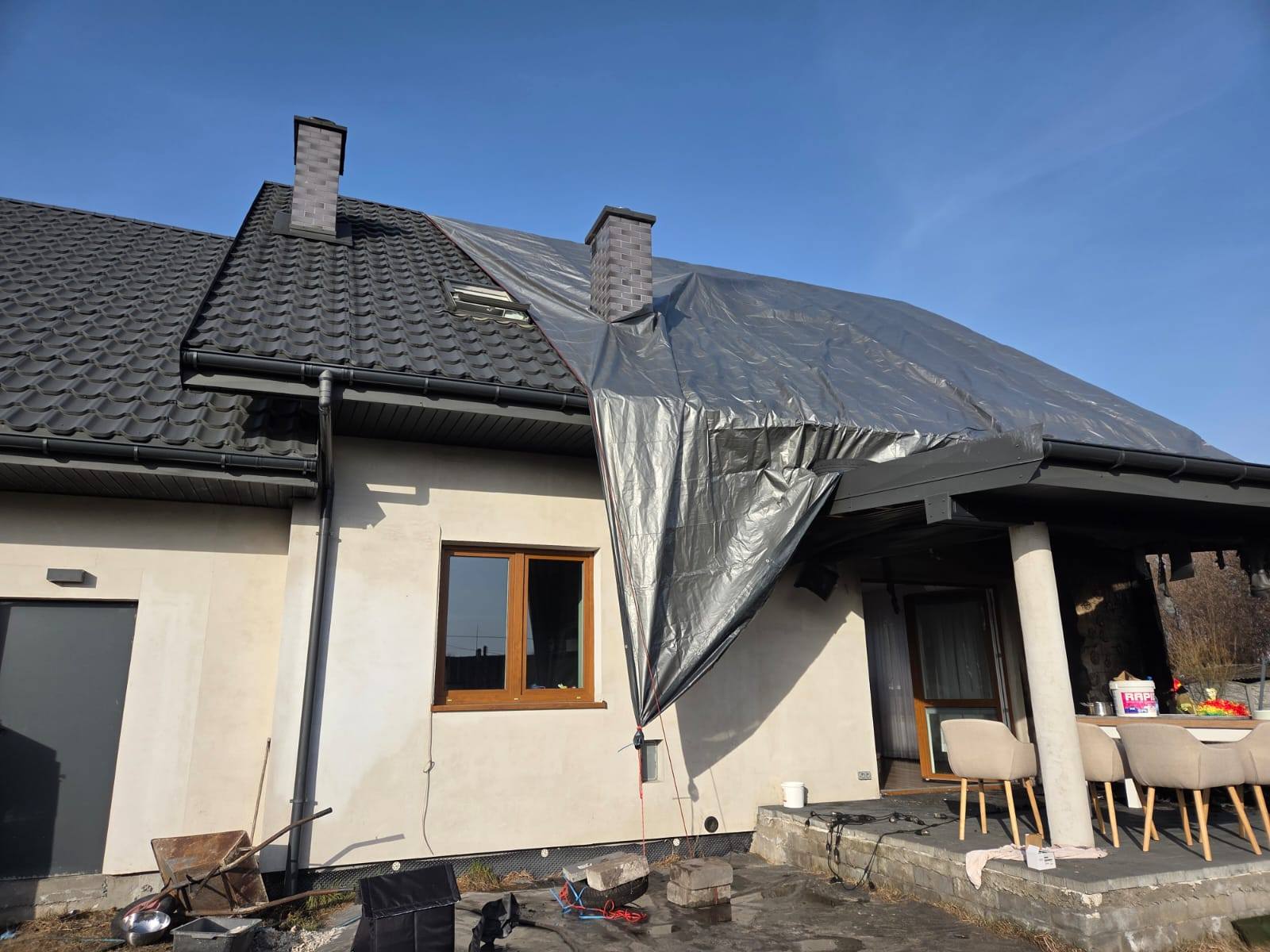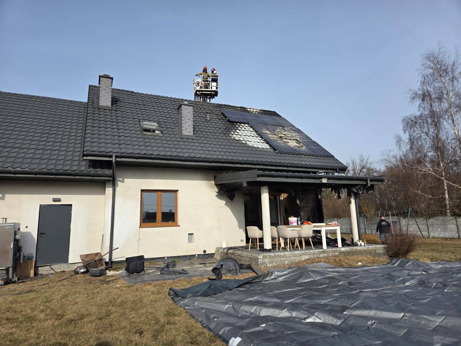 Po ugaszeniu pożaru budynek sprawdzono kamerą termowizyjną oraz detektorem wielogazowym – nie stwierdzono obecności niebezpiecznych gazów ani ukrytych zarzewi ognia. Dach oraz panele instalacji fotowoltaicznej zabezpieczono plandeką.