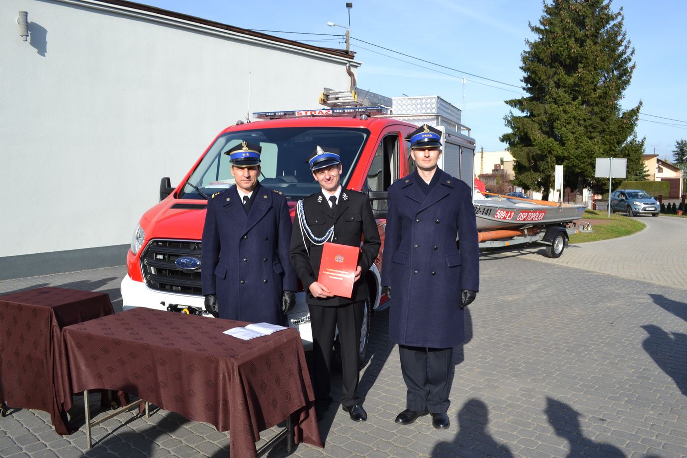 w Topólce odbyła się uroczystość przekazania nowego lekkiego wozu ratownictwa technicznego marki Ford Transit oraz dotychczas użytkowanej w Komendzie Powiatowej Państwowej Straży Pożarnej w Radziejowie łodzi ratowniczej z silnikiem zaburtowym.