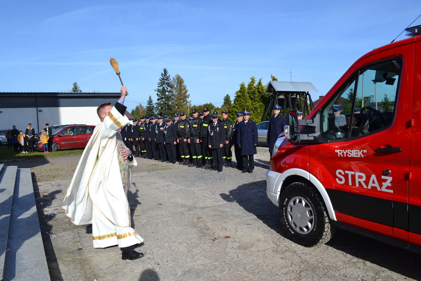 Uroczystość została poprzedzona mszą świętą odprawioną w intencji strażaków w kościele parafialnym Miłosierdzia Bożego w Topólce. Po mszy miało miejsce również miejsce poświęcenie przekazywanego sprzętu.