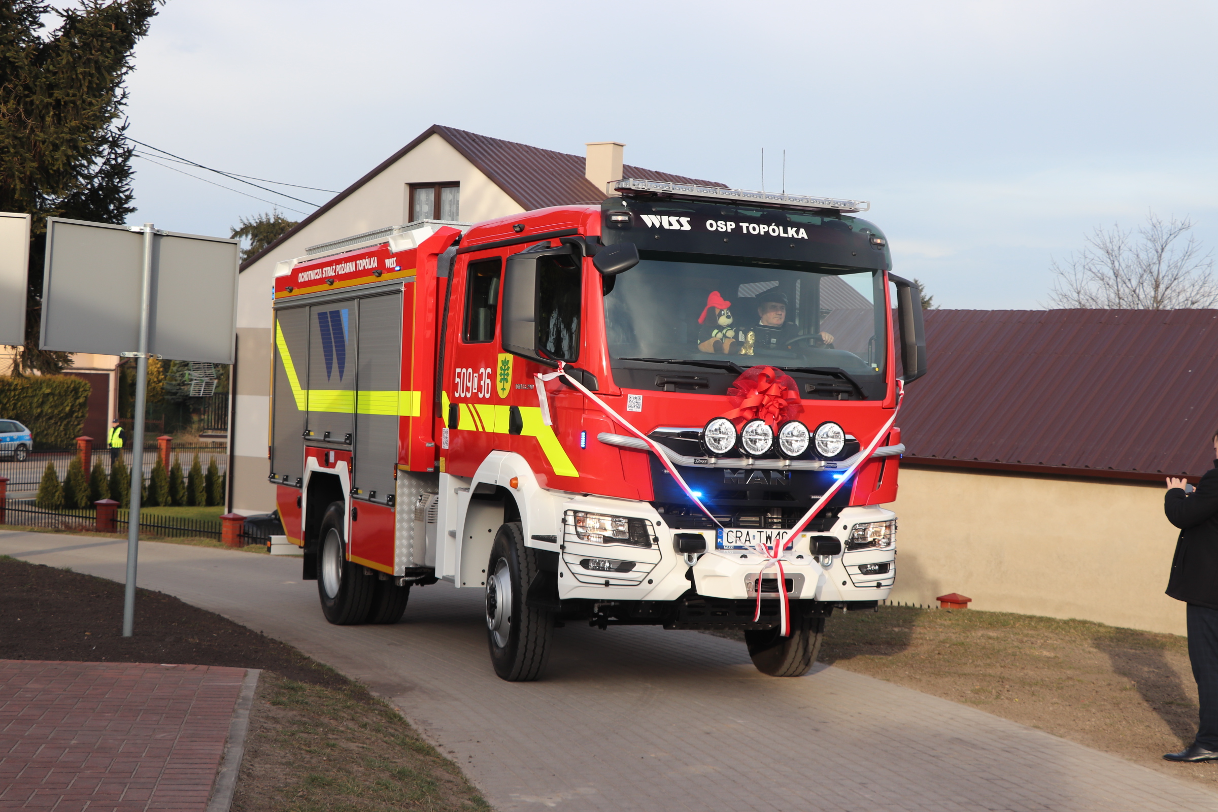 W dniu 18 marca 2023 r. w miejscowości Topólka odbyło się uroczyste przekazanie nowego średniego samochodu ratowniczo-gaśniczego dla Ochotniczej Straży Pożarnej w Topólce. Nowy wóz bojowy na podwoziu marki Man został zabudowany przez firmę ,, Inżynieria Samochodów Specjalnych- Wawrzaszek ” z siedzibą w Bielsku- Białej. Pojazd posiada zbiornik na wodę o pojemności 4100 litrów oraz liczne wyposażenie potrzebne do prowadzenia działań. Wartość samochodu to blisko 1,3 ml zł.