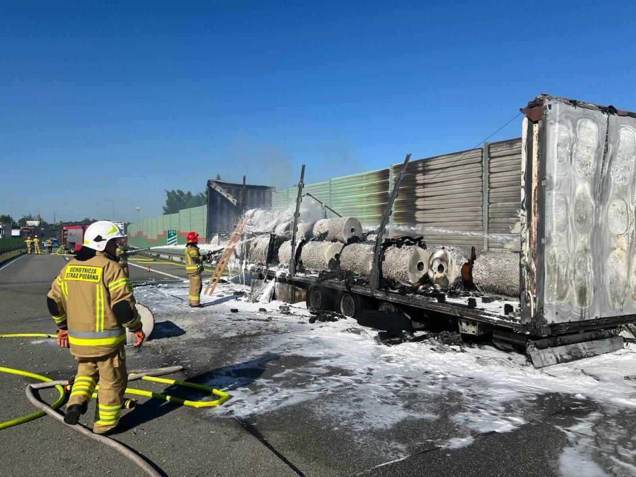 Po dojeździe okazało się, że pali się naczepa samochodu ciężarowego (całkowicie objęta ogniem), kierowca samochodu ciężarowego zdążył odczepić ciągnik siodłowy i odjechał około 50 m dalej. Kierowca podczas wykonywania tych czynności uległ lekkiemu poparzeniu. Gęsty dym utrudniał widoczność na obydwu pasach ruchu. Z listów przewozowych otrzymanych od kierowcy, uzyskano informację, że na naczepie znajduje się ok. 21t foli w rolkach (ok. 50 szt.).