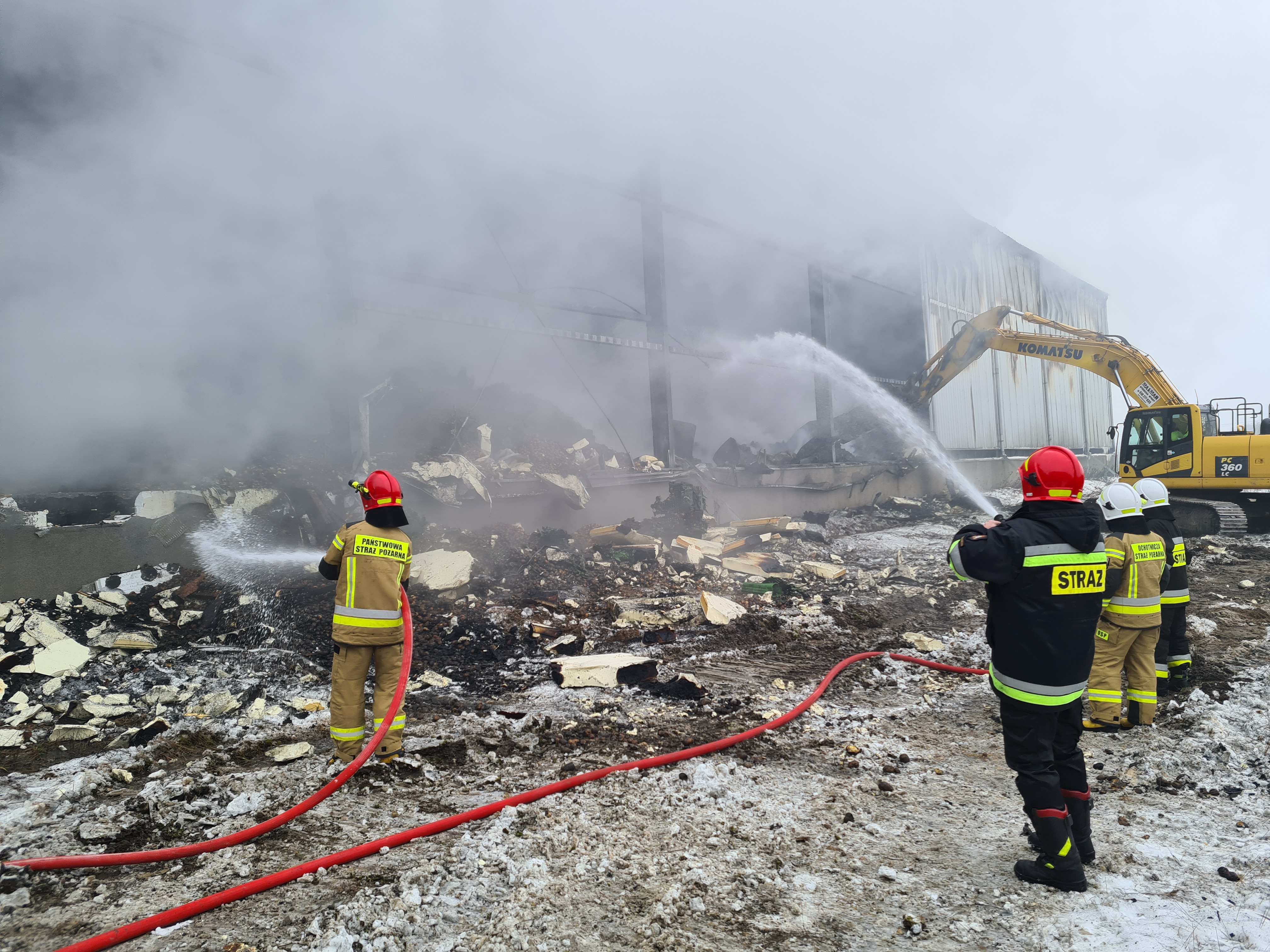 Od lokalizacji pożaru rozpoczęła się faza dogaszania. Część hali ugaszono już w sobotę (16.01). Natomiast część hali, w której zlokalizowane były komory przechowalnicze z jabłkami i ziemniakami, ze względu na brak dostępu dogaszano z zewnątrz. Niestabilność konstrukcji hali i brak możliwości dotarcia do wnętrza komór spowodowała, że zdecydowano o rozebraniu hali i sukcesywnym dogaszaniu wygarnianych z wnętrza komór stopionych i tlących się skrzyniopalet z jabłkami i ziemniakami.