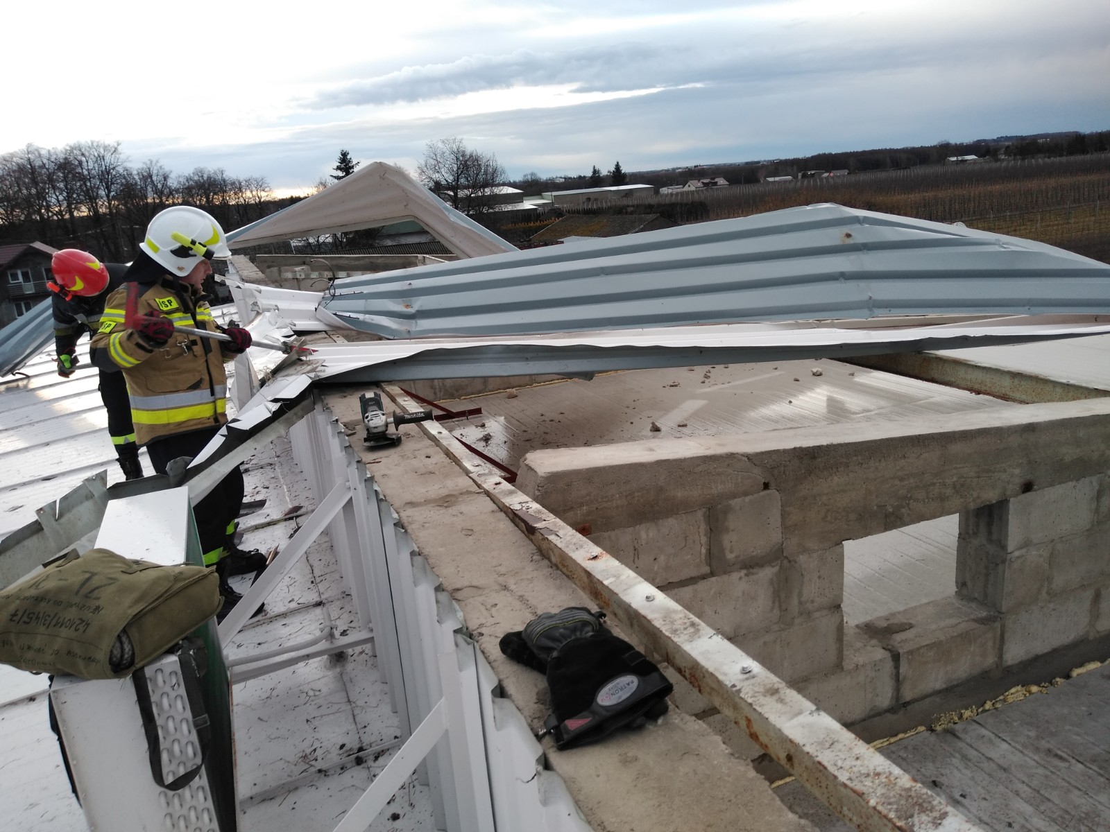 W jednym ze zdarzeń w miejscowości Grzymkowice wiatr zerwał dach z przechowalni owoców. Spadające elementy konstrukcji dachu oraz połamane gałęzie uszkodziły 4 pojazdy znajdujące się na posesji.