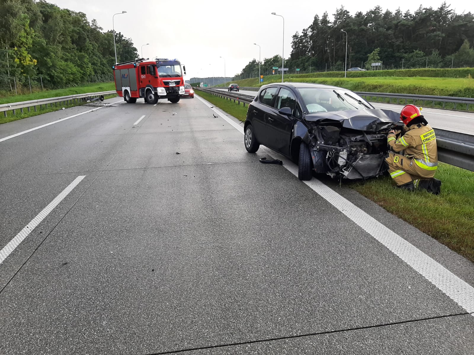 Dnia 12.09.2021 r. na drodze S8 w miejscowości Przewodowice kierowca samochodu osobowego uderzył w barierę energochłonną. Na szczęście kierowca pojazdu nie odniósł obrażeń. Działania ratowników polegały na zabezpieczeniu miejsca zdarzenia, a następnie usunięciu skutków pokolizyjnych.