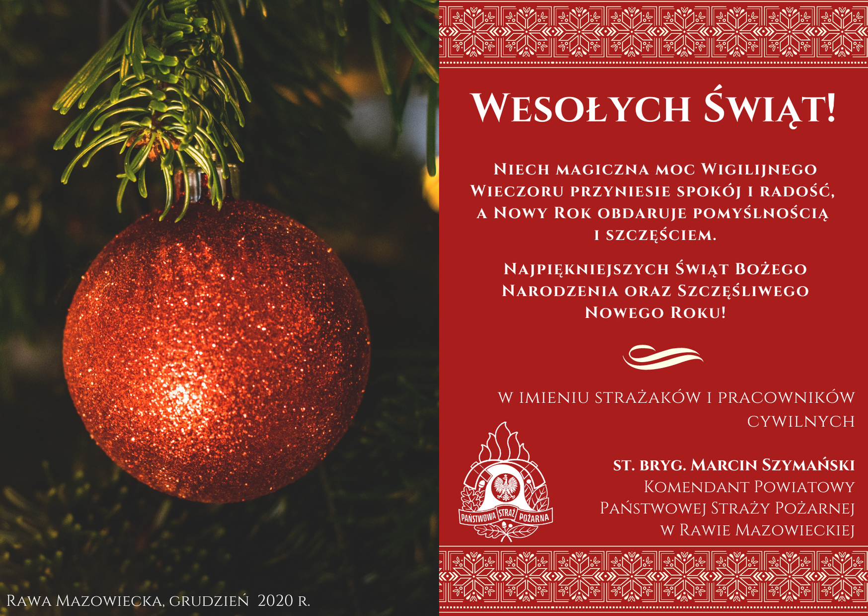 Życzenia świąteczno-noworoczne Komendanta Powiatowego PSP w Rawie Mazowieckiej 21.12.2020 Życzenia świąteczno-noworoczne Komendanta Powiatowego KP PSP w Rawie Mazowieckiej Zdjęcia (1) Pokaż zdjęcie 1 z galerii.