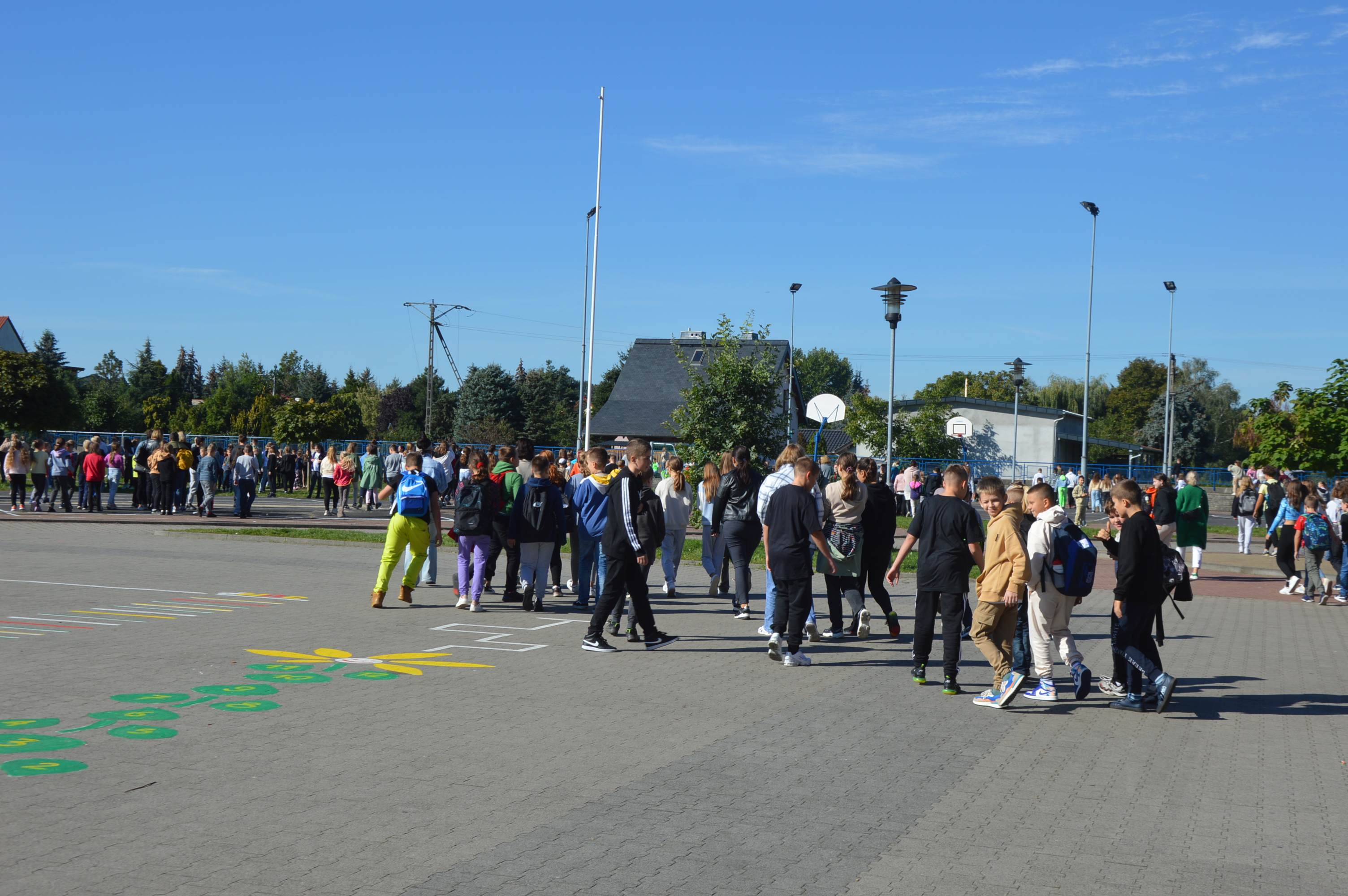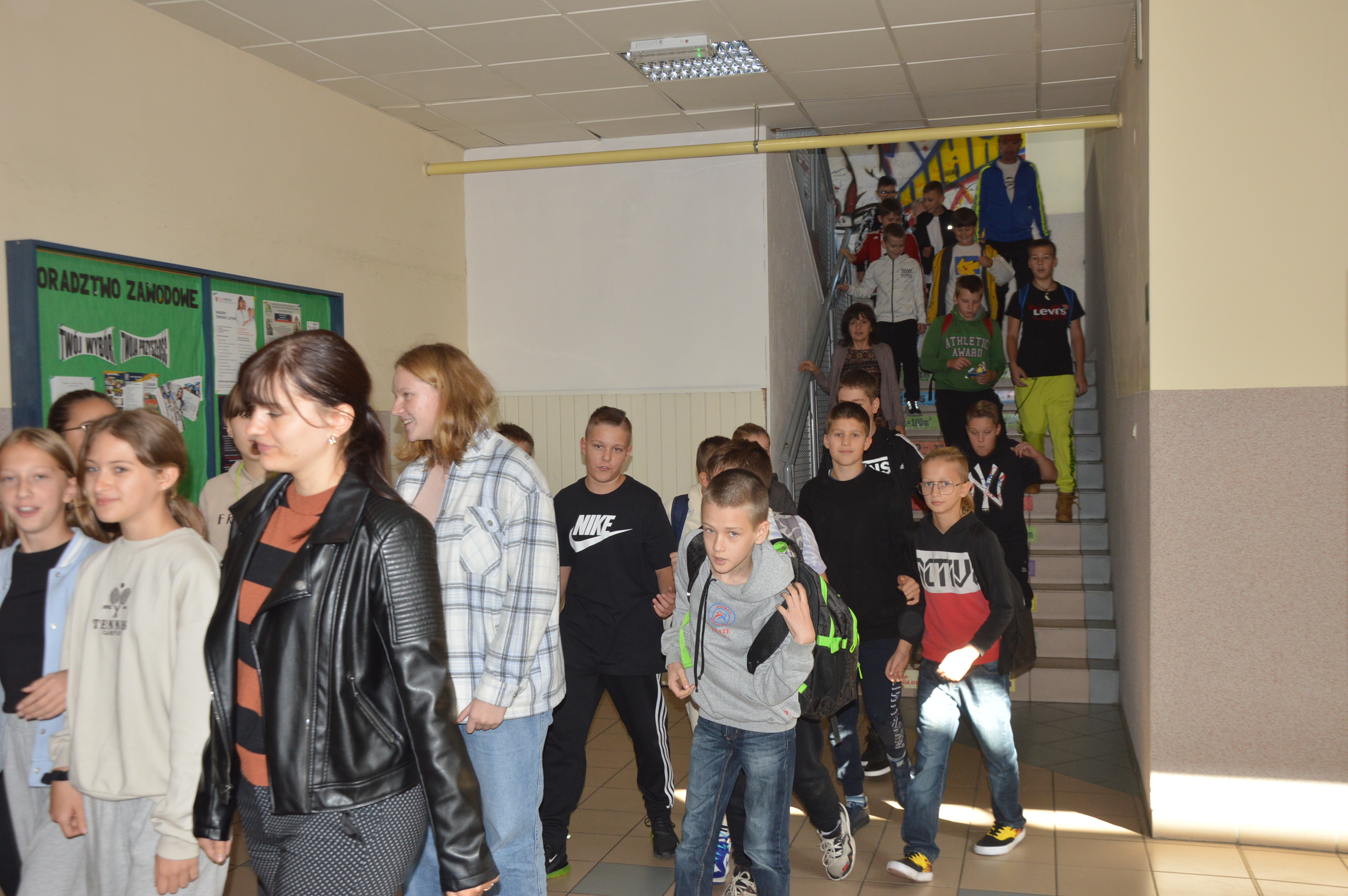 Użytkownicy tej placówki sprawnie i bezpiecznie opuścili swoje sale, udając się pod opieką nauczycieli w wyznaczone miejsce na boisku szkolnym.