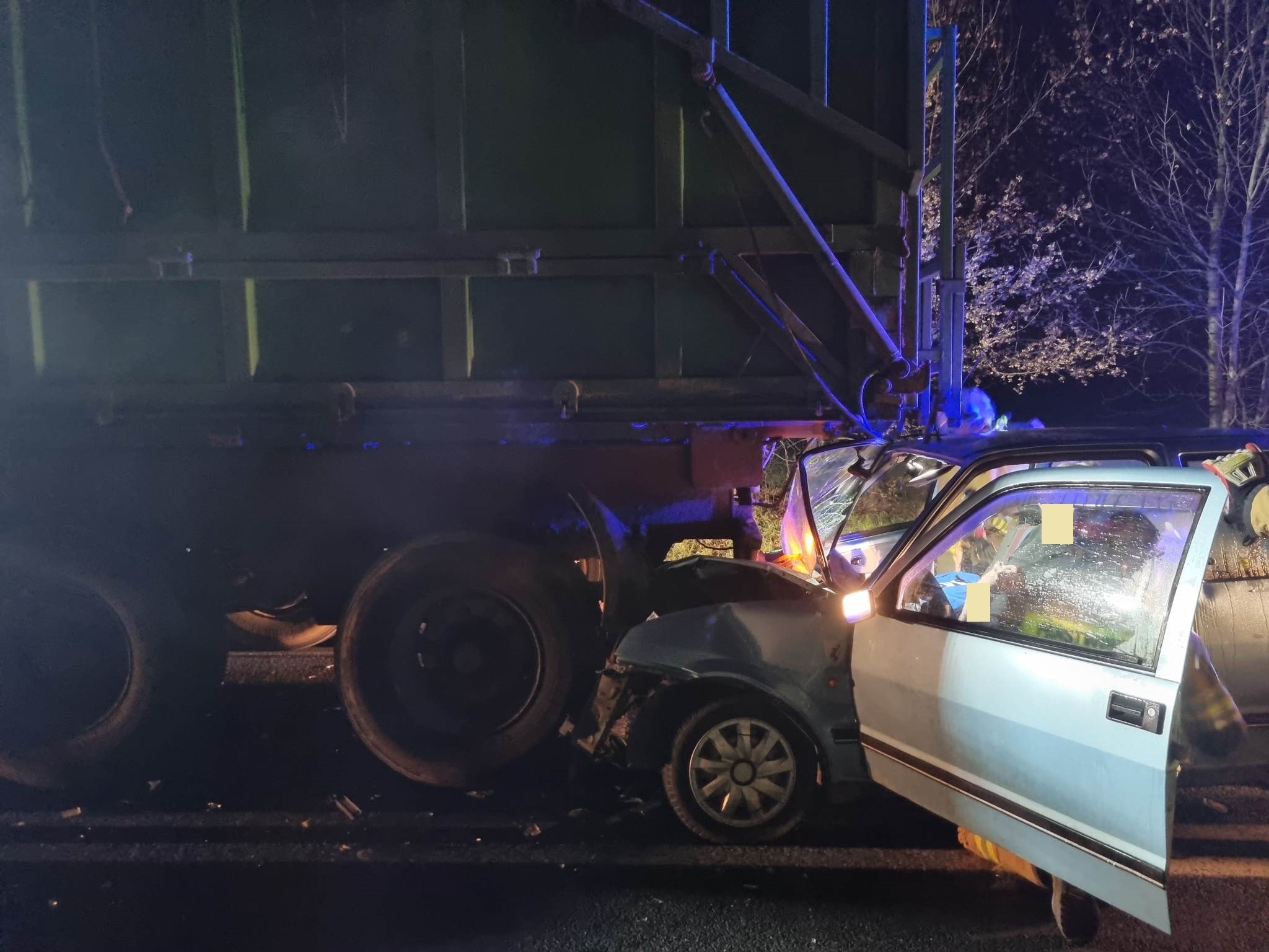 Kilkadziesiąt metrów za rondem samochód uderzył w tył przyczepy. W wyniku tego kierowca doznał obrażeń ciała, a pojazd który prowadził uległ poważnym uszkodzeniom.