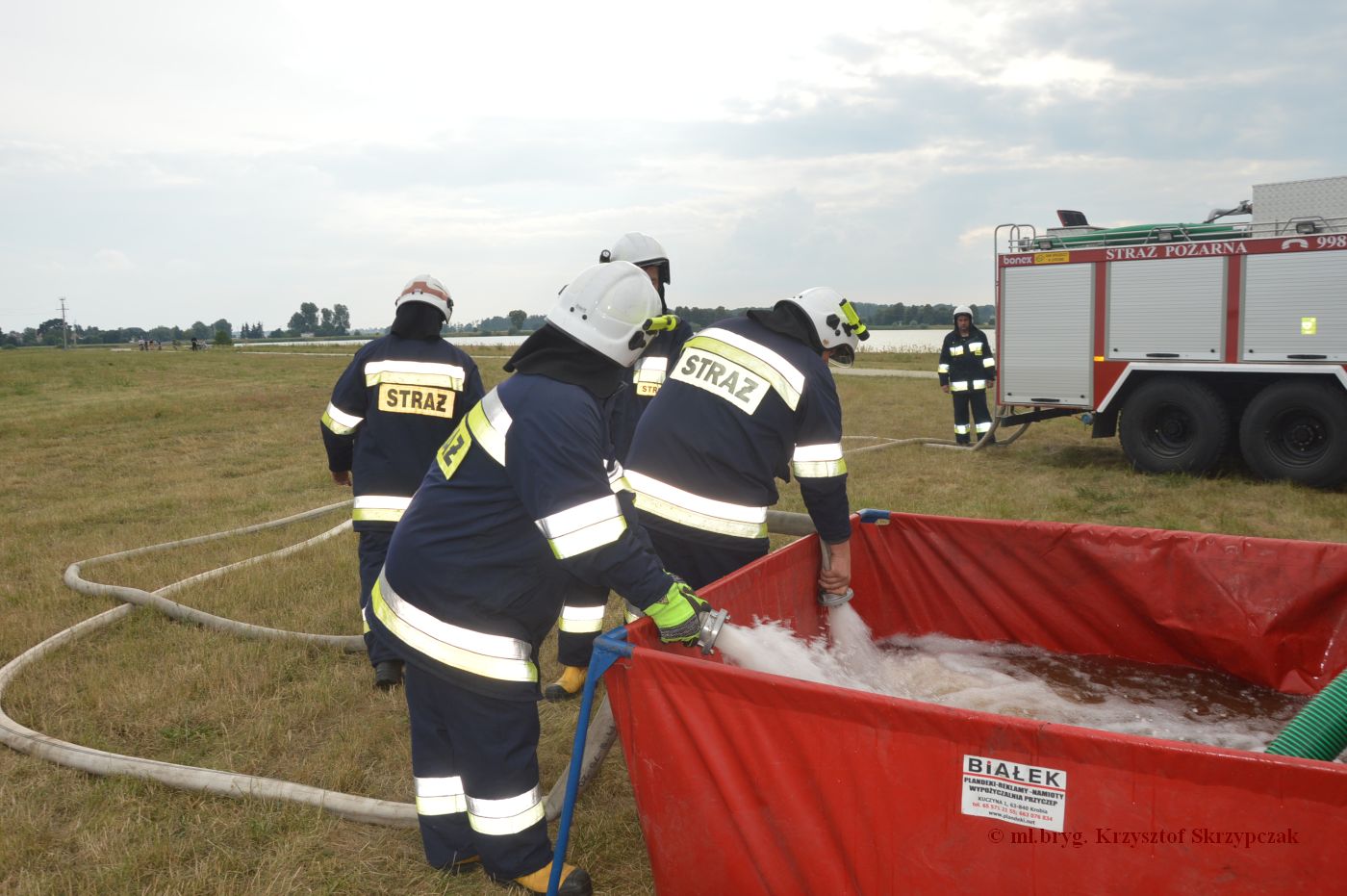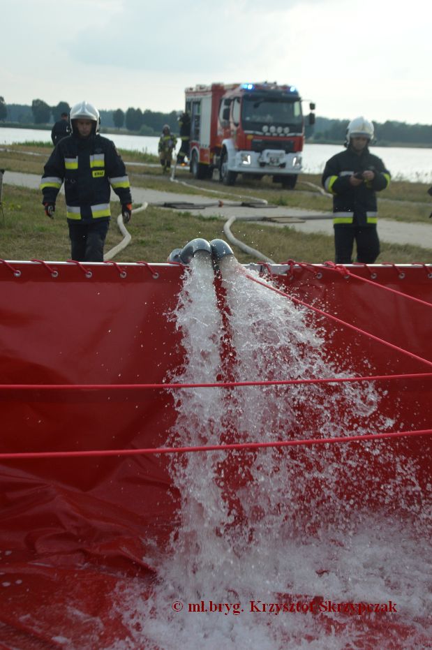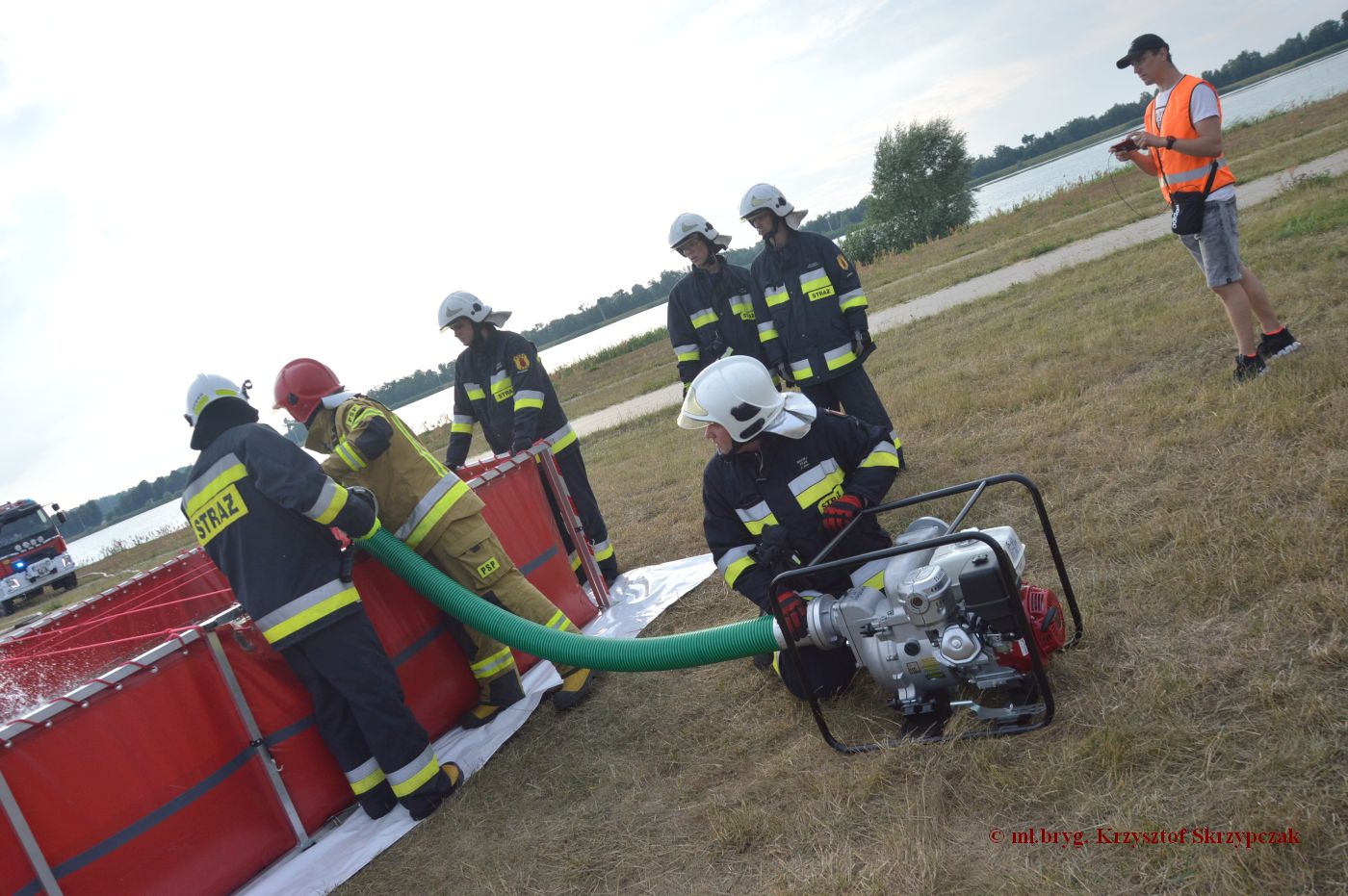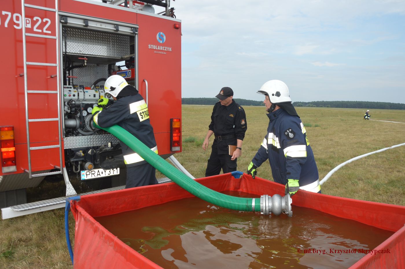 Strażacy ćwiczyli dostarczanie wody na duże odległości. Robili to metodą dowożenia, przepompowywania i przetłaczania. Efektem było 6 skutecznych strumieni wody podanych ze stanowisk gaśniczych znajdujących się 600 metrów od punktu czerpania.