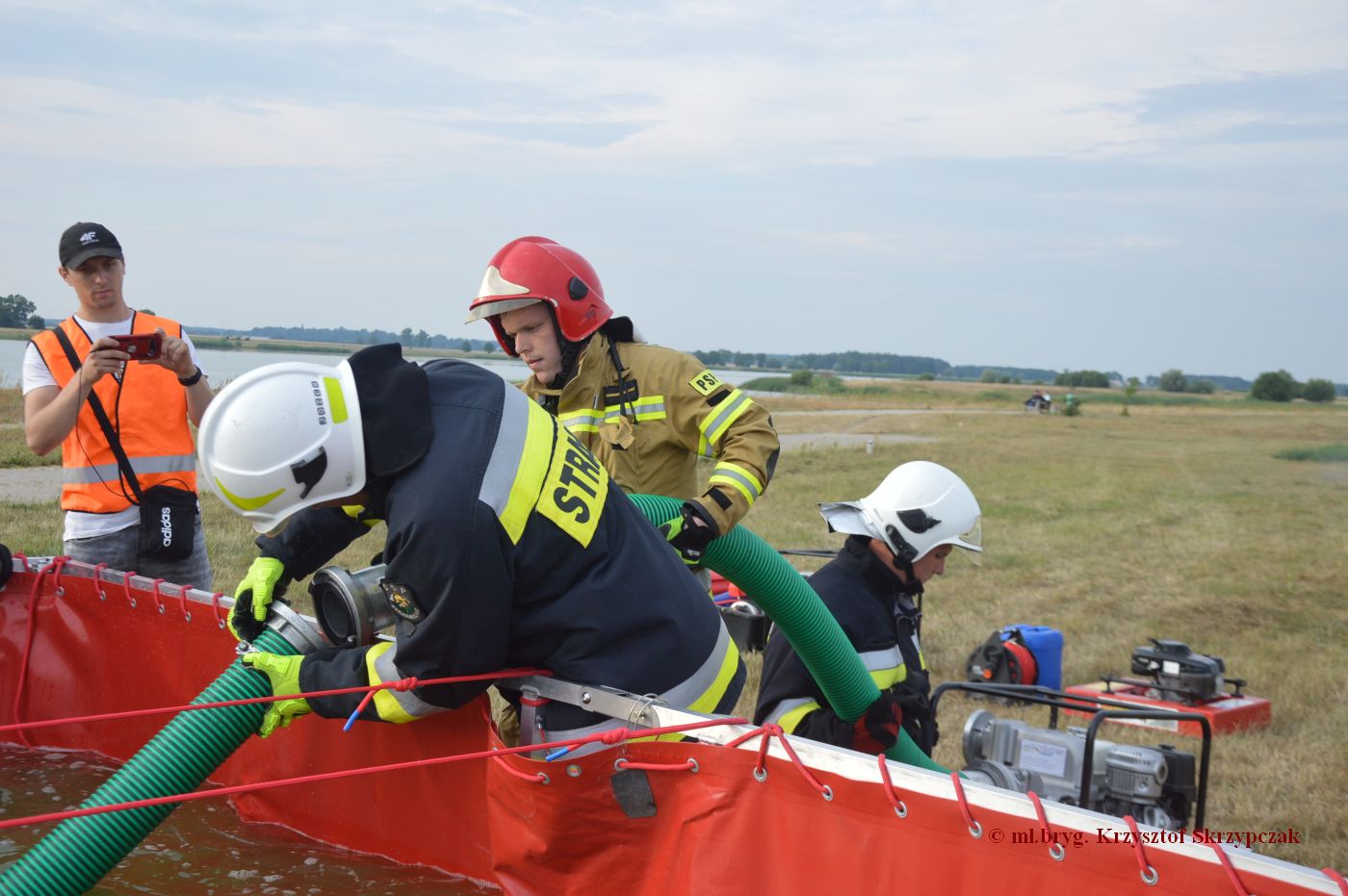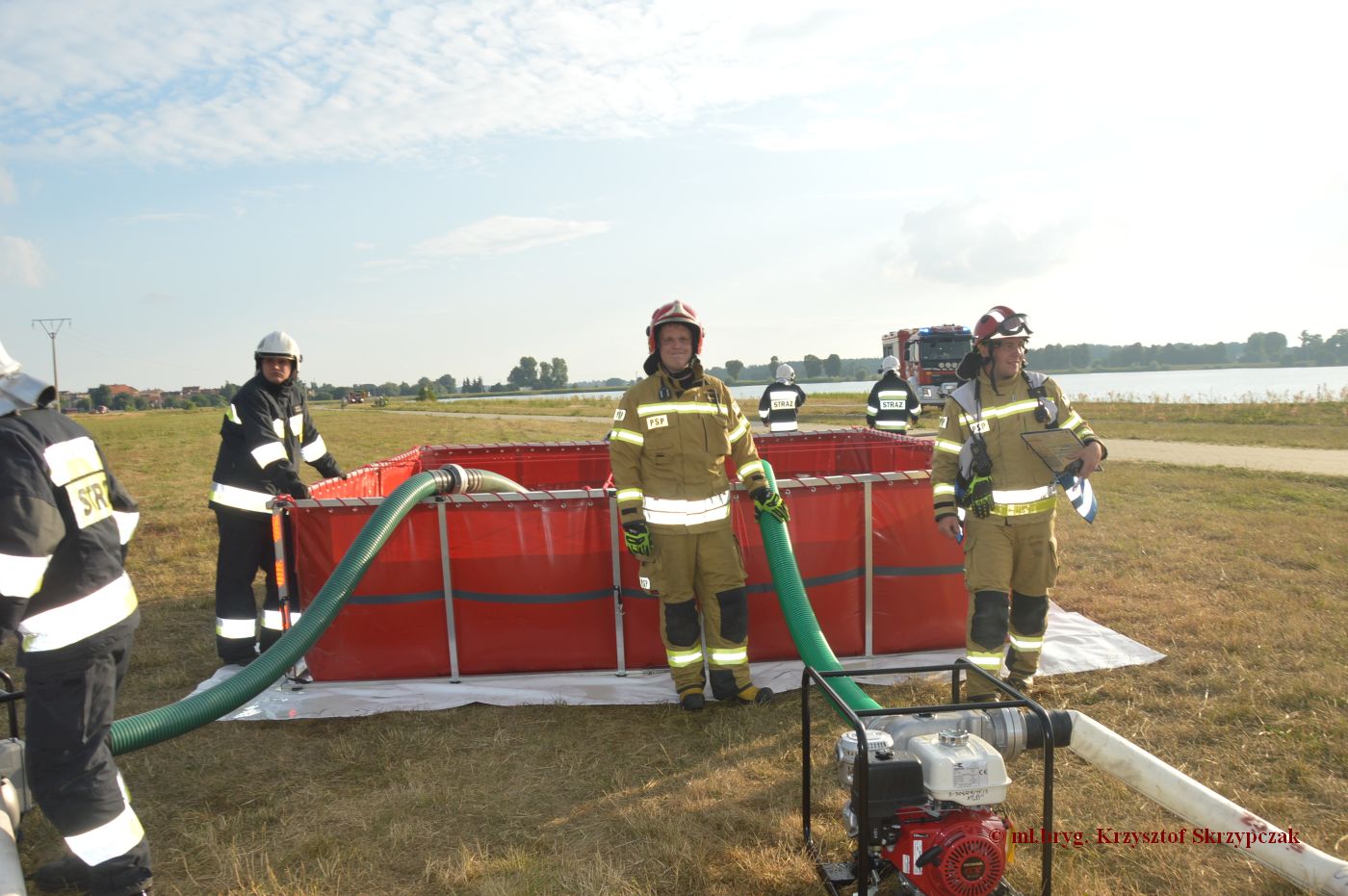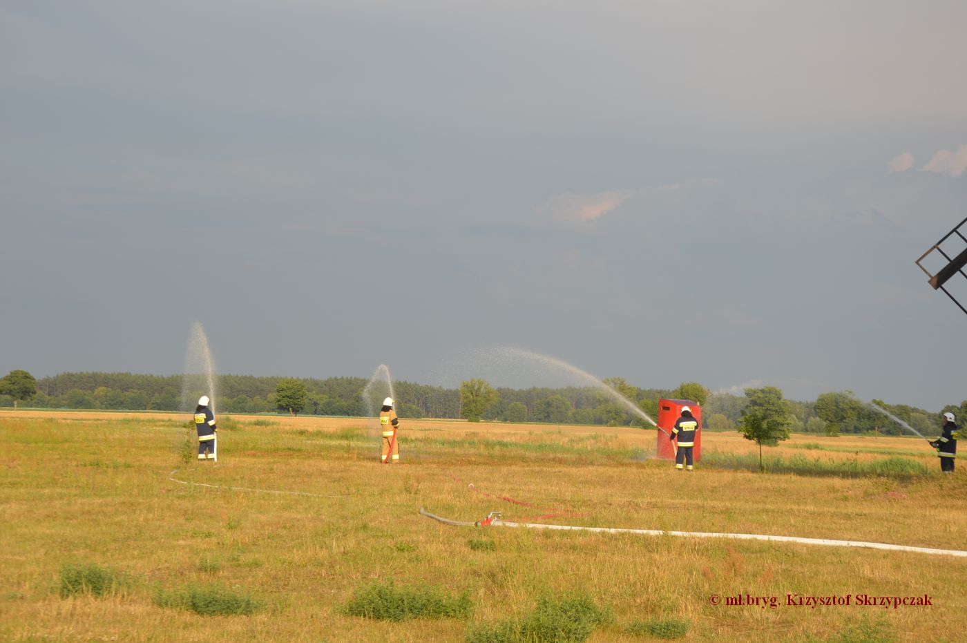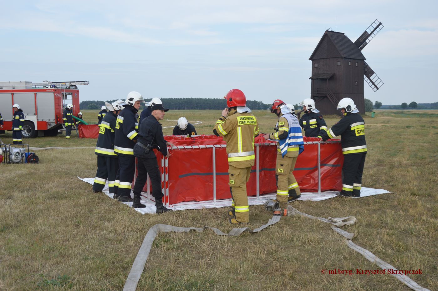 Strażacy ćwiczyli dostarczanie wody na duże odległości. Robili to metodą dowożenia, przepompowywania i przetłaczania. Efektem było 6 skutecznych strumieni wody podanych ze stanowisk gaśniczych znajdujących się 600 metrów od punktu czerpania.