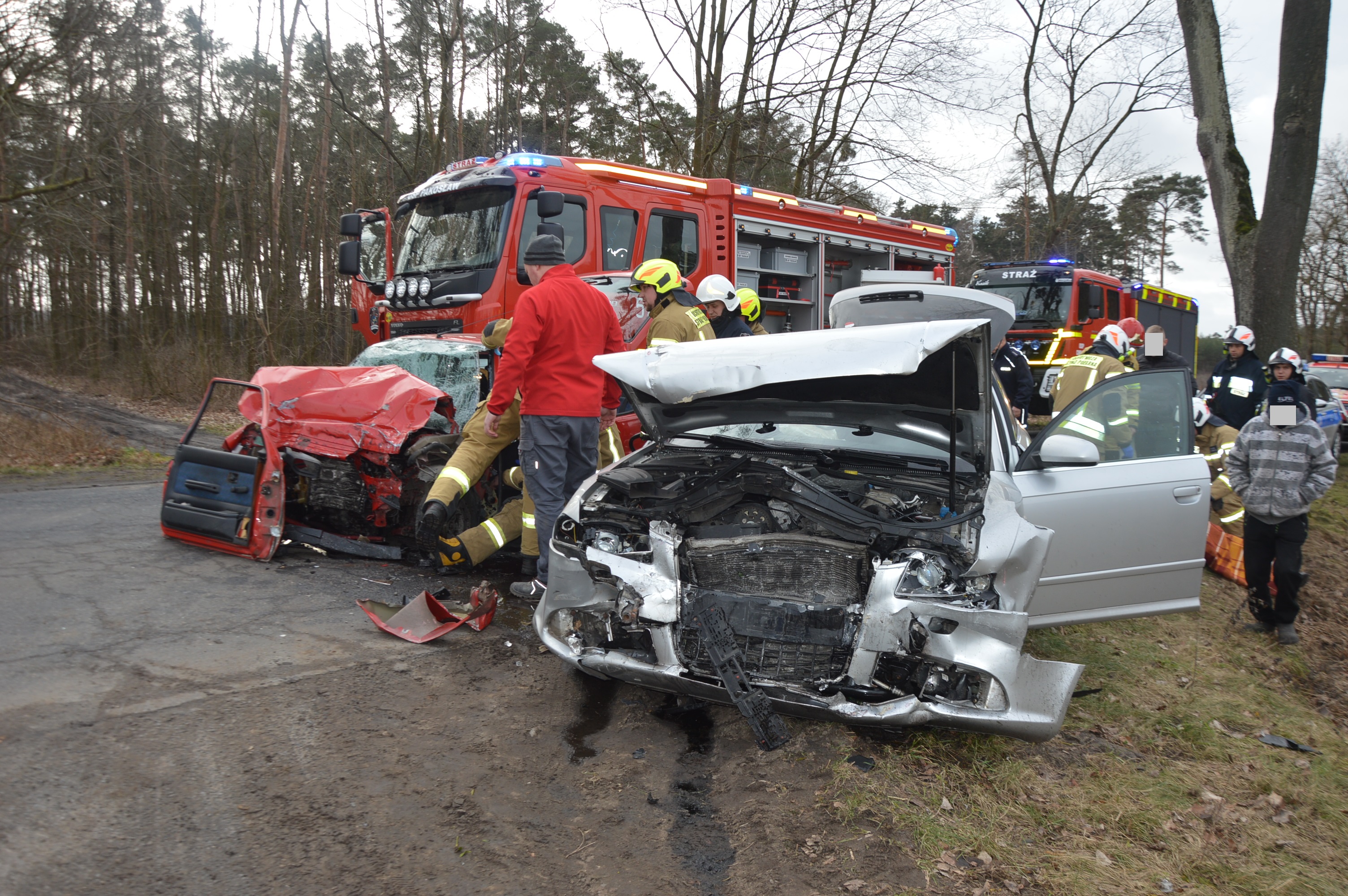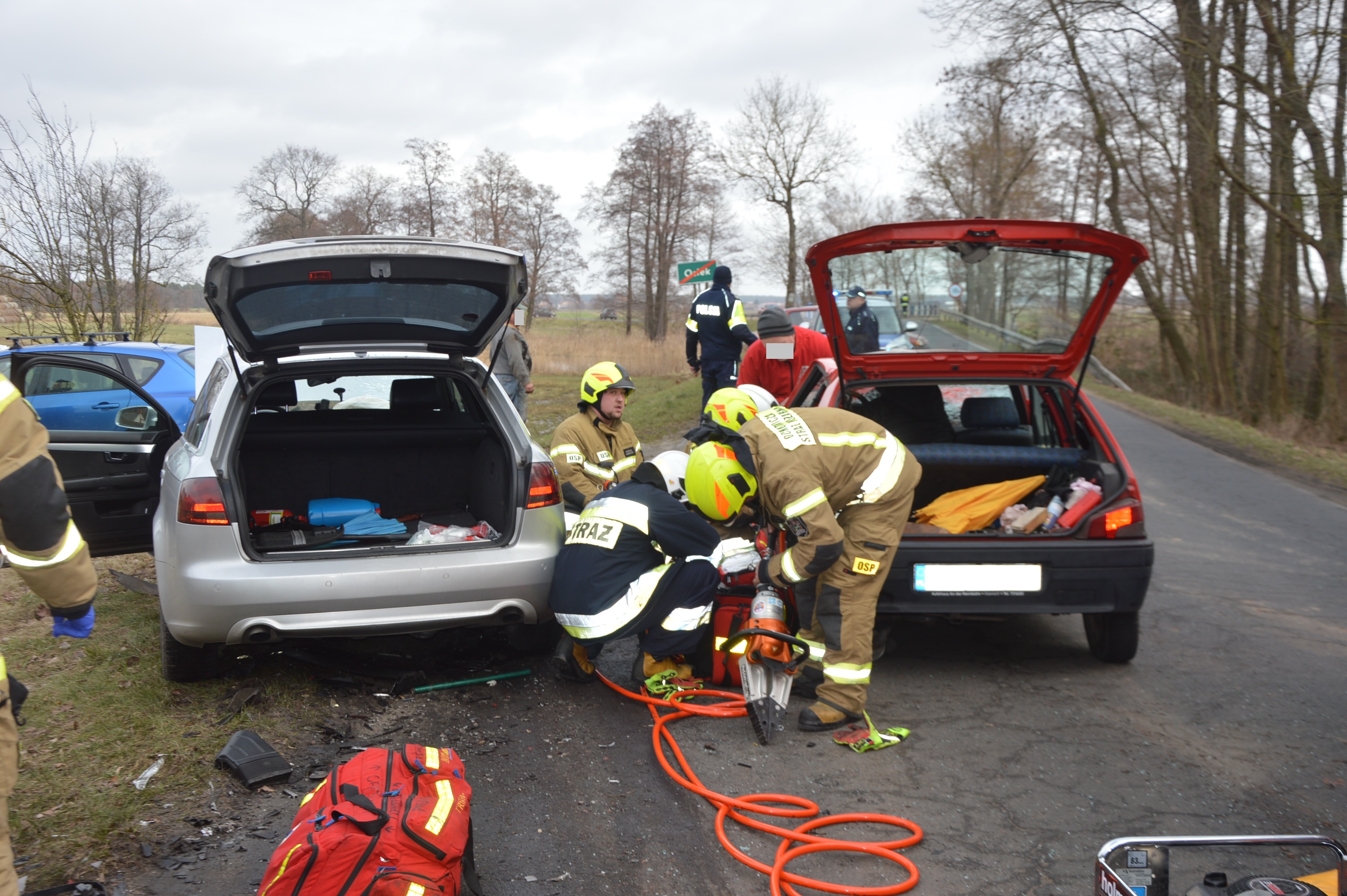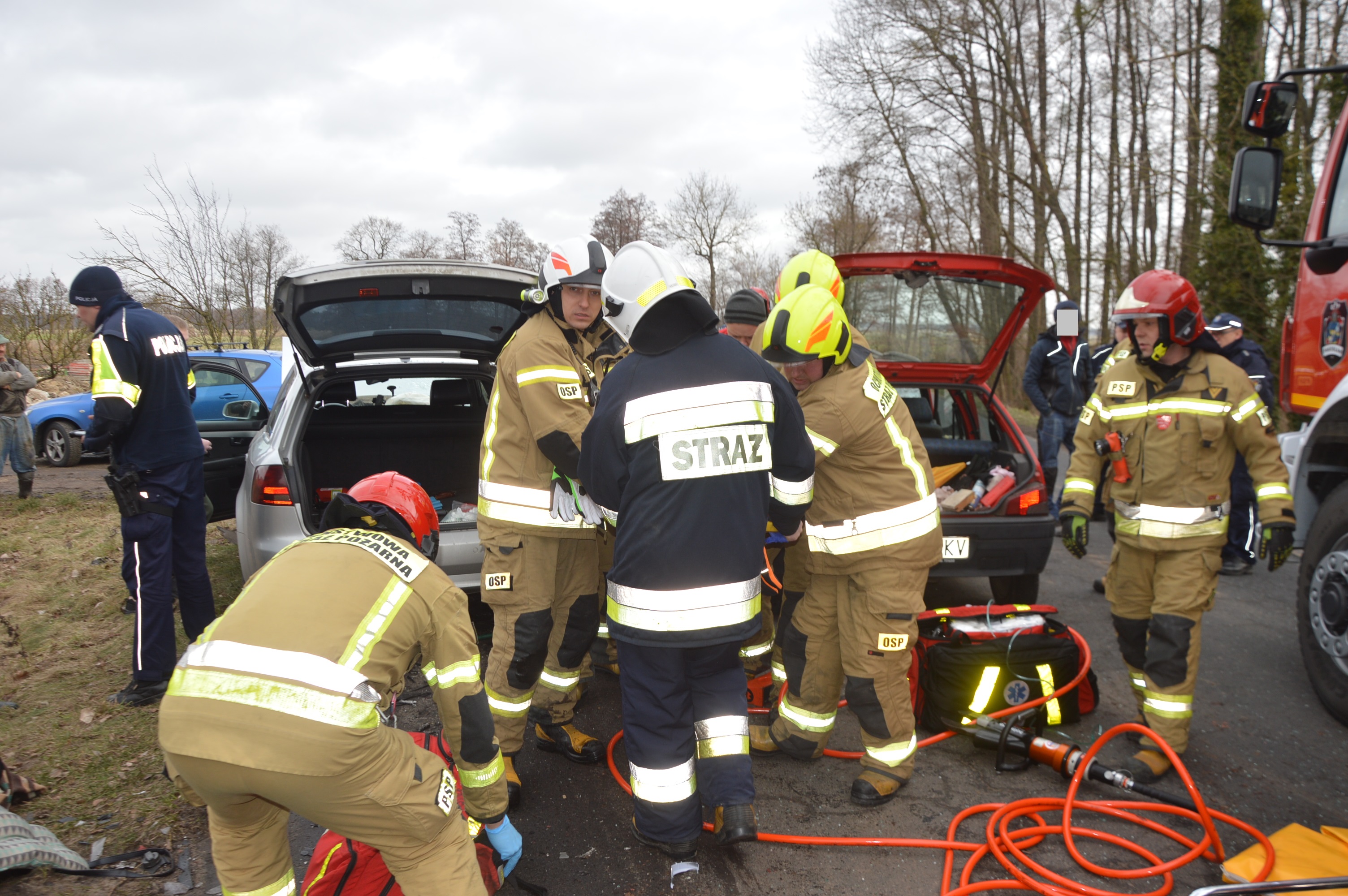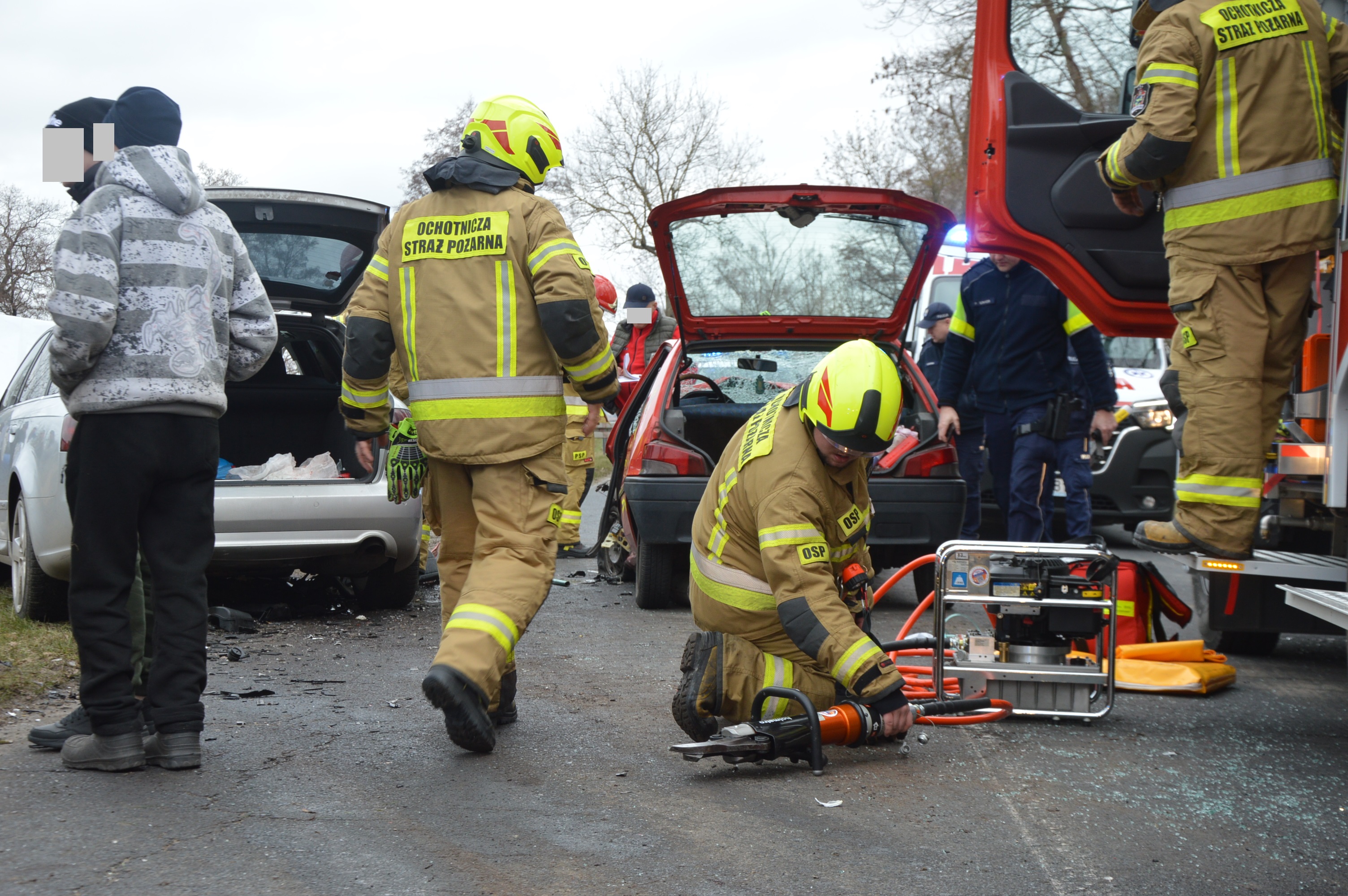 Dwie osoby, w tym kobieta w ciąży zostały poszkodowane w wyniku czołowego zderzenia samochodów osobowych. W celu wykonania dostępu do rannego kierowcy, pozostającego wewnątrz auta konieczne było użycie specjalistycznych narzędzi hydraulicznych.