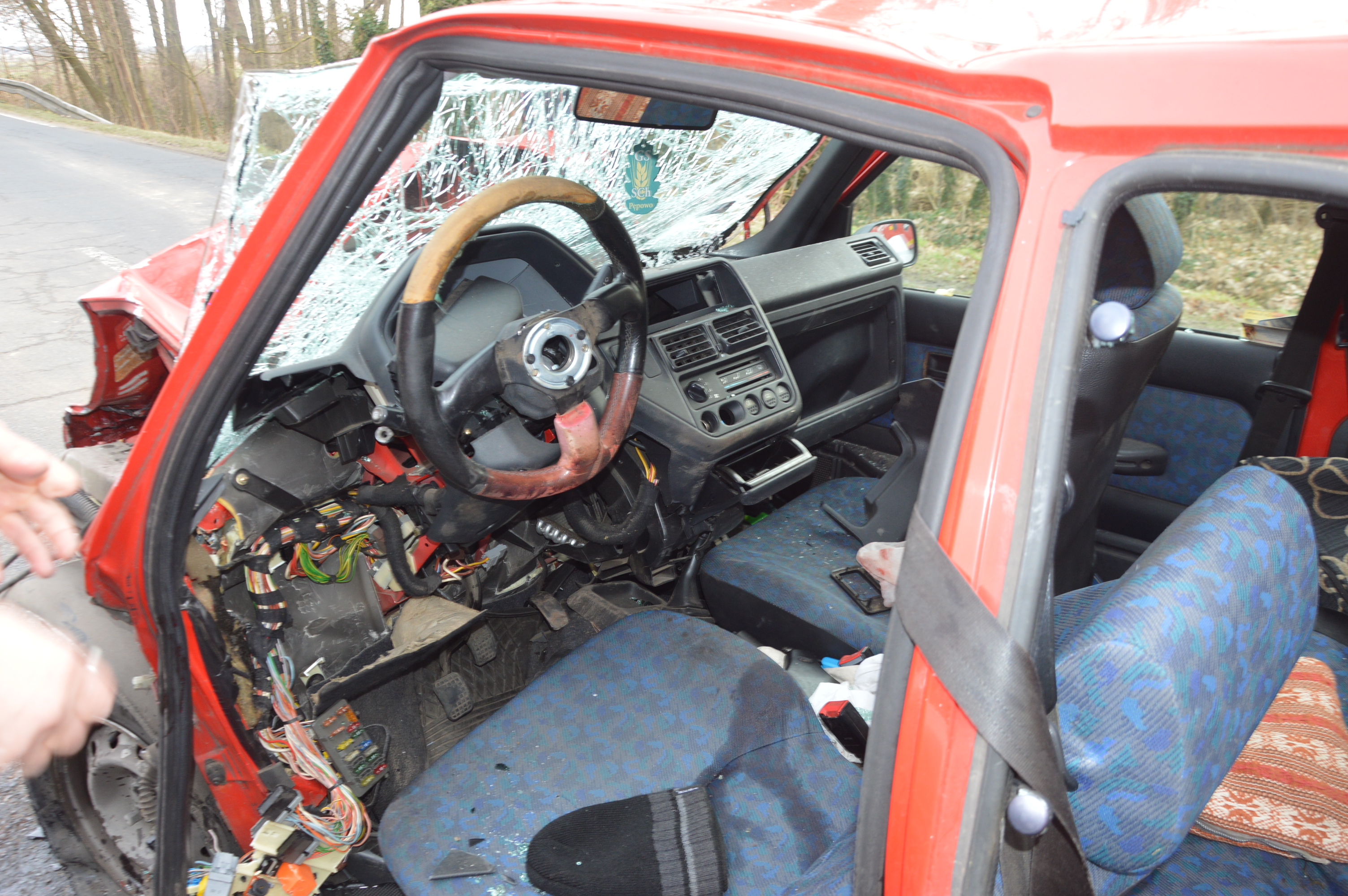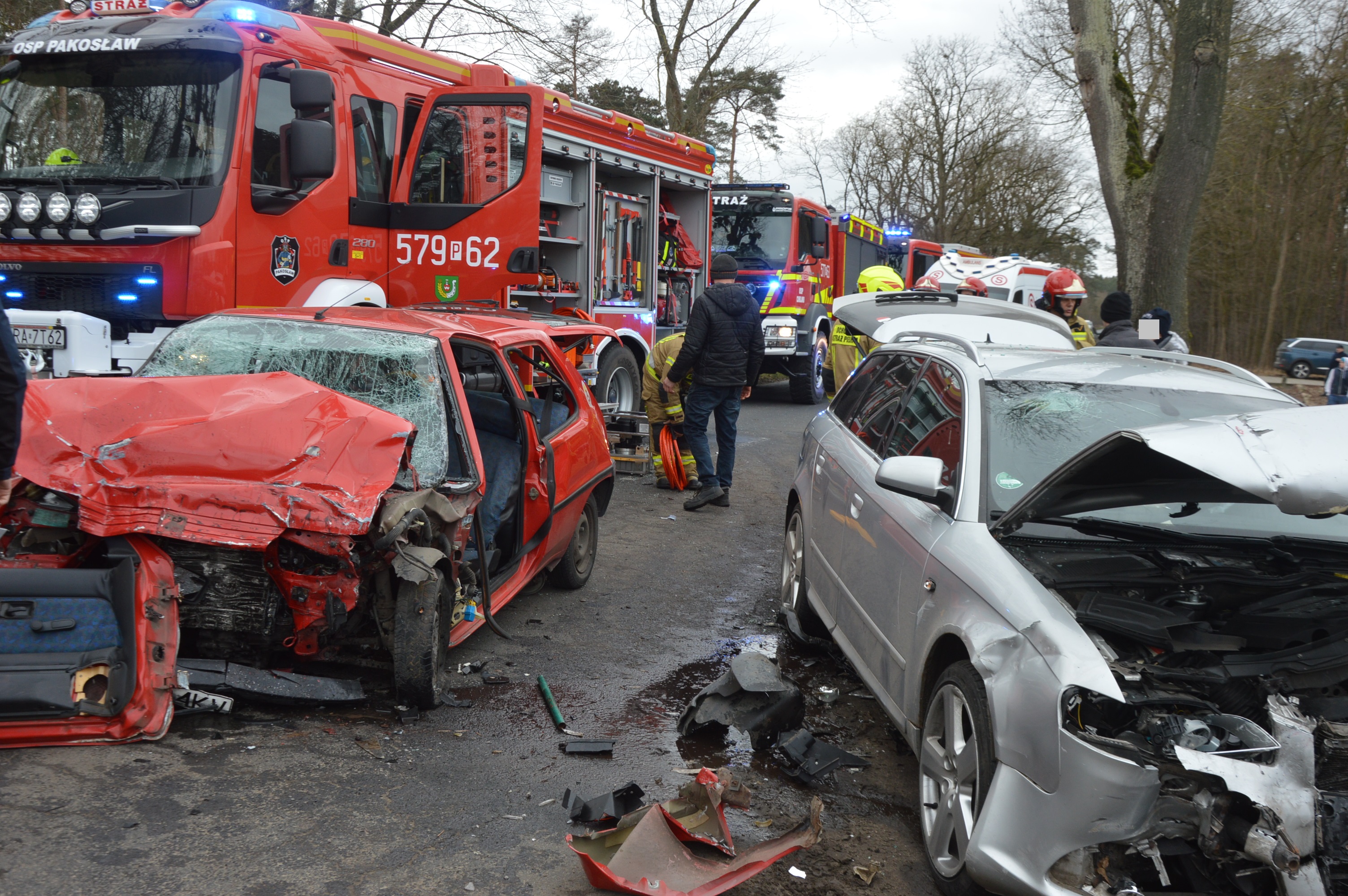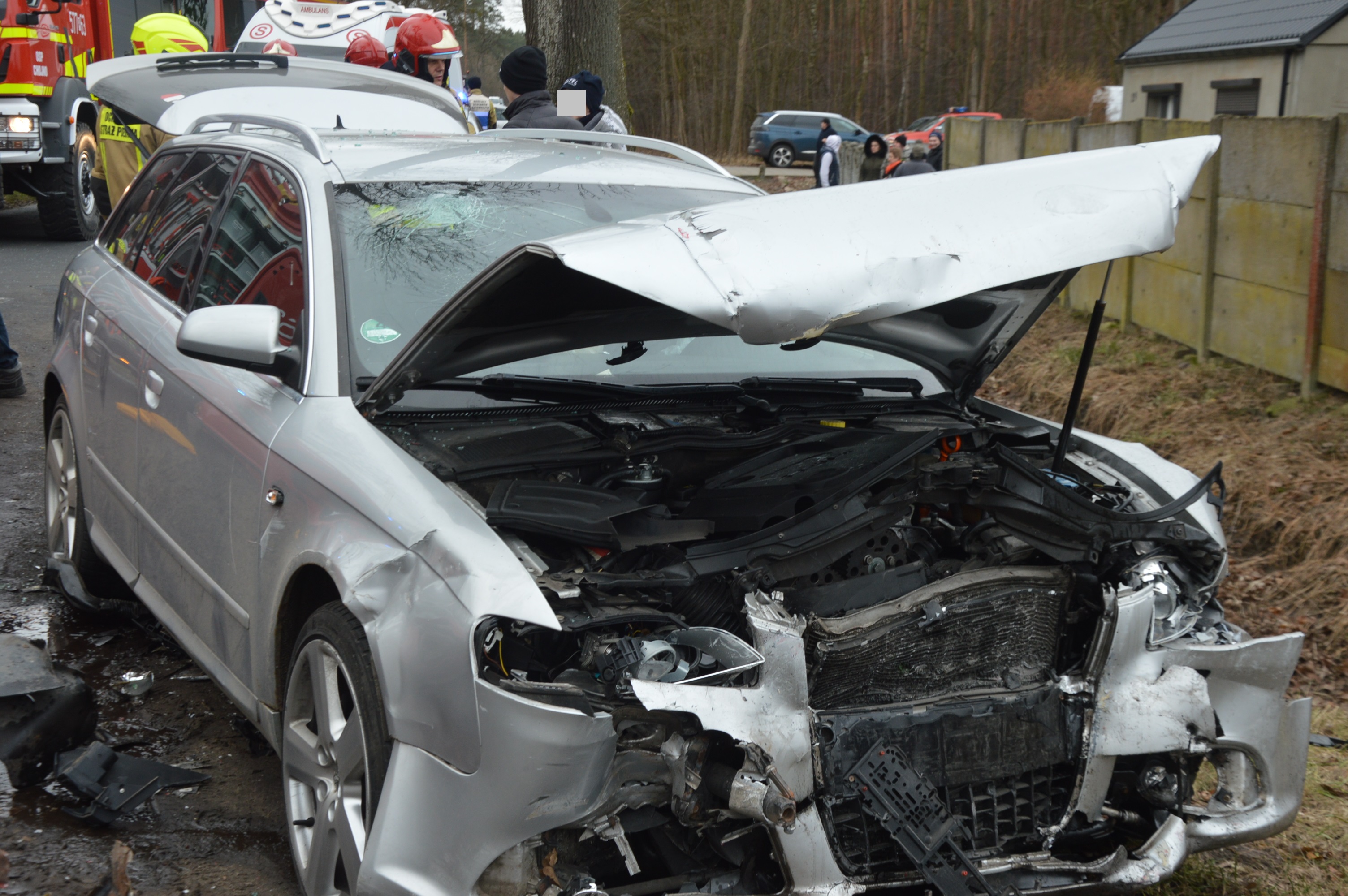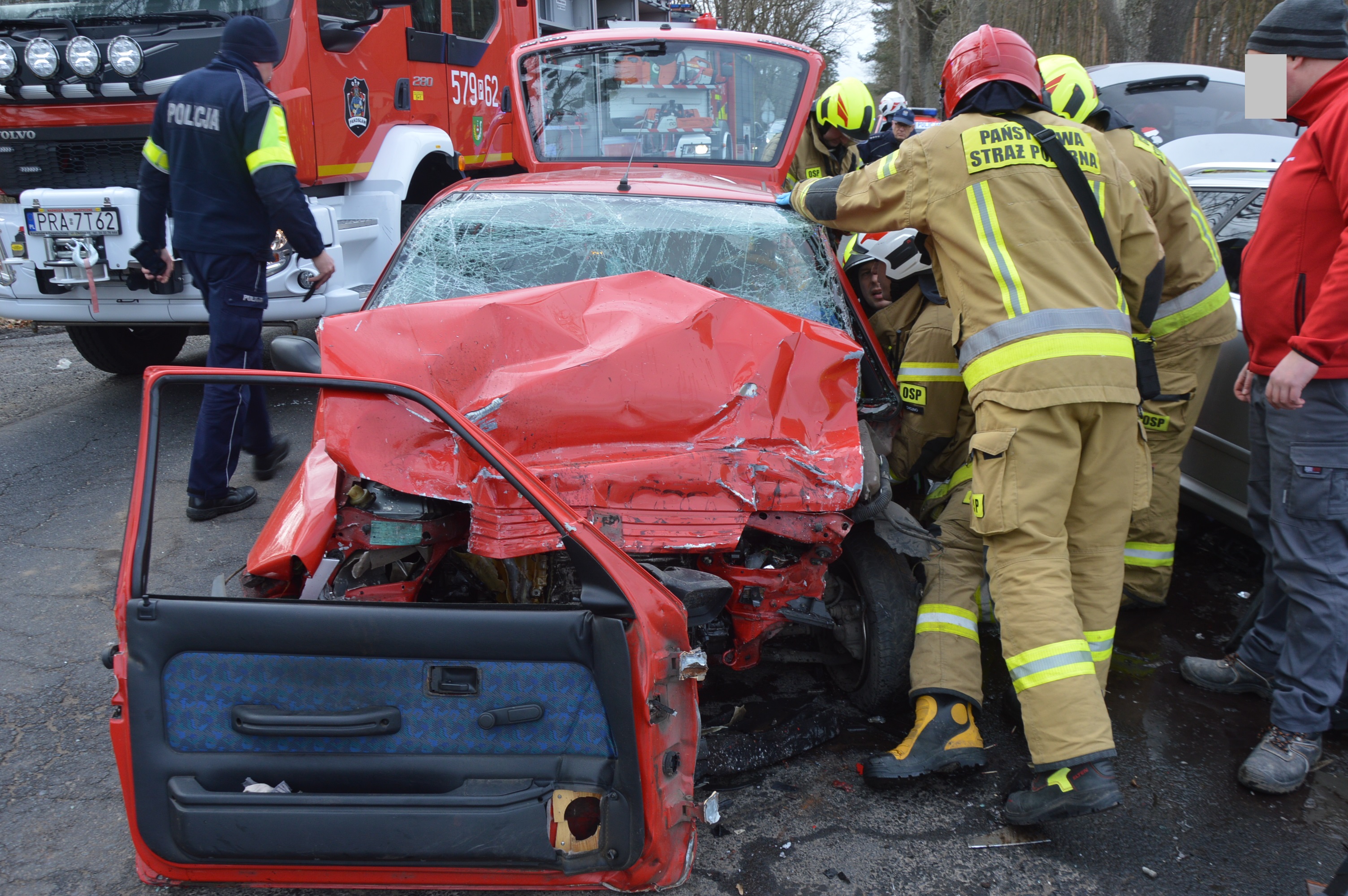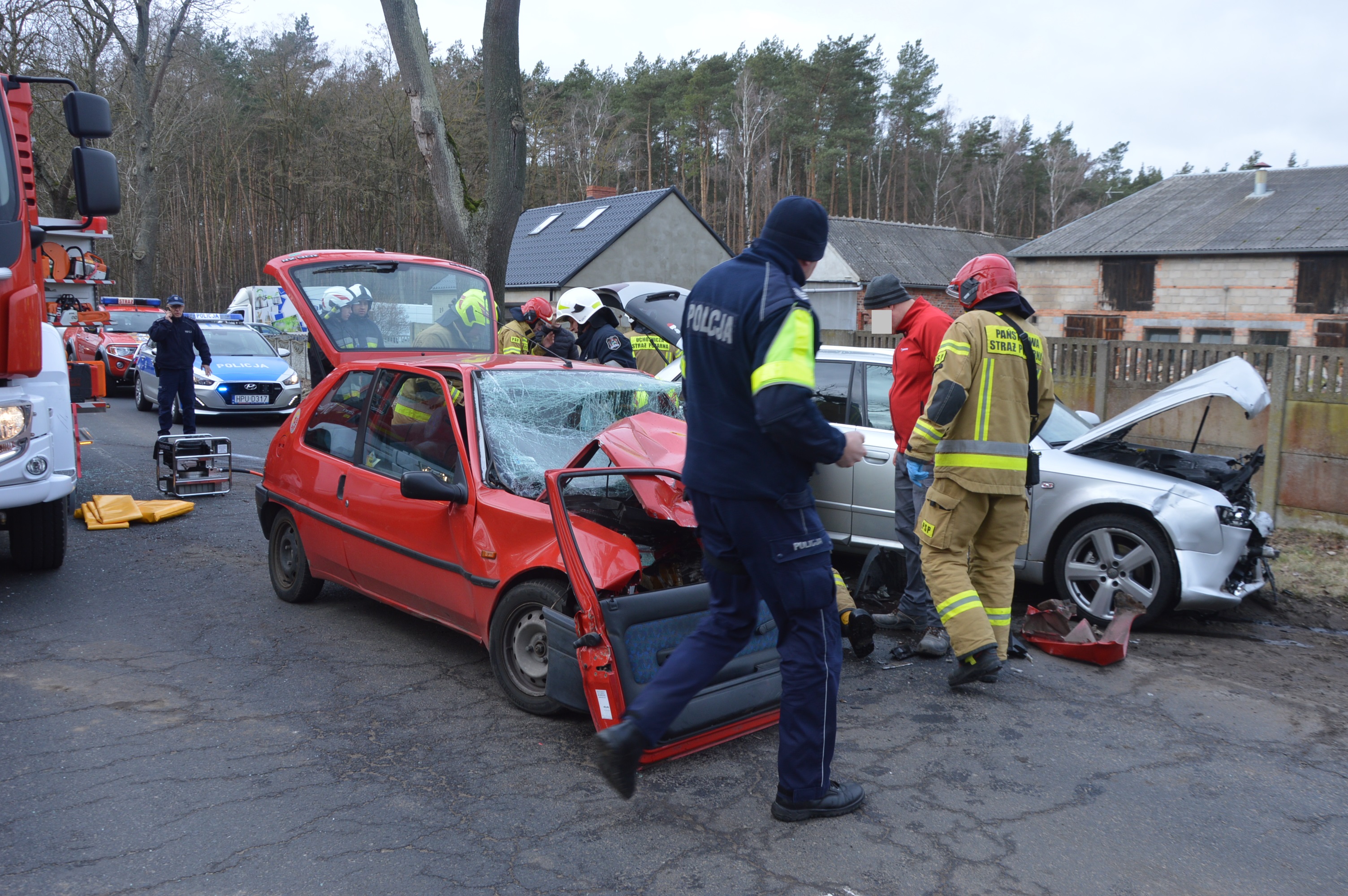 Dwie osoby, w tym kobieta w ciąży zostały poszkodowane w wyniku czołowego zderzenia samochodów osobowych. W celu wykonania dostępu do rannego kierowcy, pozostającego wewnątrz auta konieczne było użycie specjalistycznych narzędzi hydraulicznych.