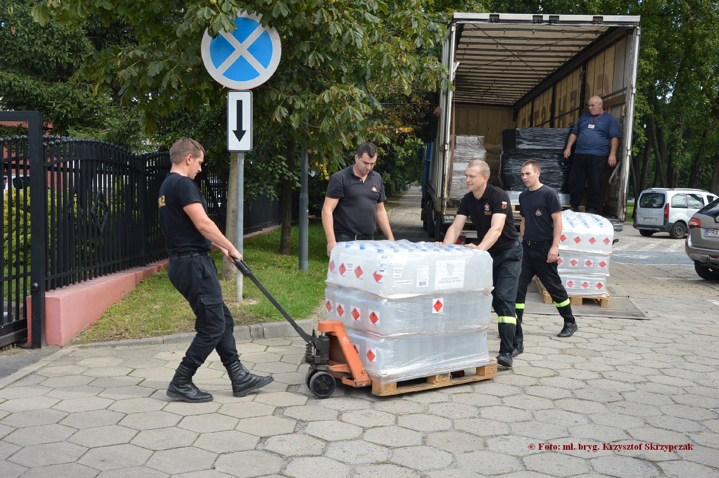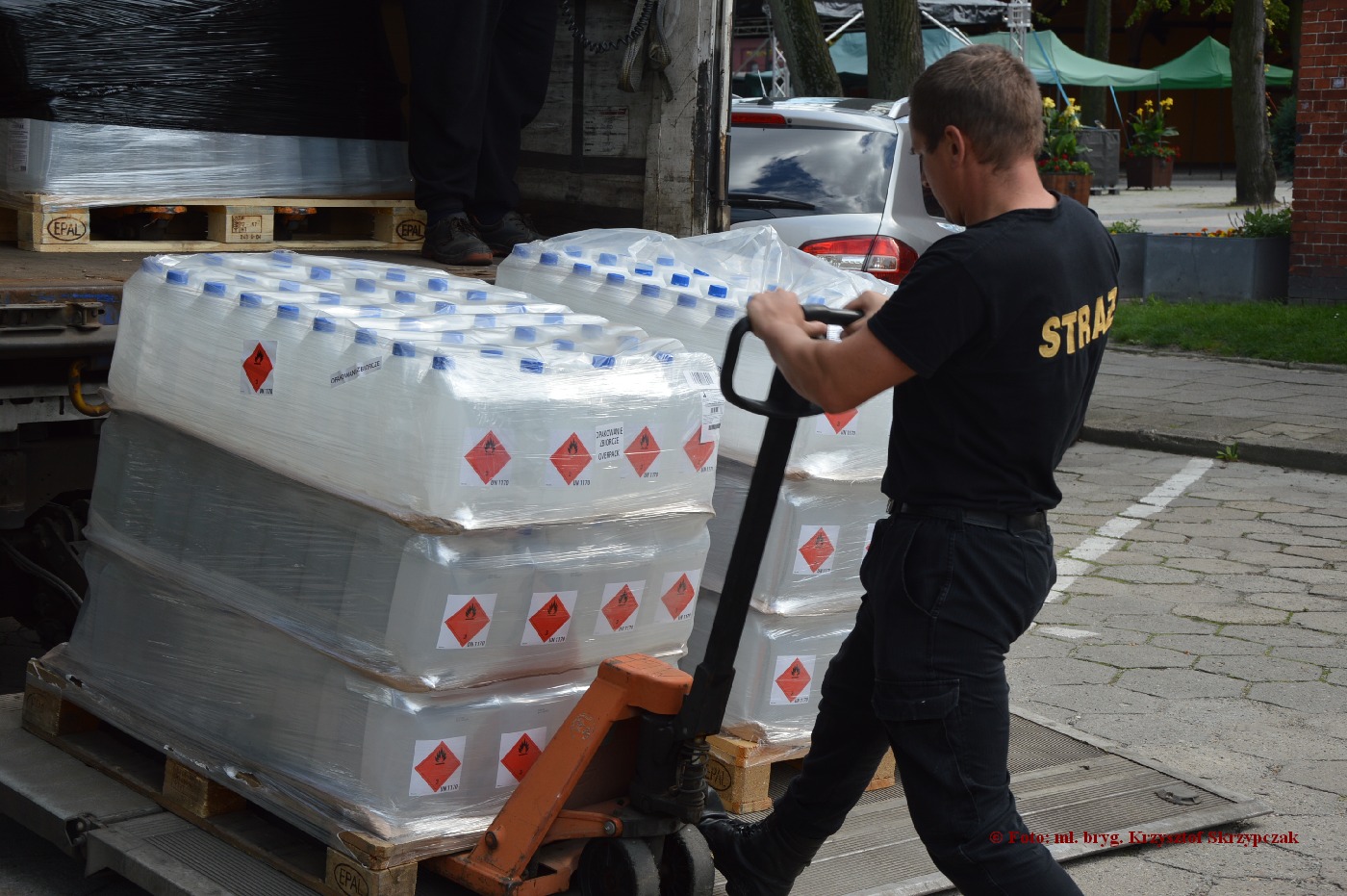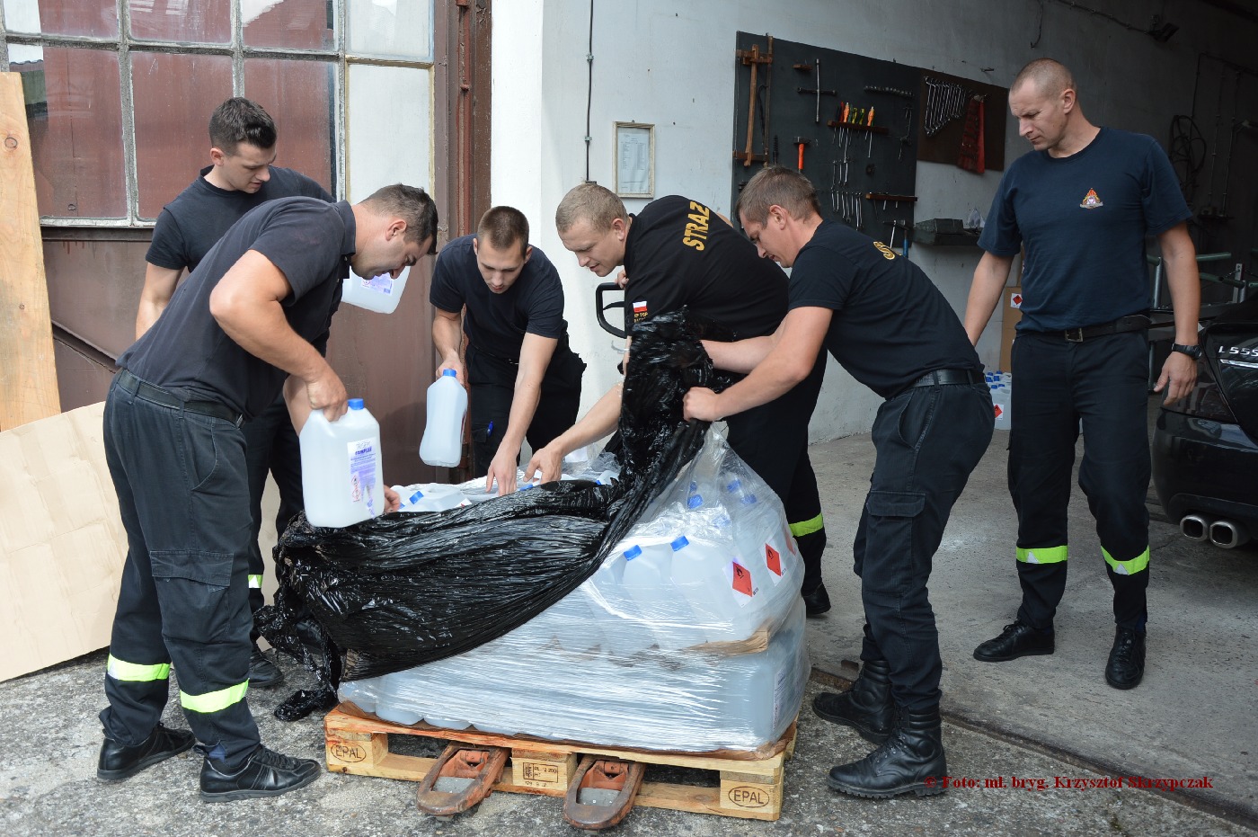 Strażacy rozładowali transport 3720 l płynu do dezynfekcji higienicznej i chirurgicznej rąk, powierzchni oraz urządzeń. Chwilowo będzie on zmagazynowany w pomieszczeniu komendy, a w najbliższym czasie zostanie rozdysponowany do 22 przedszkoli. Oczekujemy jeszcze na odbiór 9300 maseczek ochronnych.